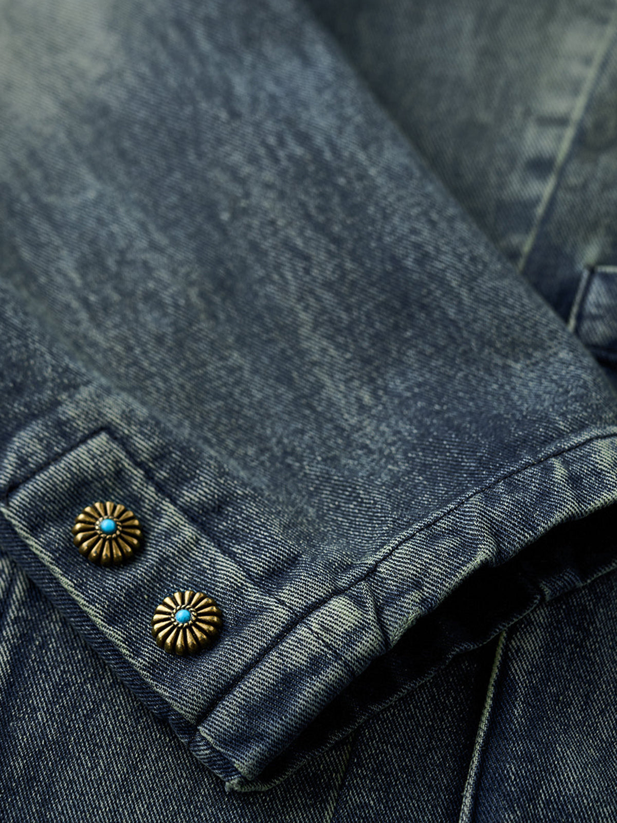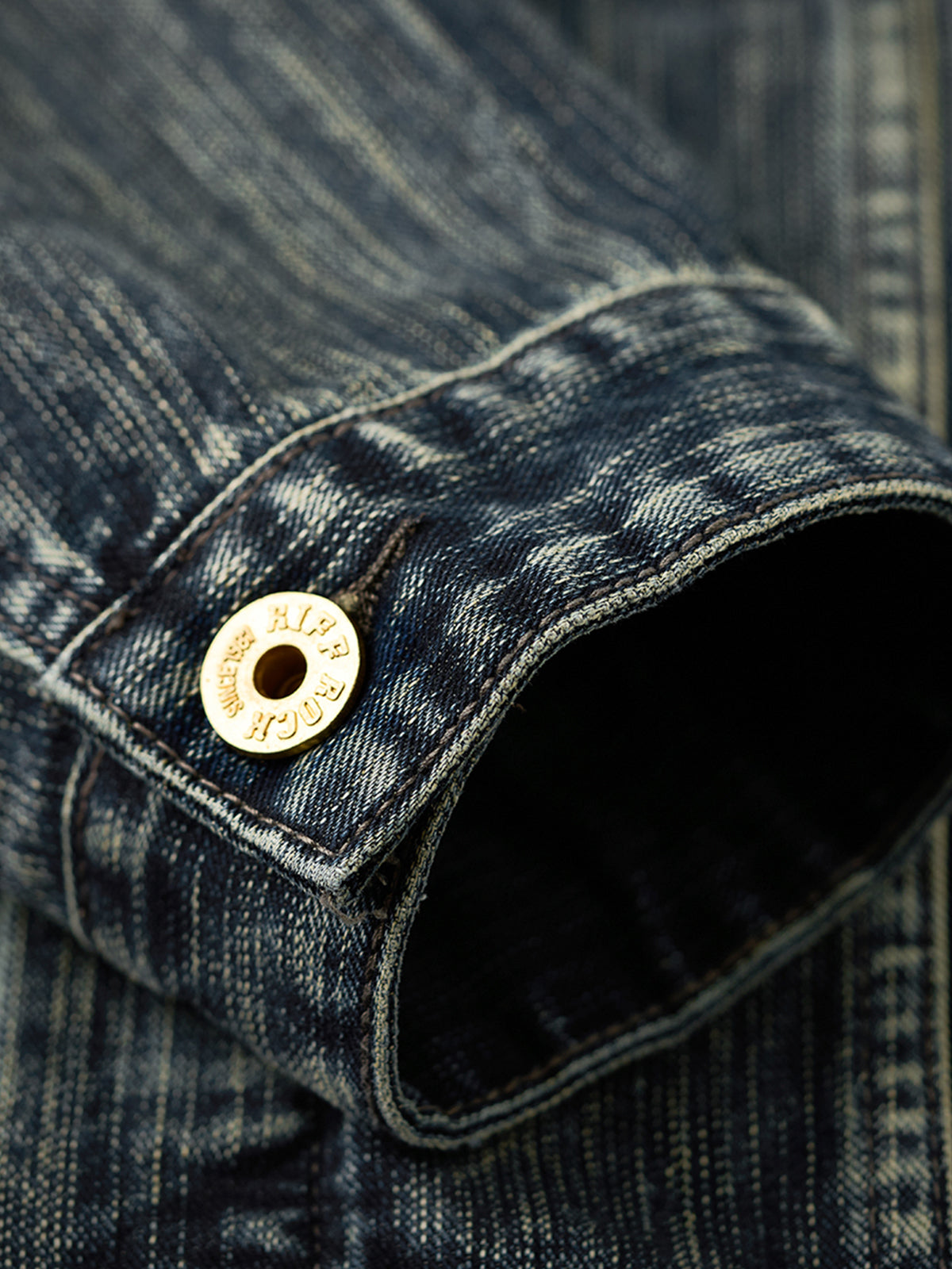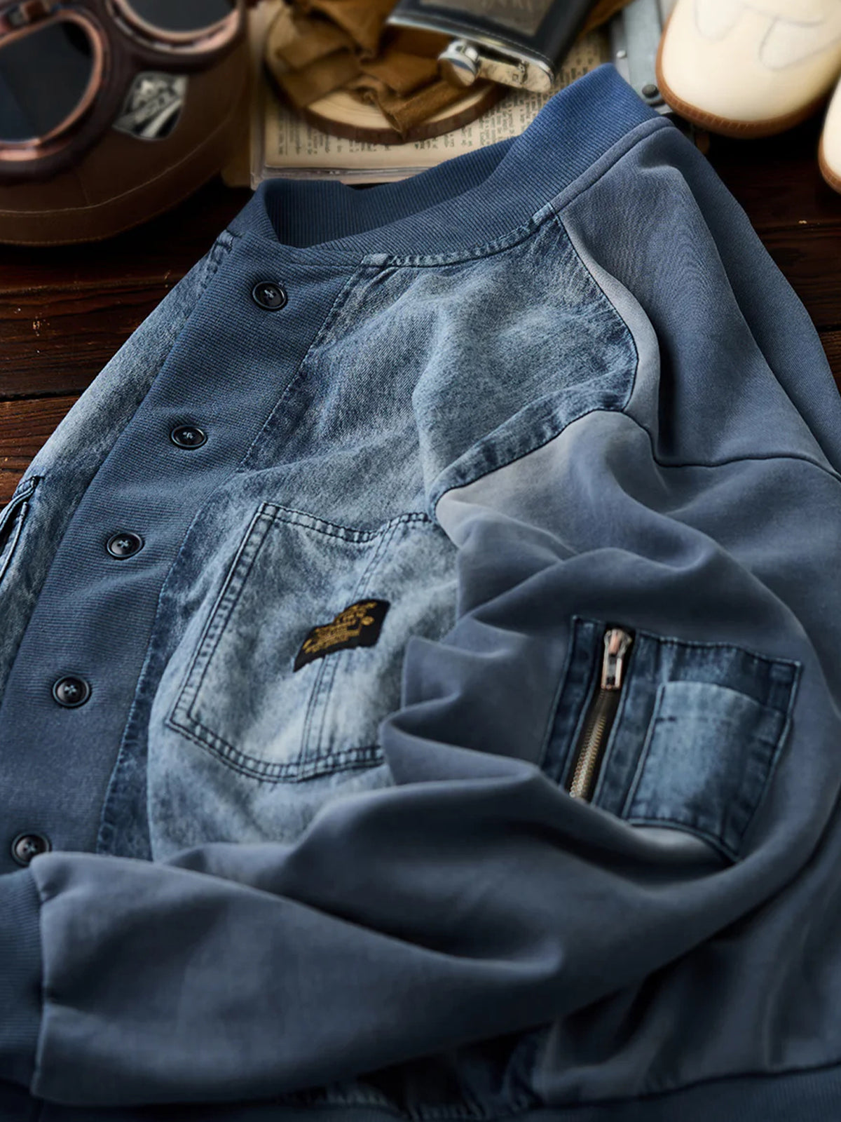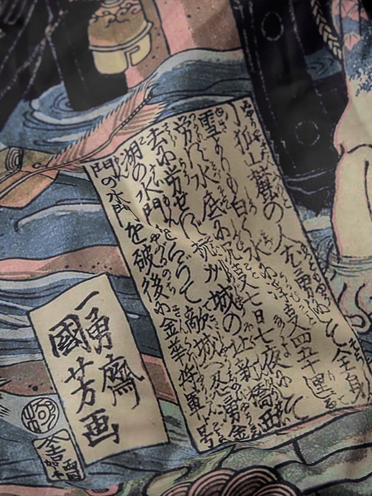 Ukiyoe Print & 3D Embroidery Baseball Collar Denim Shirt