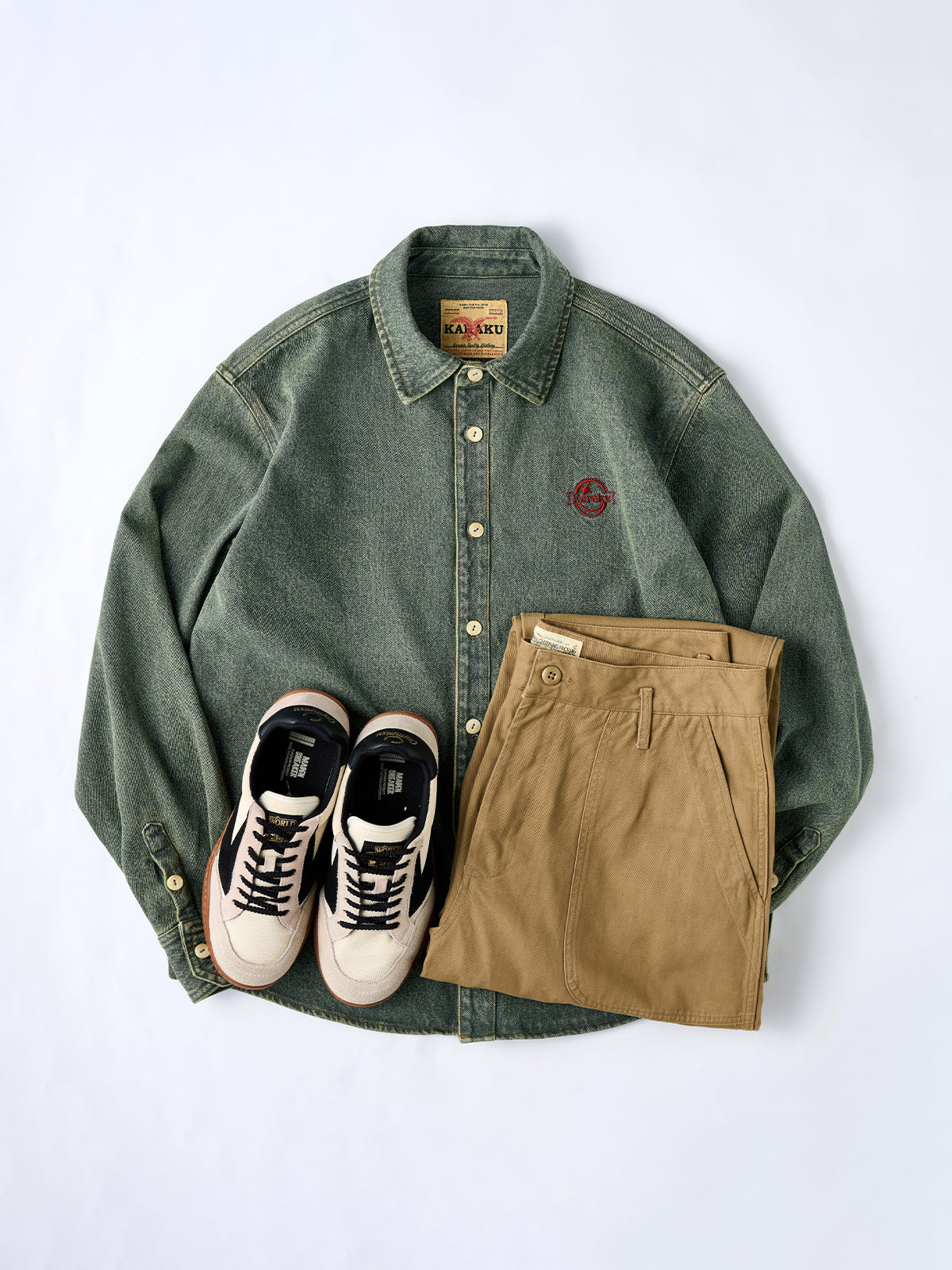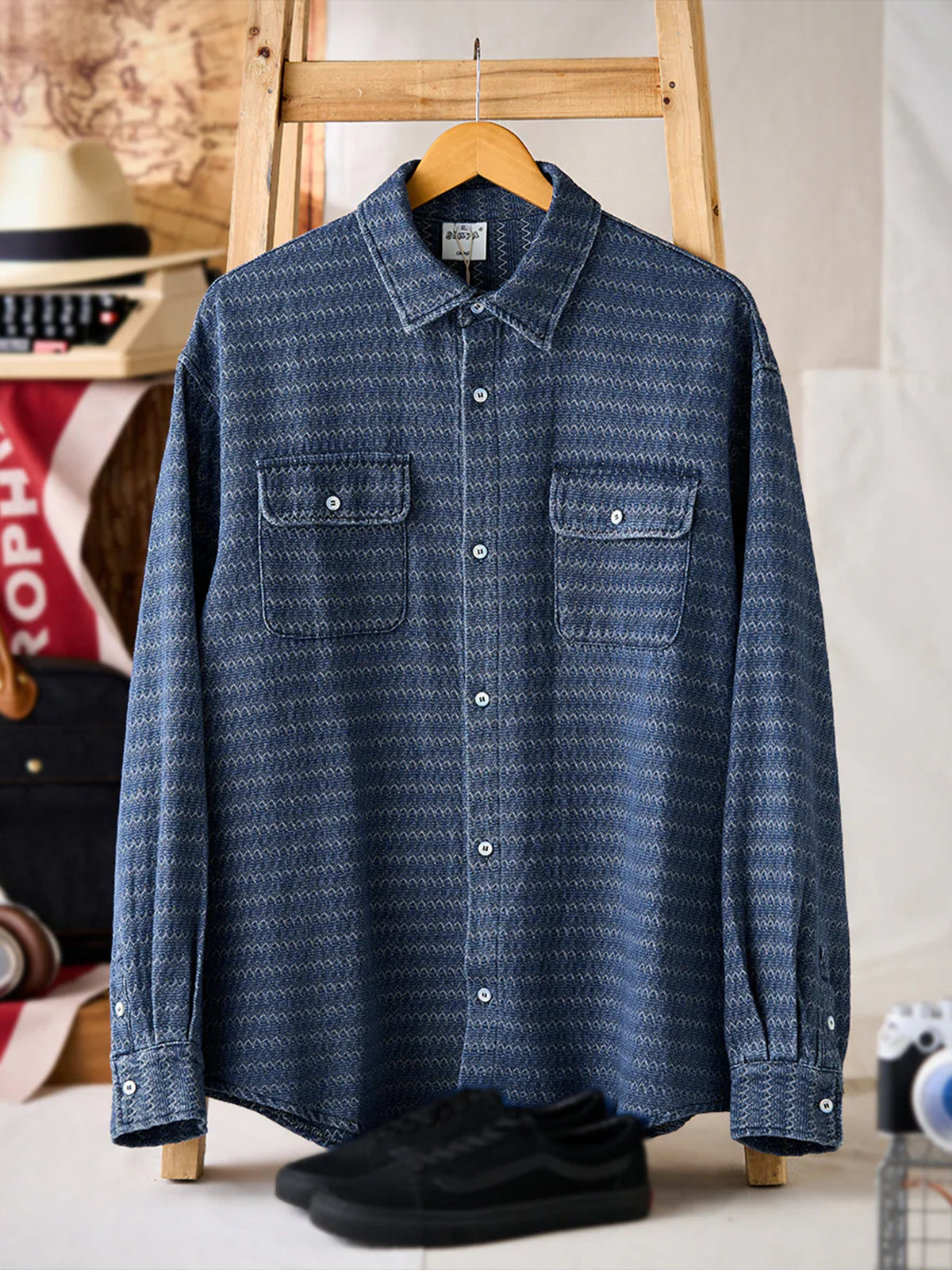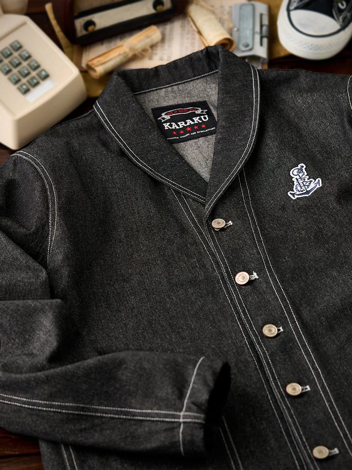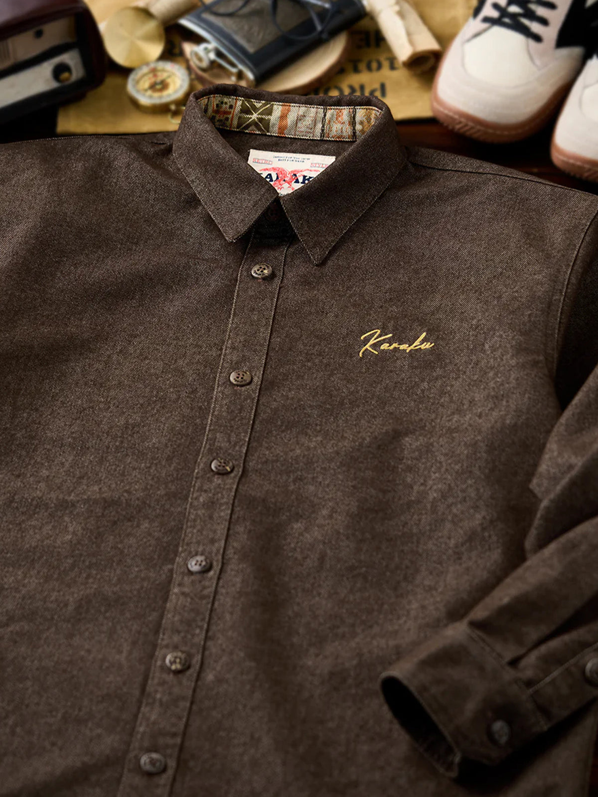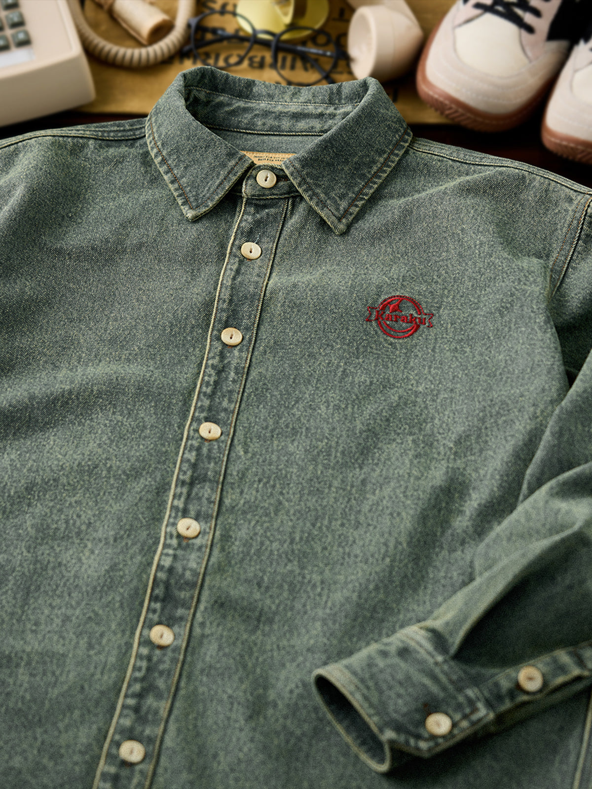 Custom Pearl-Style Buttons Yarn-Dyed Work Shirt with “Karaku” Embroidery