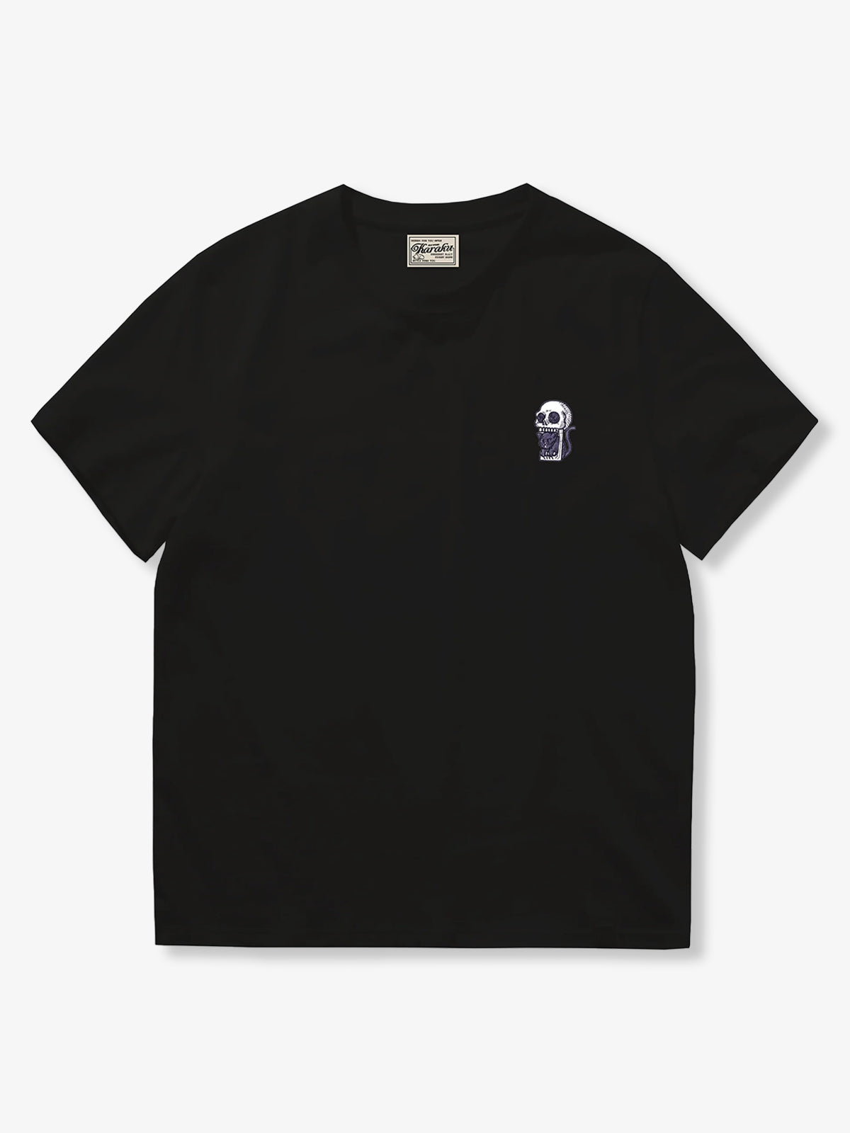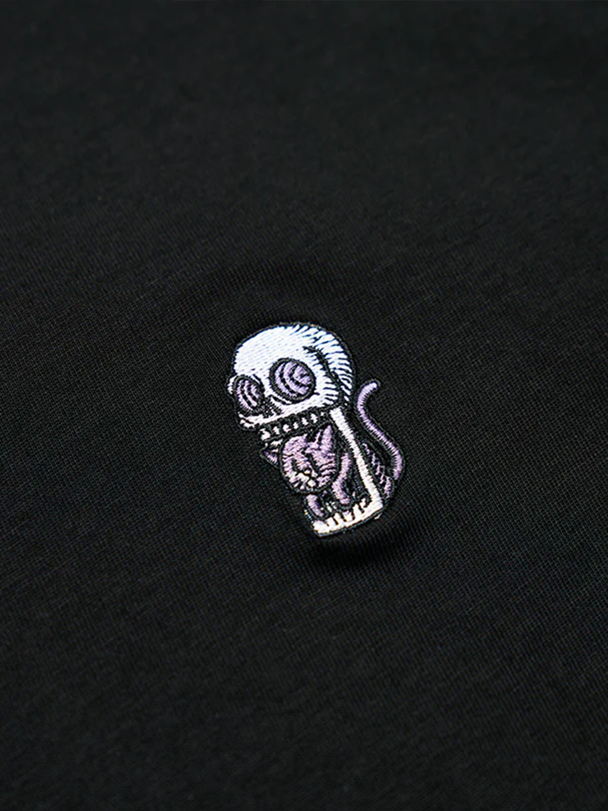 On the left chest, there is an embroidered design of a mischievous cat playing with a skull. The design expresses a playful scene where the cat is interacting with the skull, with details such as a curled tail or the cat mid-jump, giving a lively impression. The embroidery is finely and carefully crafted, providing a sense of depth and delicacy.