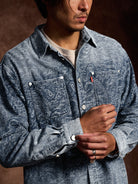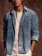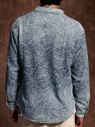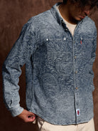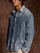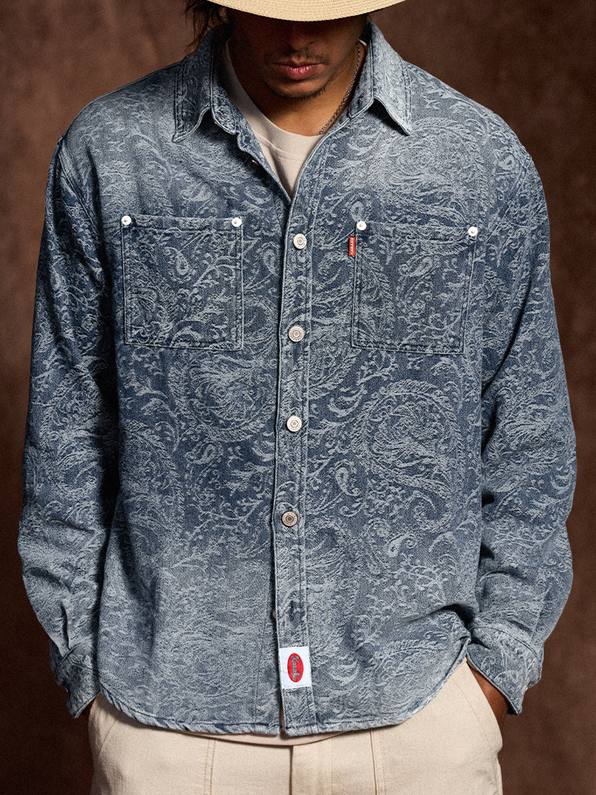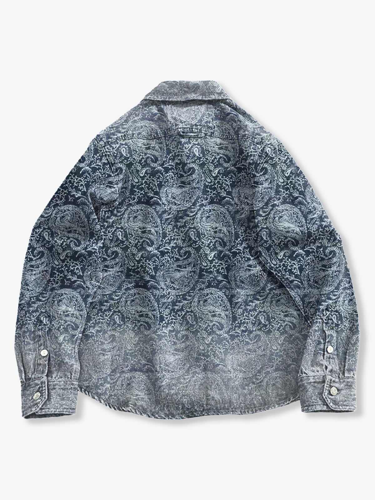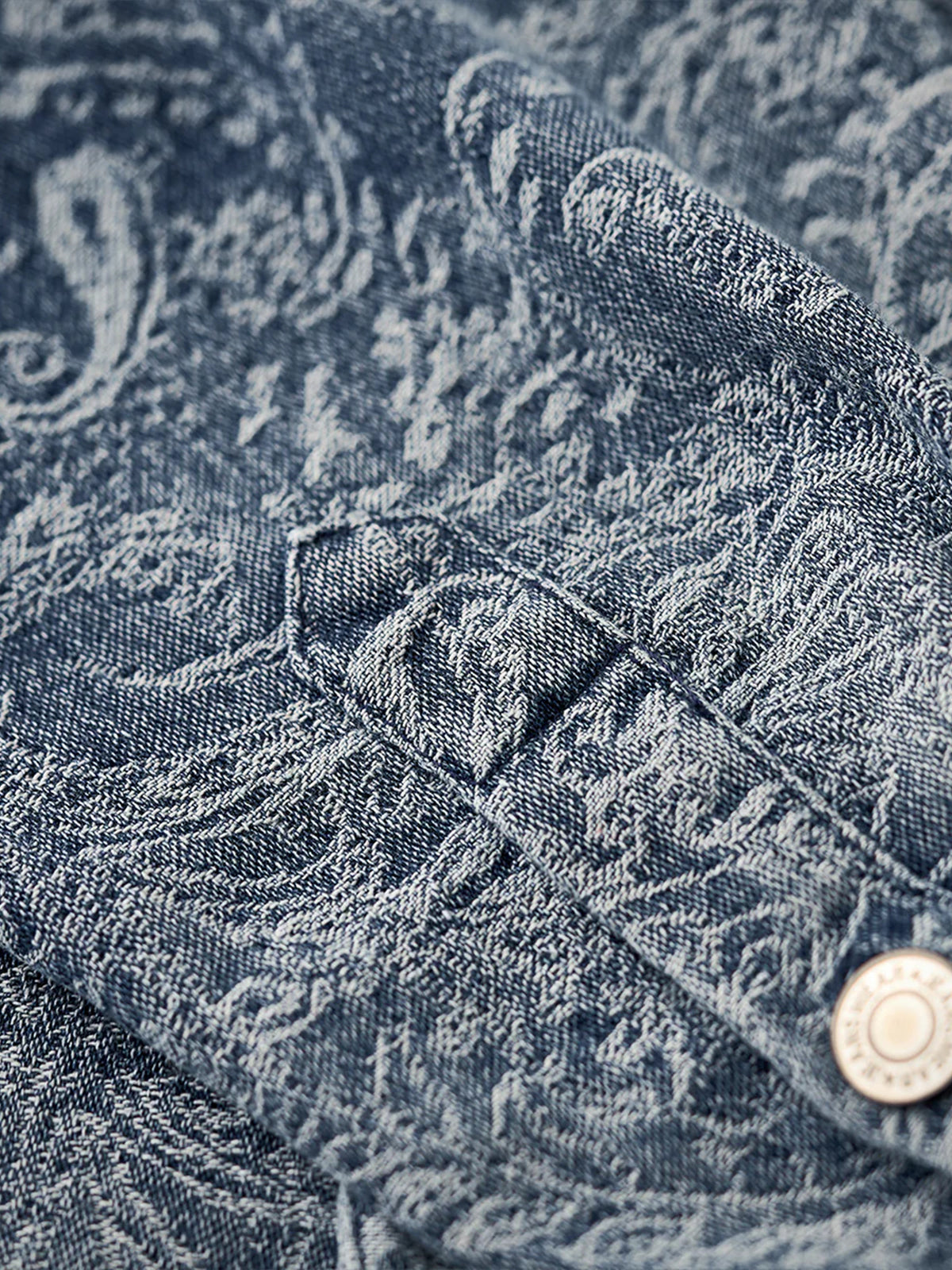 This denim work shirt features a classic paisley pattern woven in jacquard, offering a textured and dimensional finish. The gradient design transitions from deeper tones around the chest and waist to lighter shades near the collar and hem, creating a visually striking look without relying on dyeing. Two chest pockets add practicality, while the versatile silhouette allows it to be worn solo or as a lightweight outer layer.
