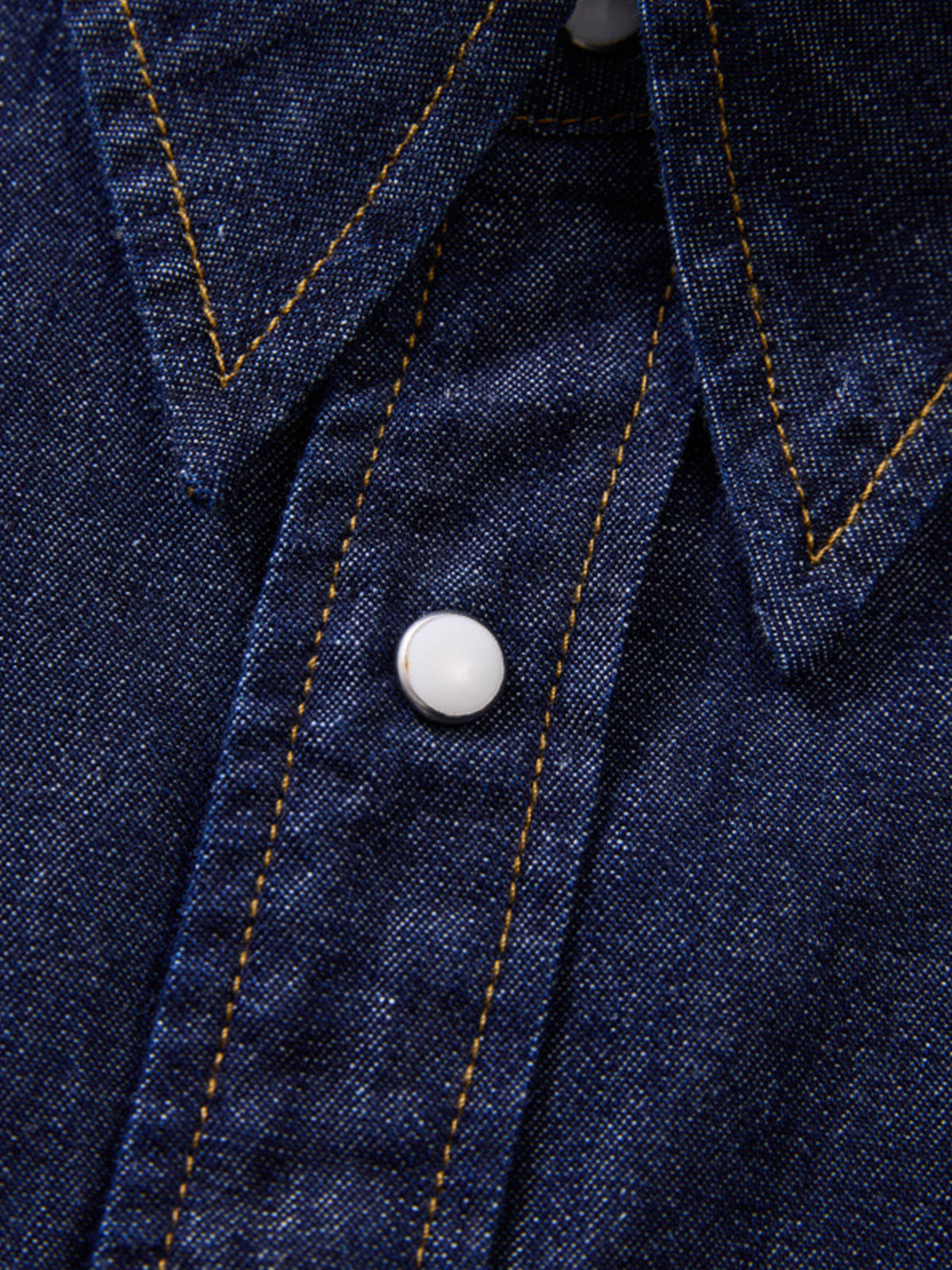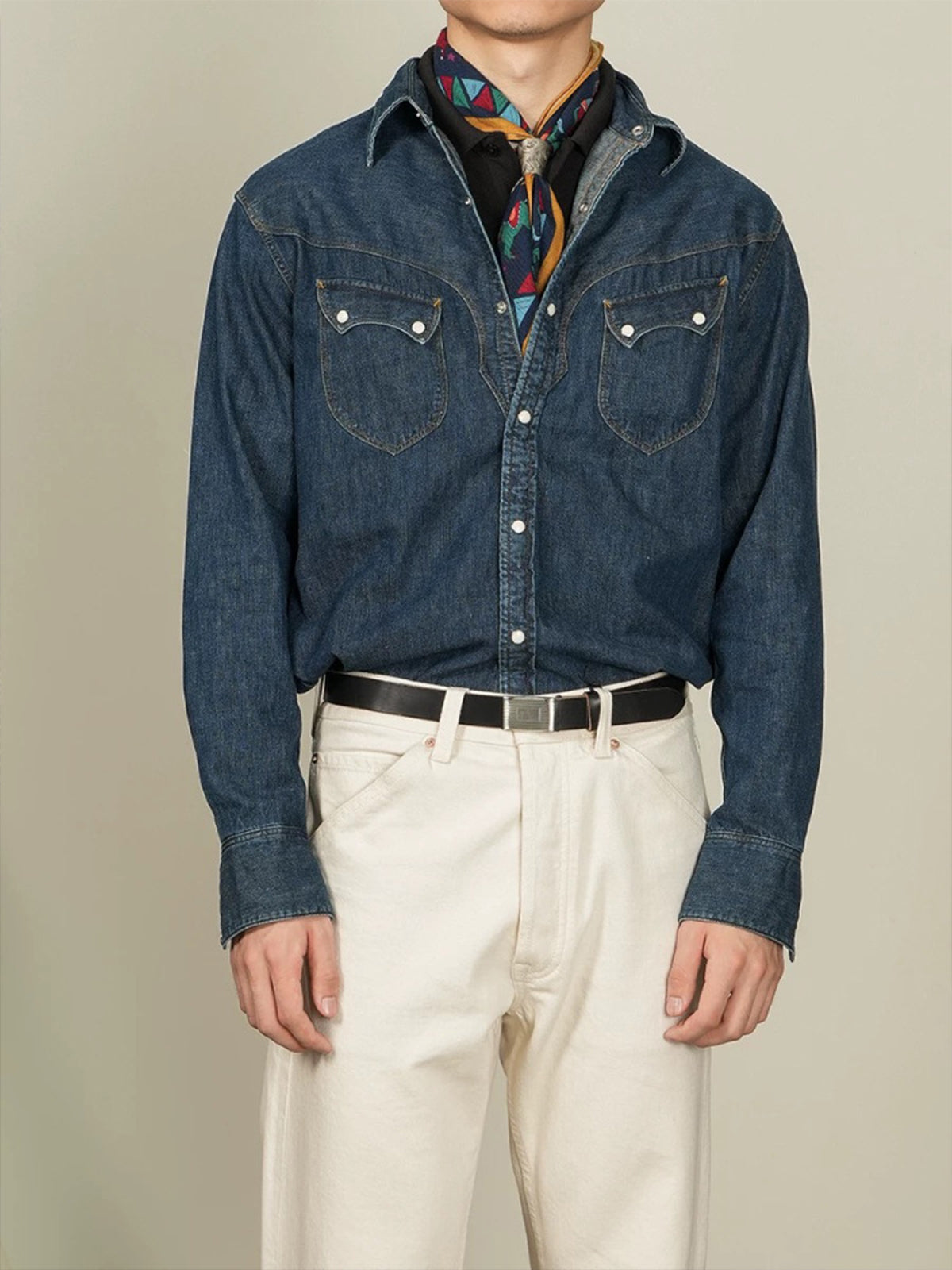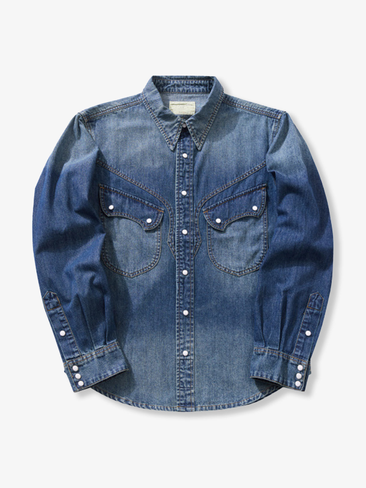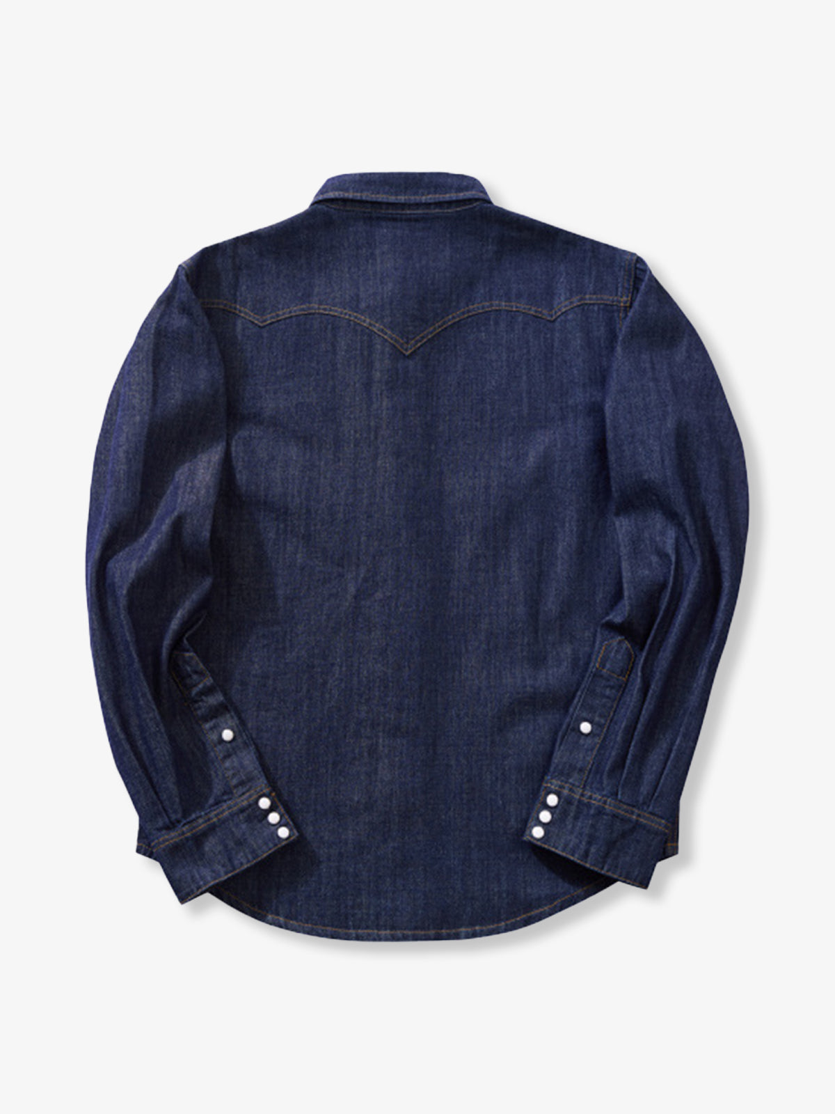A timeless Western classic inspired by early cowboy shirts. The curved stitching on the front panel draws inspiration from the sweeping horns of longhorn cattle, while the back’s curved seam design echoes the powerful wingspan of an eagle soaring over the prairie. Available in two denim finishes—heavily washed for a vintage, tide-effect look, or raw for a cleaner appearance. The white version comes in pure cotton herringbone fabric. Buttons are designed with pearl-agate imitation for a refined touch. Western-inspired panel stitching at the front highlights the classic cowboy spirit of the era.
