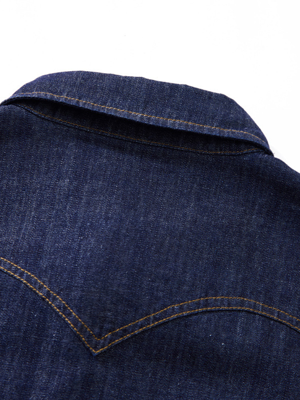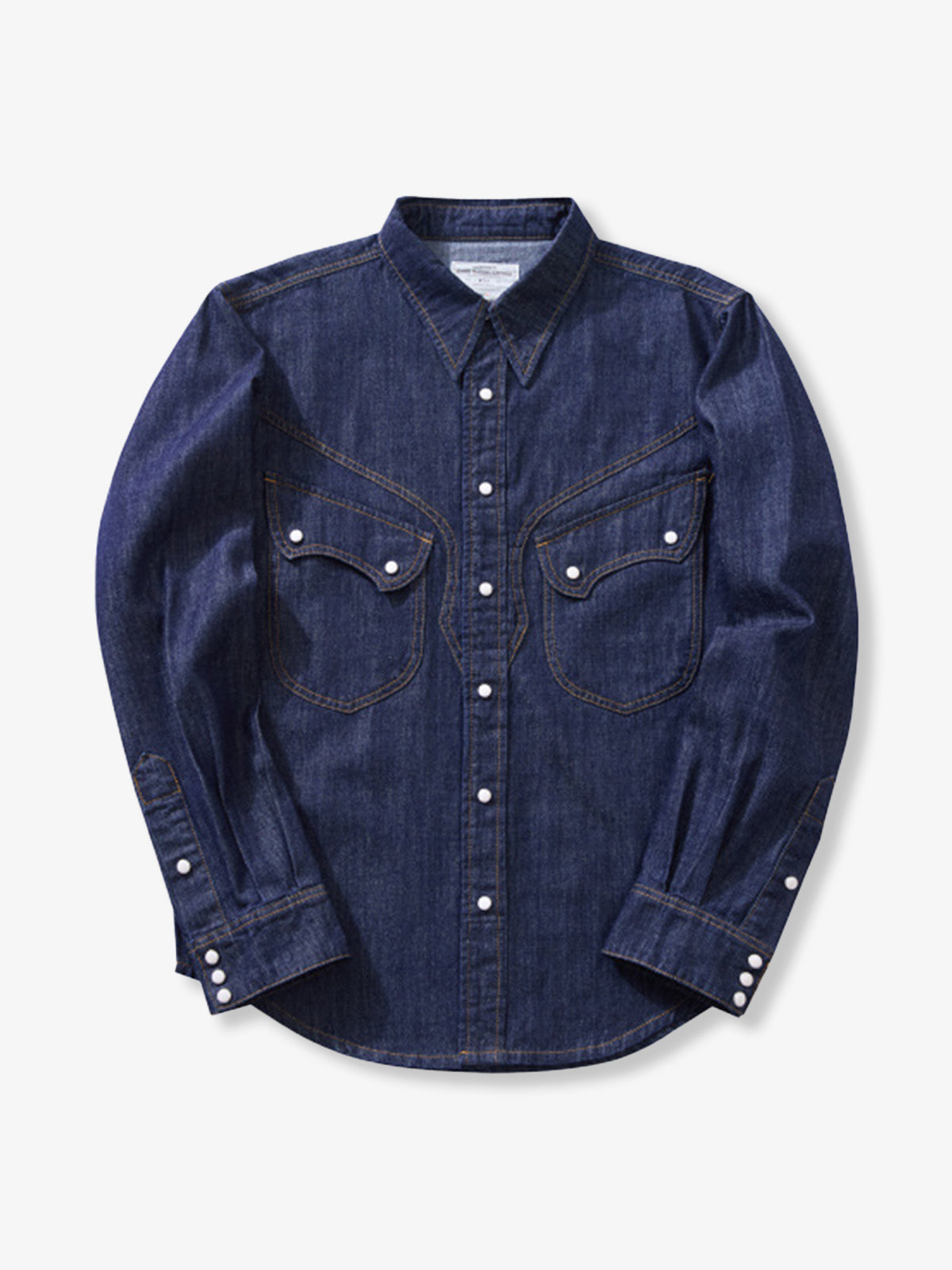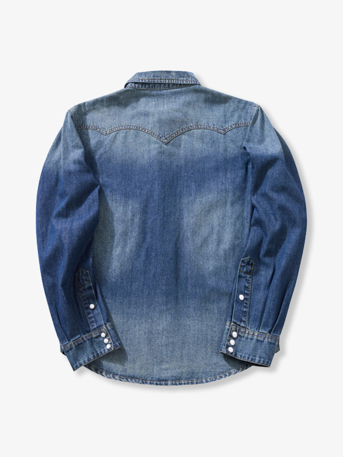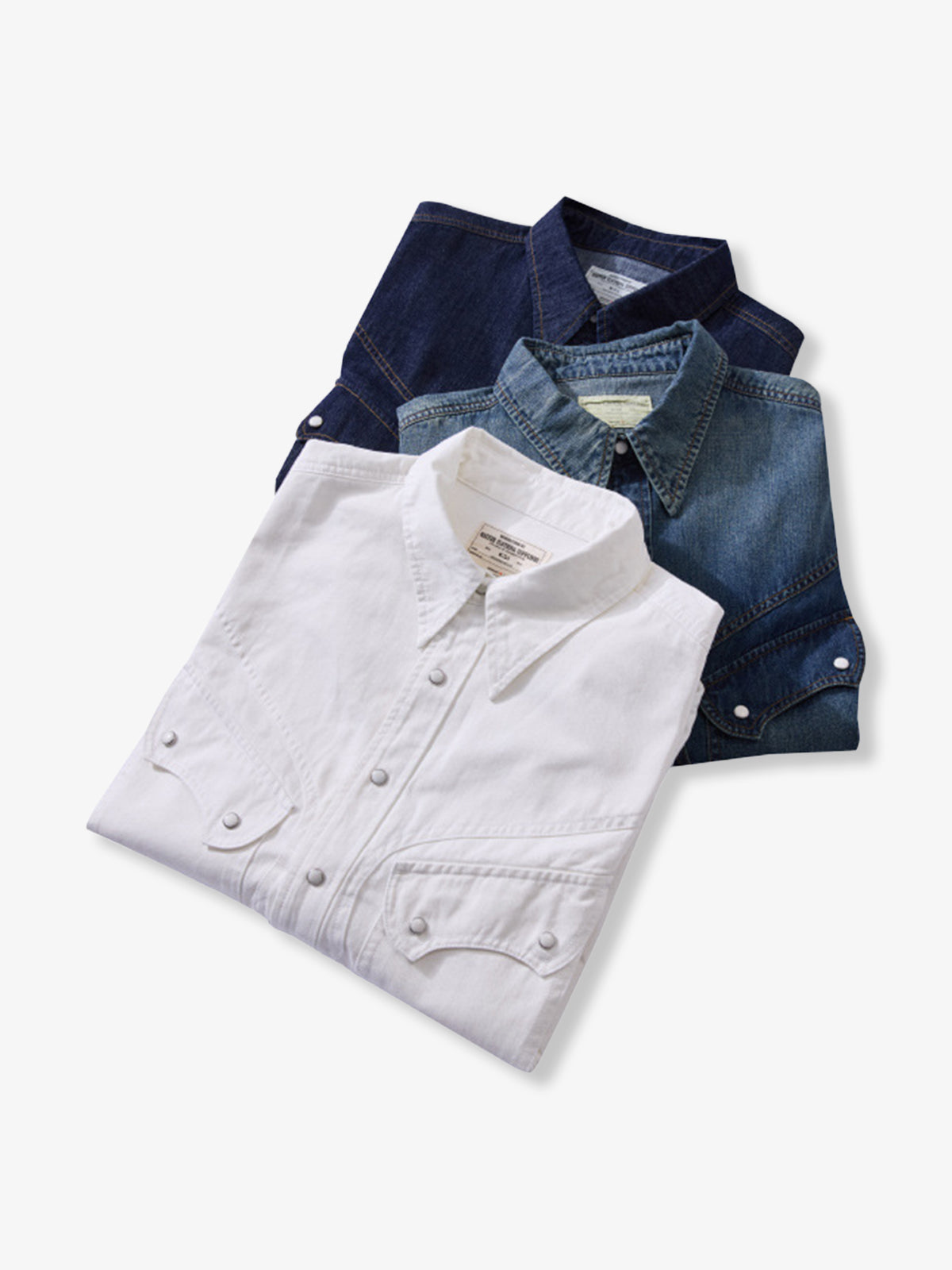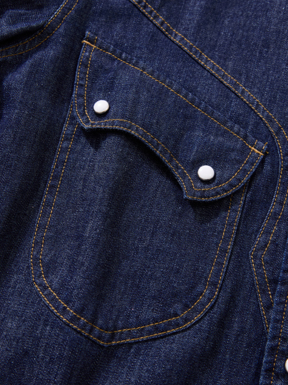 A timeless Western classic inspired by early cowboy shirts. The curved stitching on the front panel draws inspiration from the sweeping horns of longhorn cattle, while the back’s curved seam design echoes the powerful wingspan of an eagle soaring over the prairie. Available in two denim finishes—heavily washed for a vintage, tide-effect look, or raw for a cleaner appearance. The white version comes in pure cotton herringbone fabric. Buttons are designed with pearl-agate imitation for a refined touch. Western-inspired panel stitching at the front highlights the classic cowboy spirit of the era.
