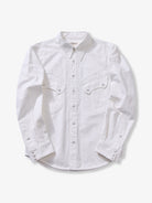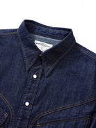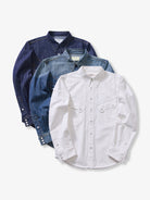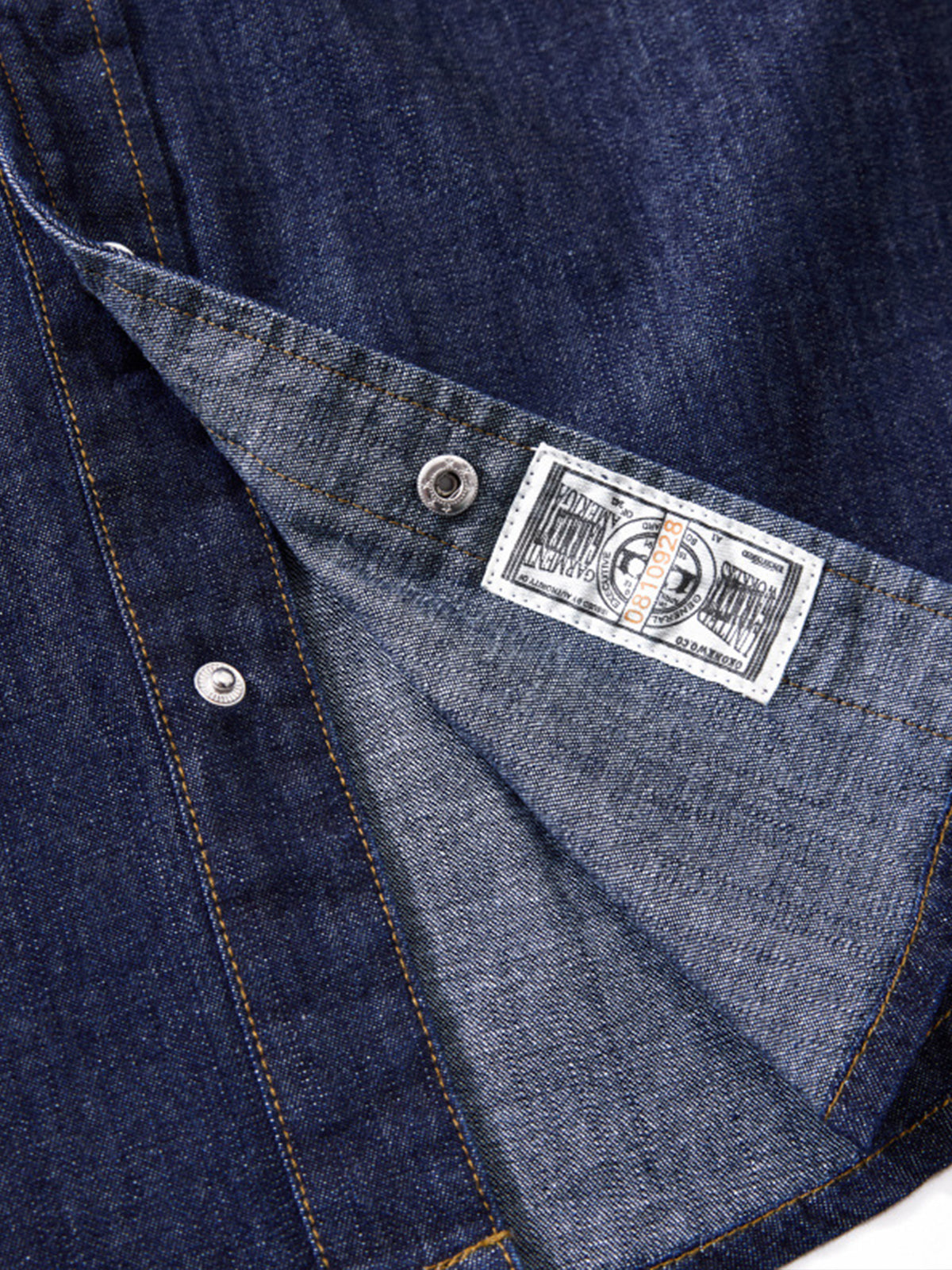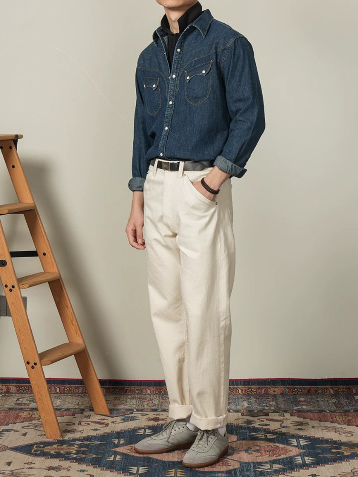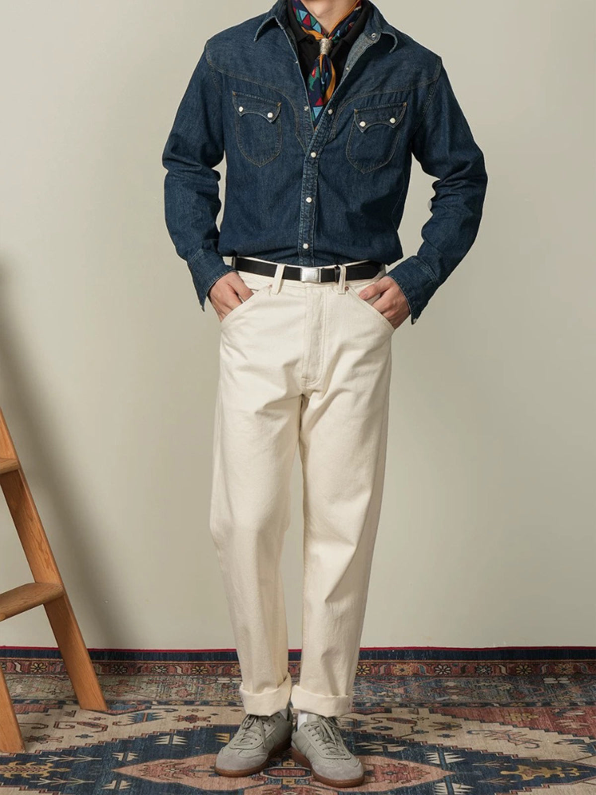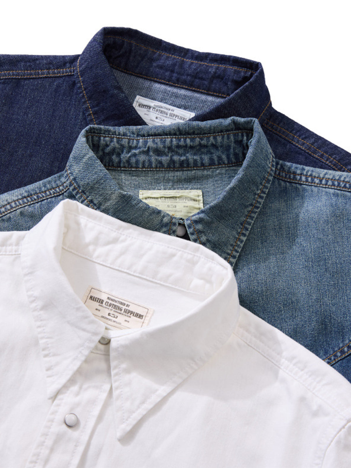 A timeless Western classic inspired by early cowboy shirts. The curved stitching on the front panel draws inspiration from the sweeping horns of longhorn cattle, while the back’s curved seam design echoes the powerful wingspan of an eagle soaring over the prairie. Available in two denim finishes—heavily washed for a vintage, tide-effect look, or raw for a cleaner appearance. The white version comes in pure cotton herringbone fabric. Buttons are designed with pearl-agate imitation for a refined touch. Western-inspired panel stitching at the front highlights the classic cowboy spirit of the era.