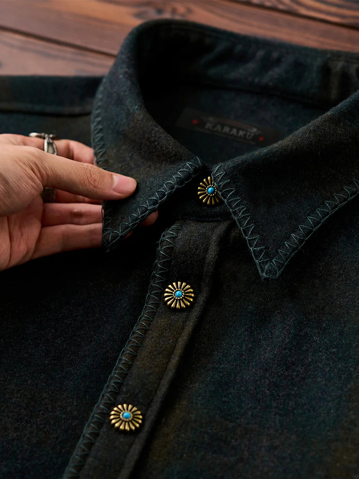 A western shirt that blends tradition and modernity. The brushed fabric is combined with ethnic tweed patches to create a unique design that adds a visual highlight. The buttons are the cornerstone of the shirt, and they are custom concho buttons that add luxury and uniqueness to the details. This is a piece that can be worn casually and smartly, and can be used in a wide range of occasions from daily life to special occasions.