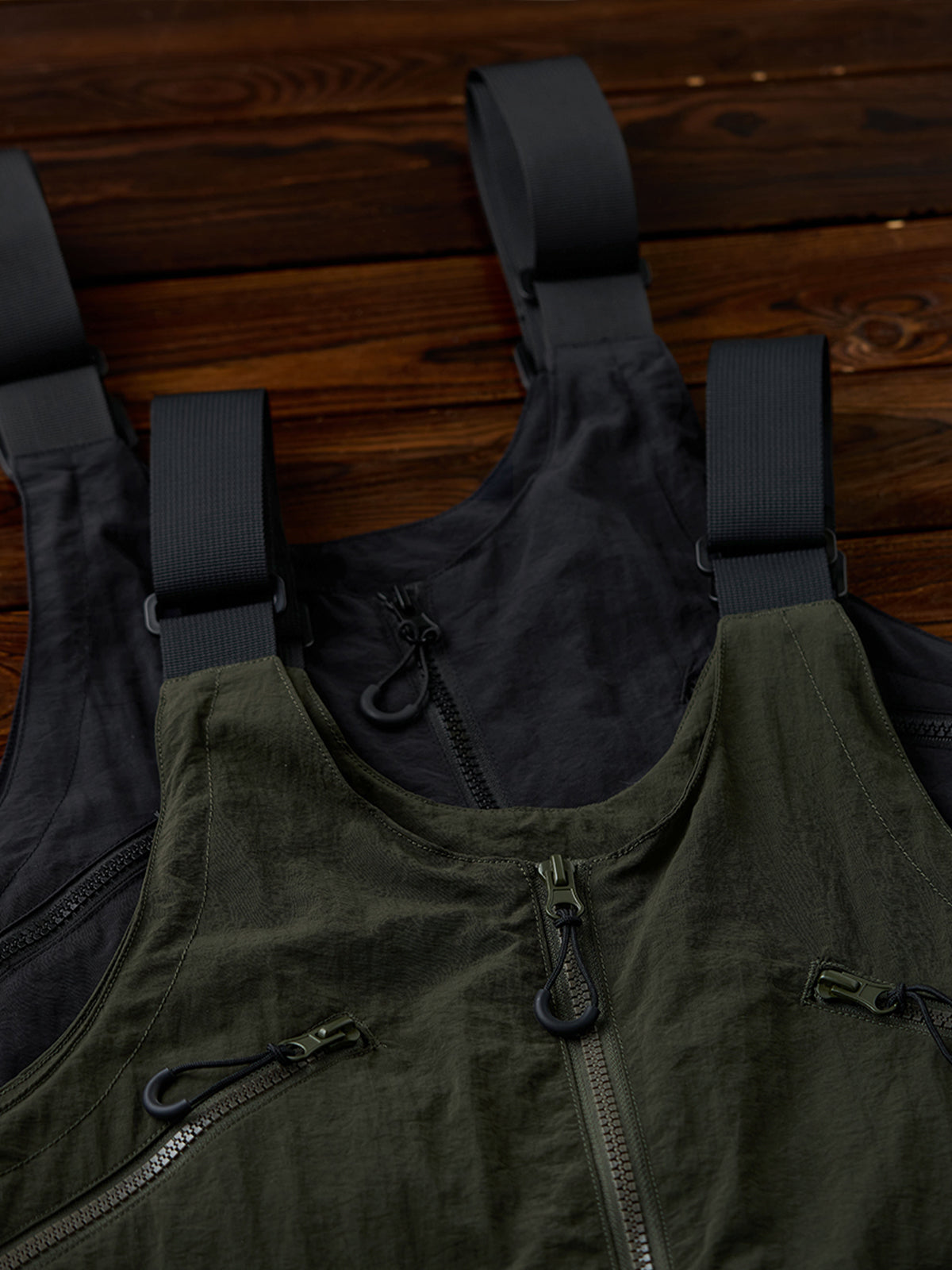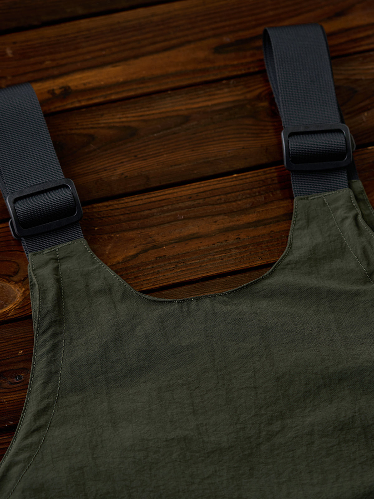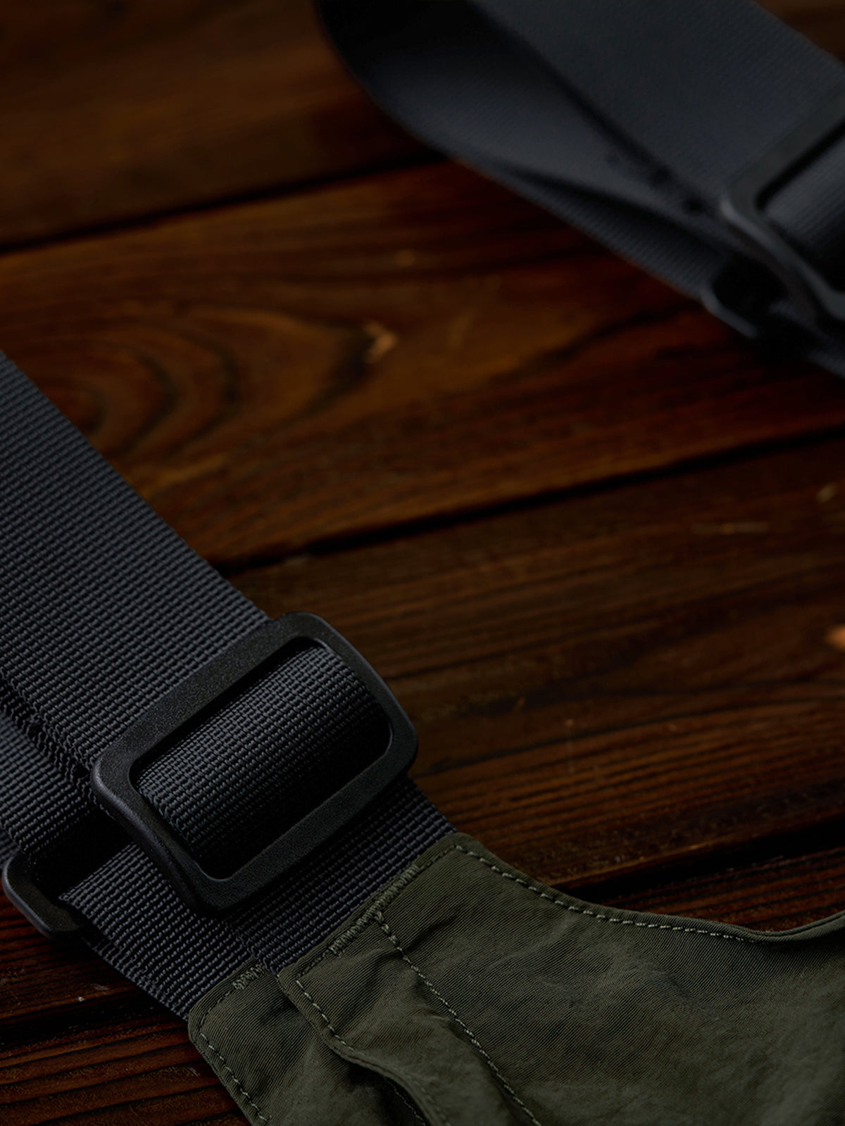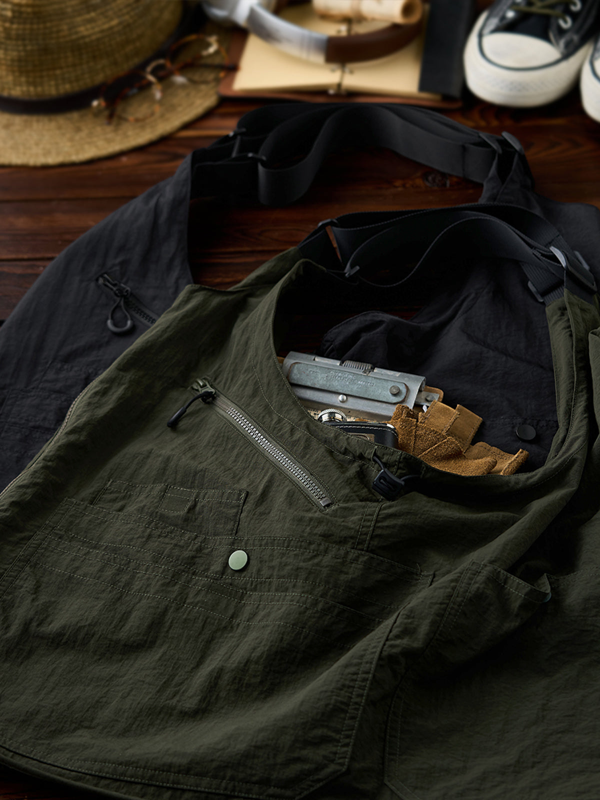 It can be used as a vest or bag, with two button pockets on the front and two zipper pockets on the back for small storage. Designed with excellent storage capacity, the wide silhouette makes it feel like a bag, the length of the shoulder straps can be adjusted, and each part can be combined to create an original look. The material is nylon, which is lightweight, resistant to friction, durable, and has anti-fouling properties. It is designed with excellent storage capacity, a wide silhouette, and the length of the shoulder straps can be adjusted, so it can be worn outside the coat.