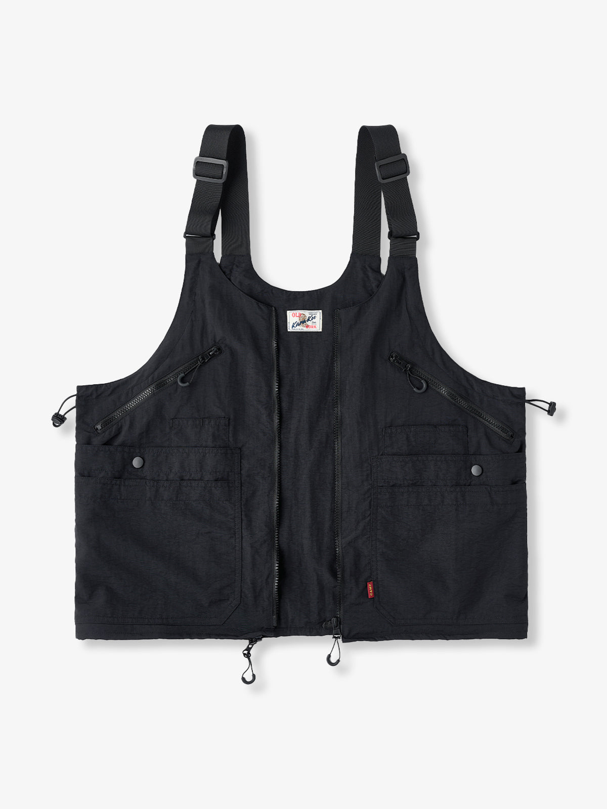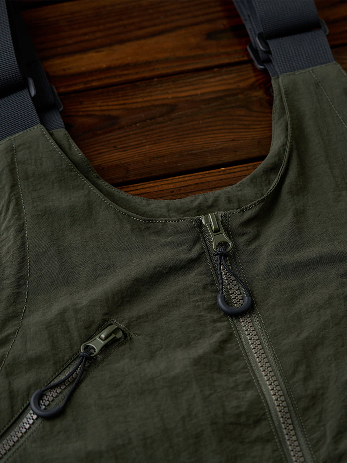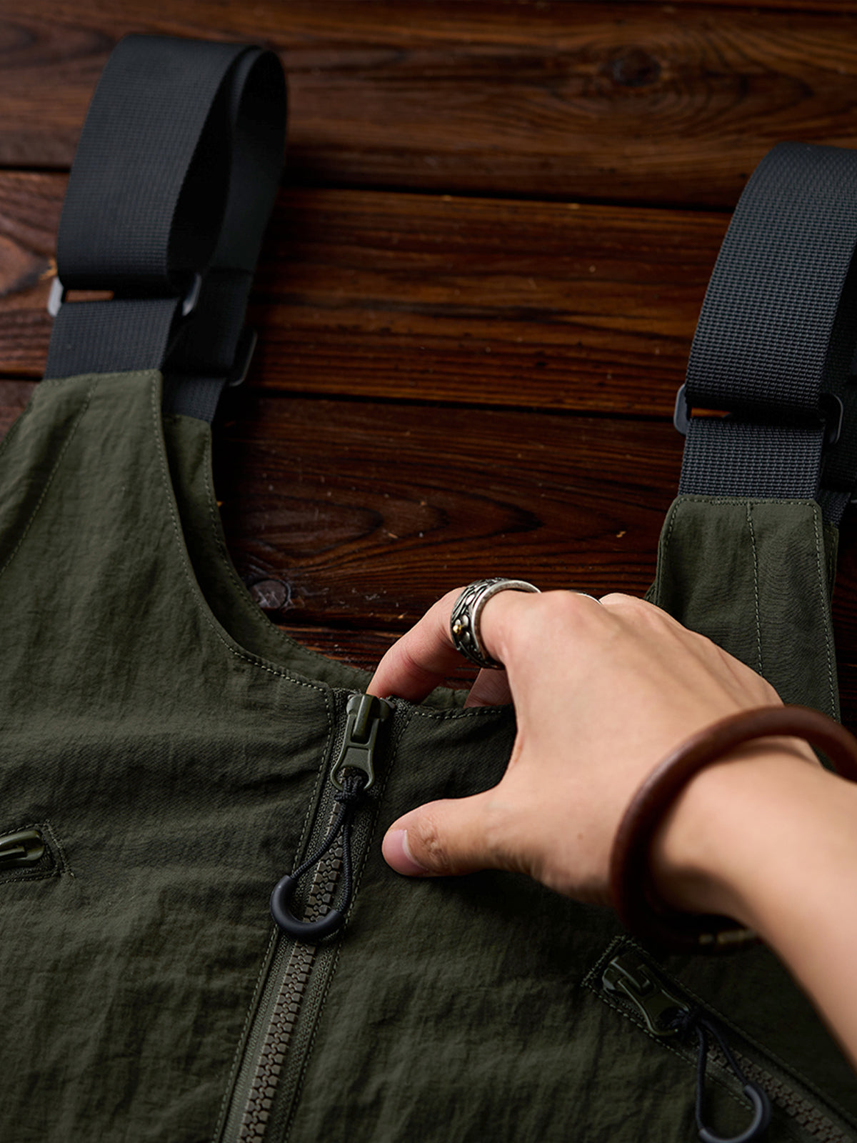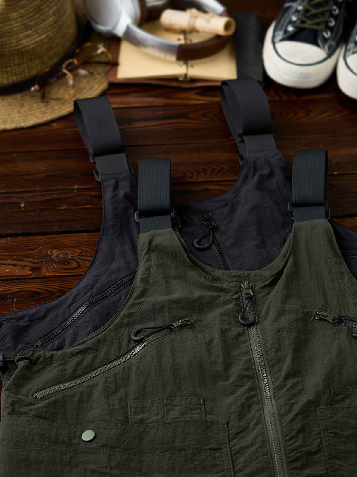 It can be used as a vest or bag, with two button pockets on the front and two zipper pockets on the back for small storage. Designed with excellent storage capacity, the wide silhouette makes it feel like a bag, the length of the shoulder straps can be adjusted, and each part can be combined to create an original look. The material is nylon, which is lightweight, resistant to friction, durable, and has anti-fouling properties. It is designed with excellent storage capacity, a wide silhouette, and the length of the shoulder straps can be adjusted, so it can be worn outside the coat.