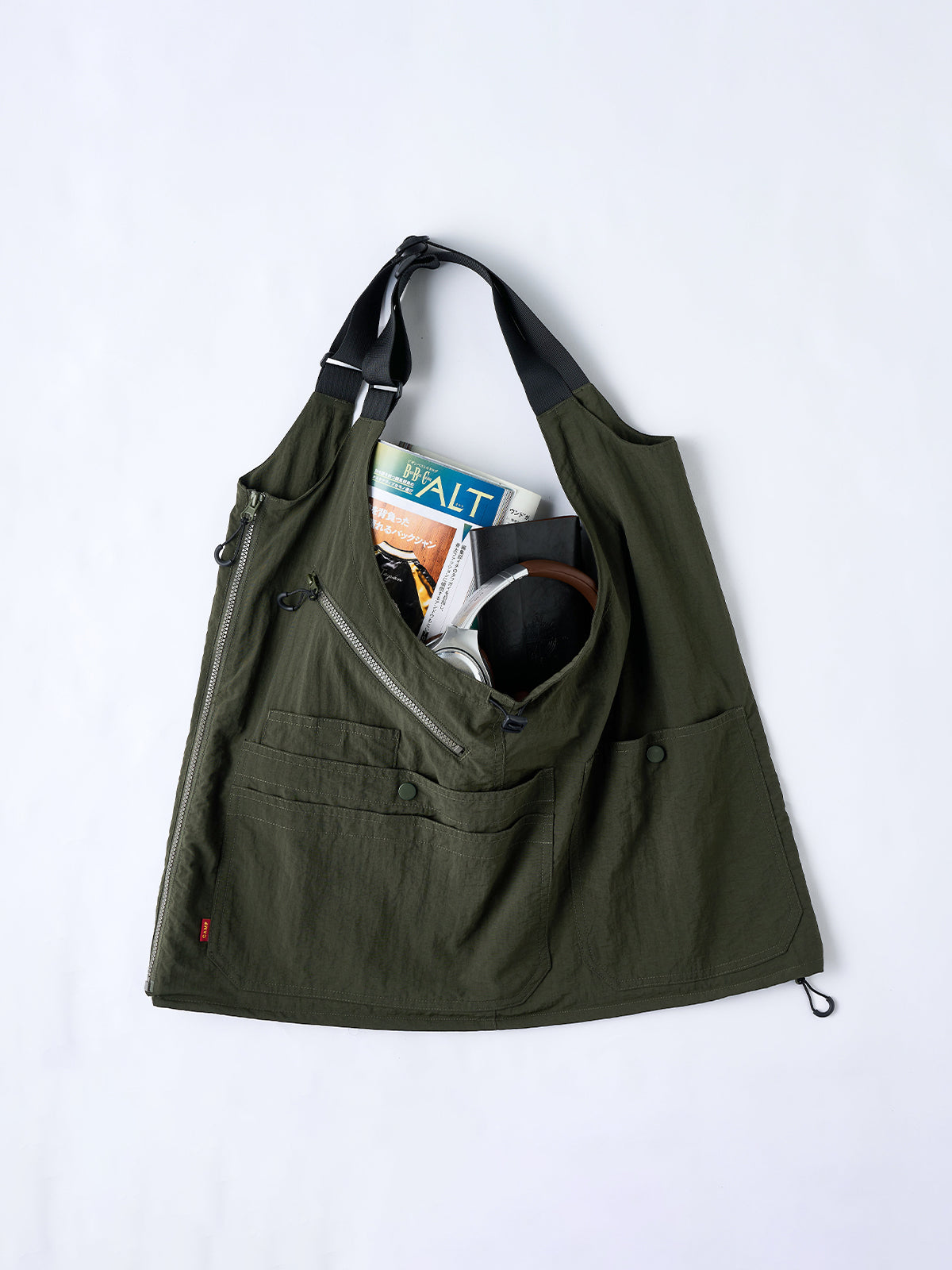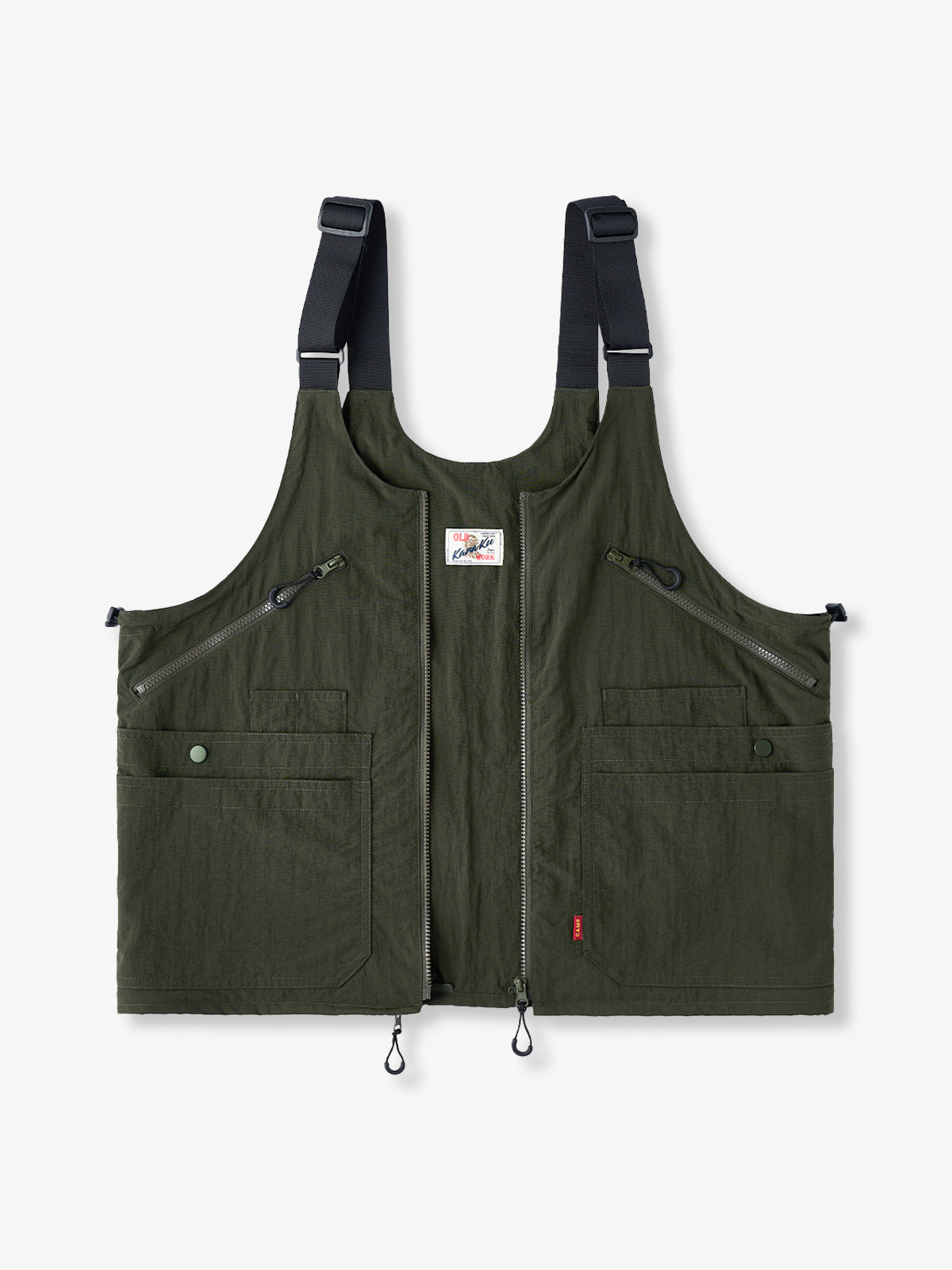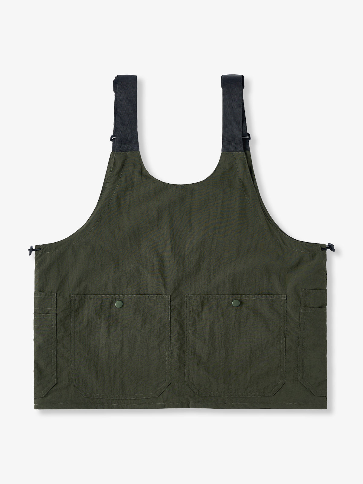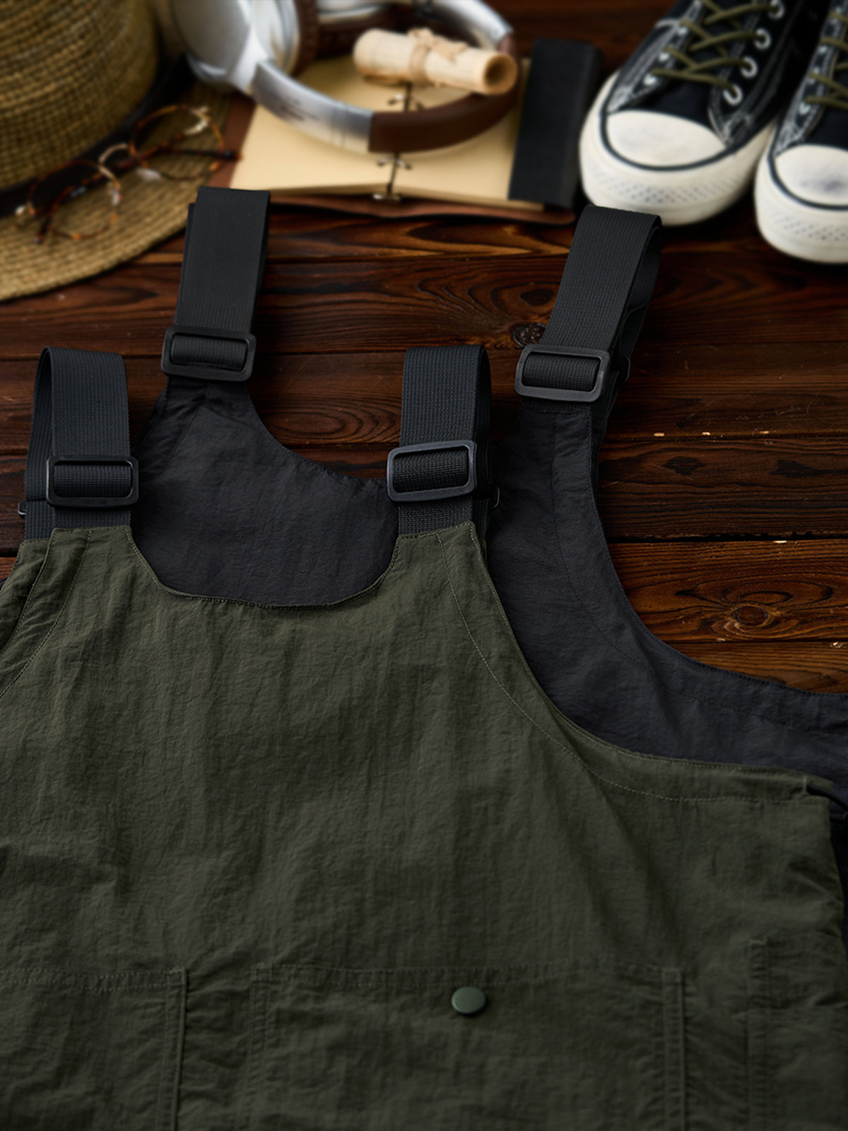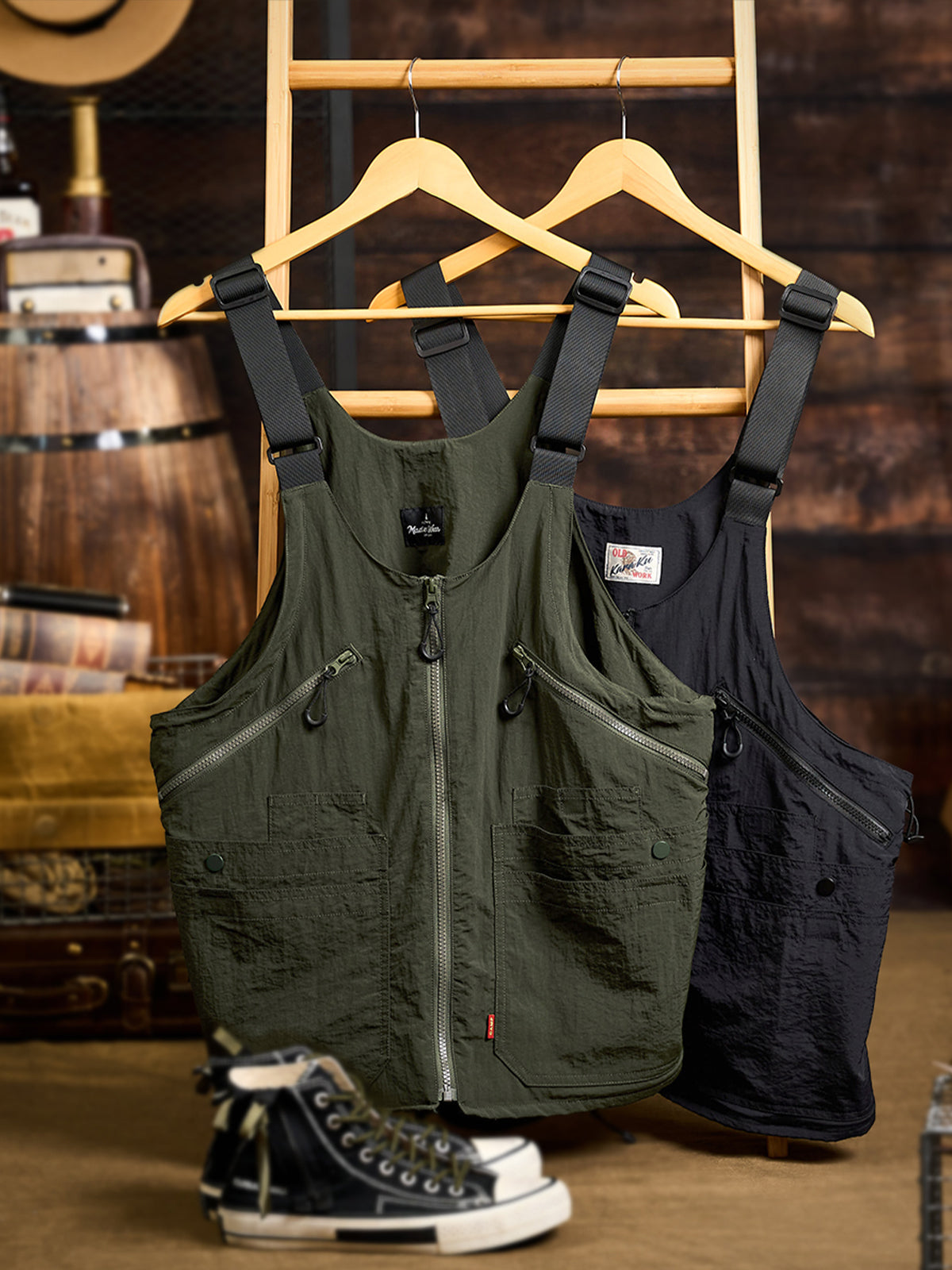It can be used as a vest or bag, with two button pockets on the front and two zipper pockets on the back for small storage. Designed with excellent storage capacity, the wide silhouette makes it feel like a bag, the length of the shoulder straps can be adjusted, and each part can be combined to create an original look. The material is nylon, which is lightweight, resistant to friction, durable, and has anti-fouling properties. It is designed with excellent storage capacity, a wide silhouette, and the length of the shoulder straps can be adjusted, so it can be worn outside the coat.
