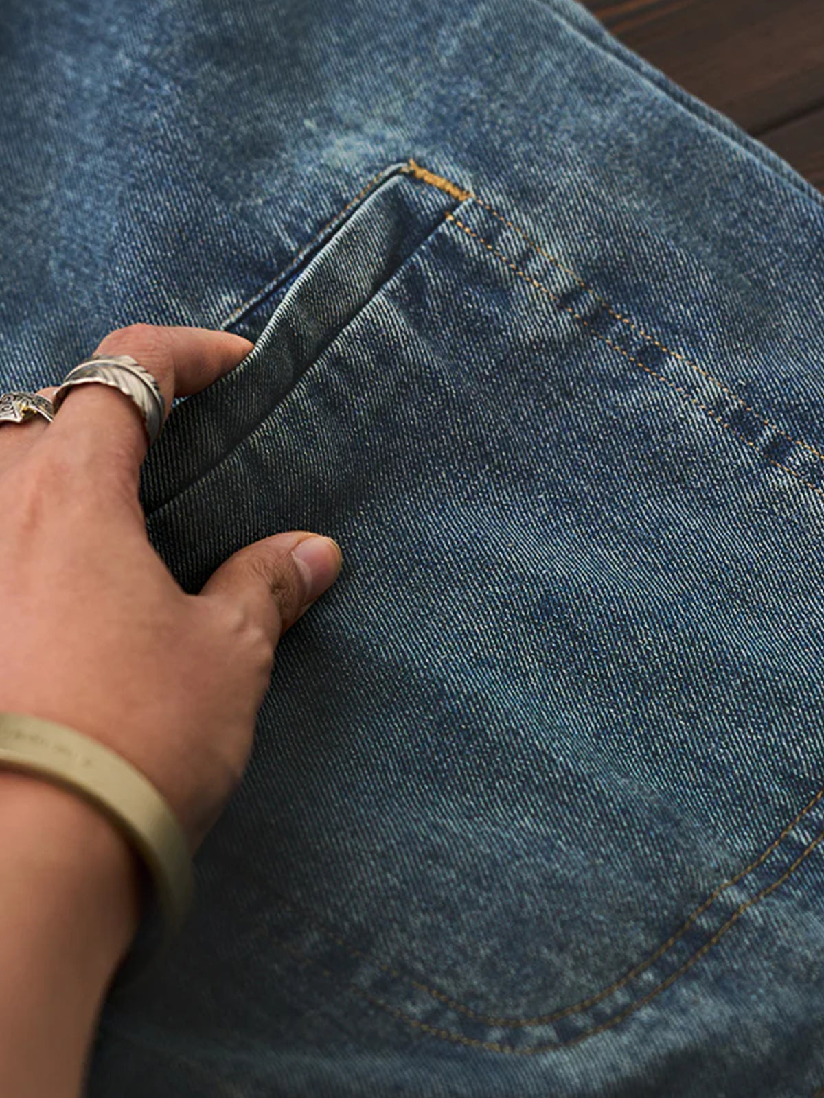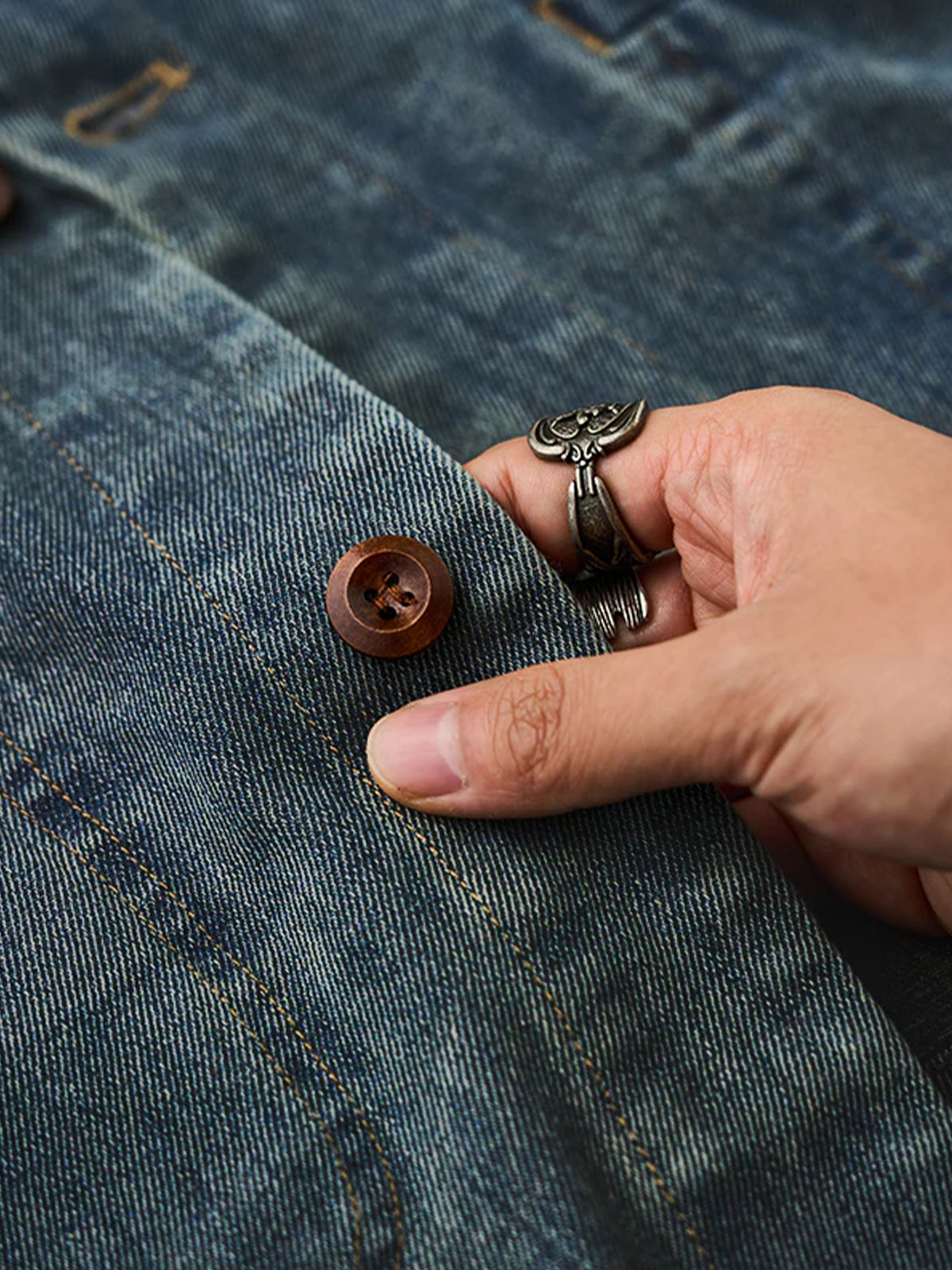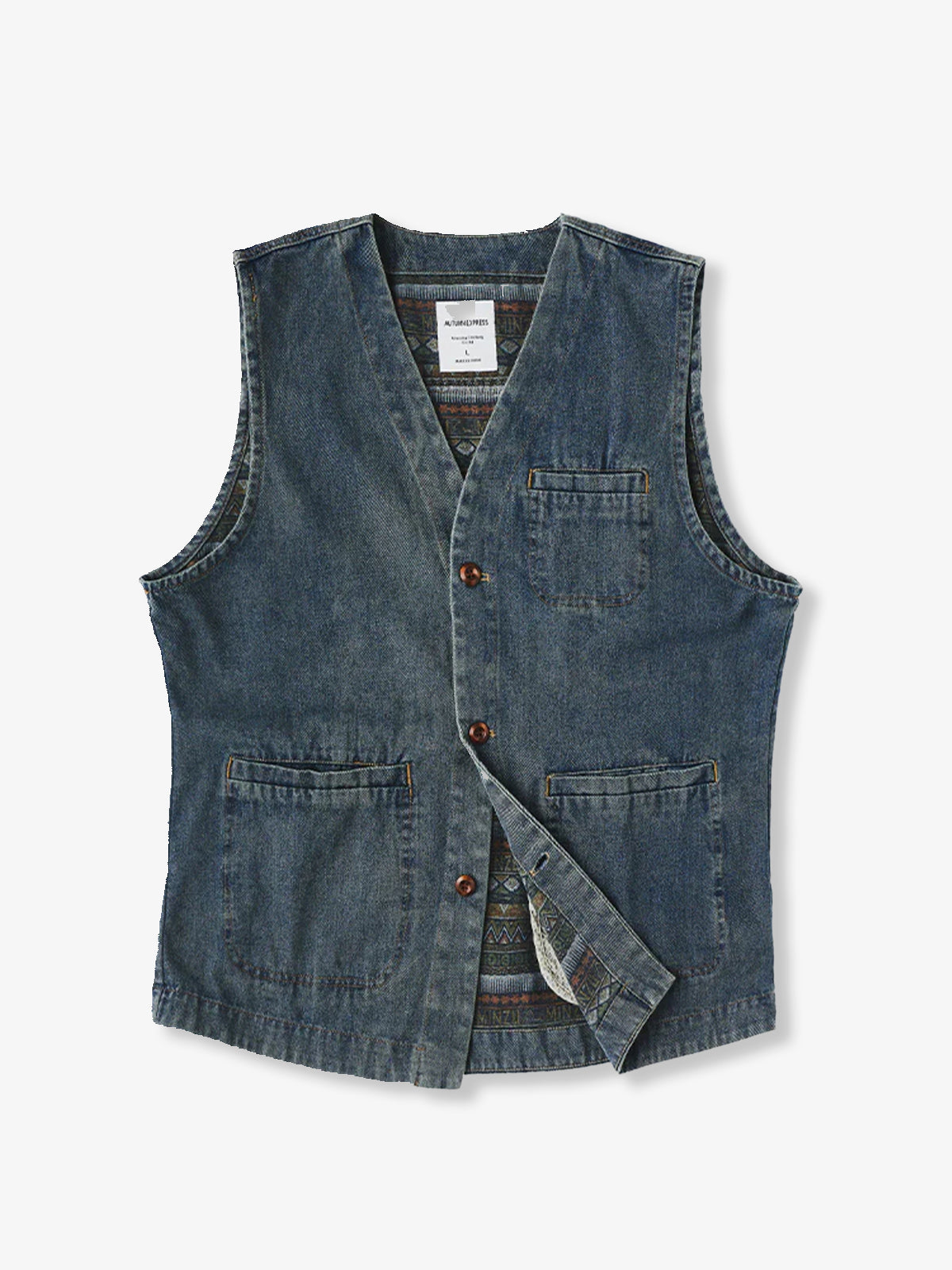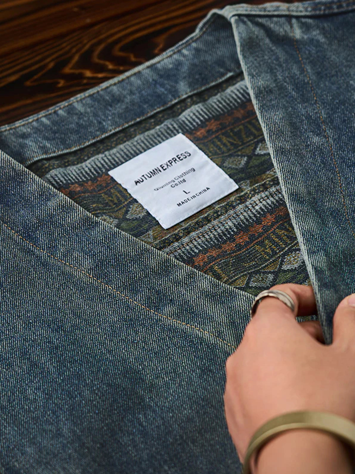 It has a loose design that is not too fitted and is easy to layer with other items. The three pockets on the front not only enhance the practicality, but also highlight the design, making it convenient to store hands and small items. The ethnic pattern of the lining uses a variety of colors, combining warm and cool colors to create a visual impact. The texture of the denim is very durable and gives a casual impression.