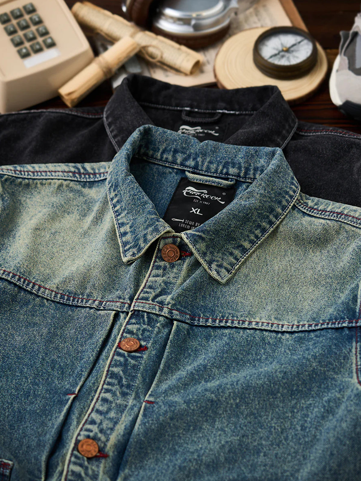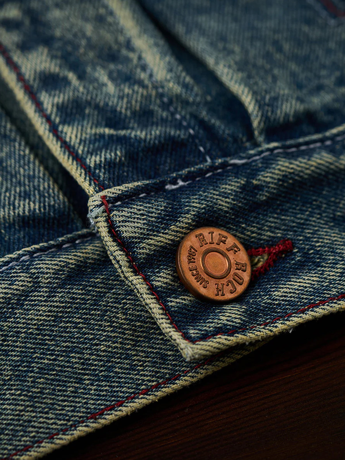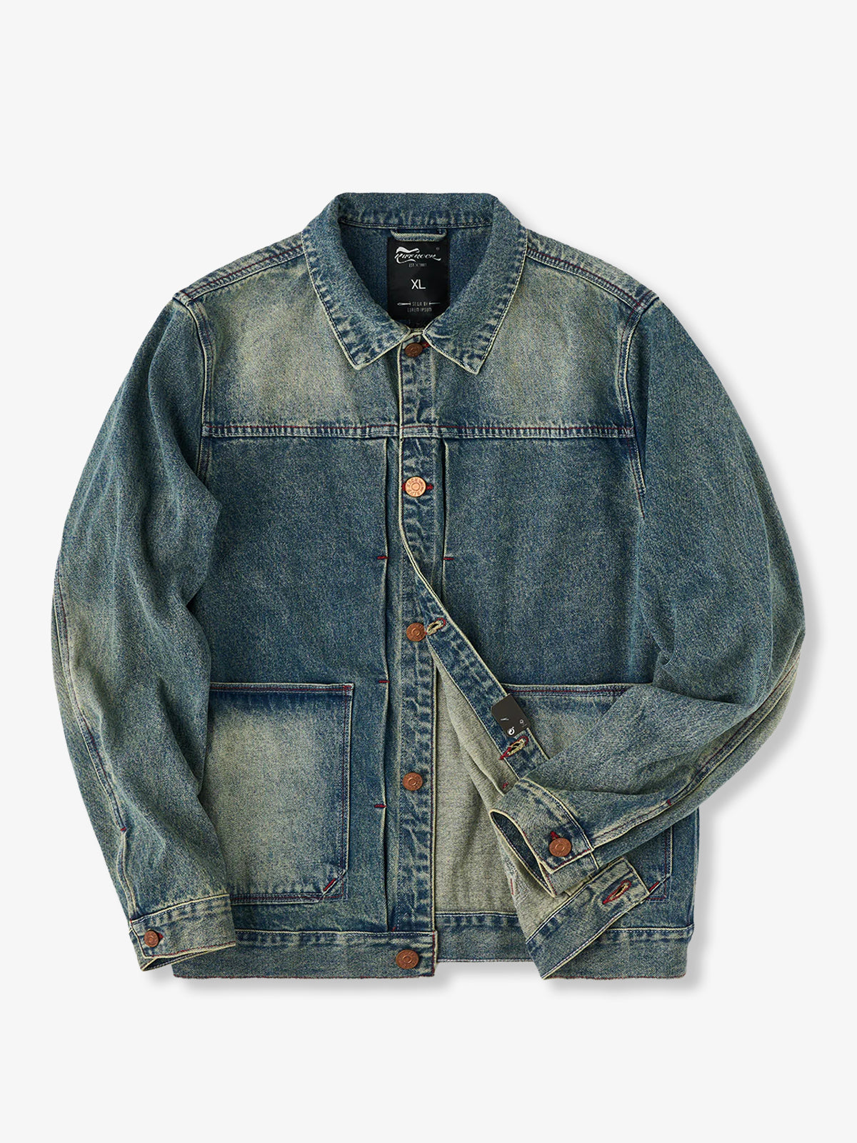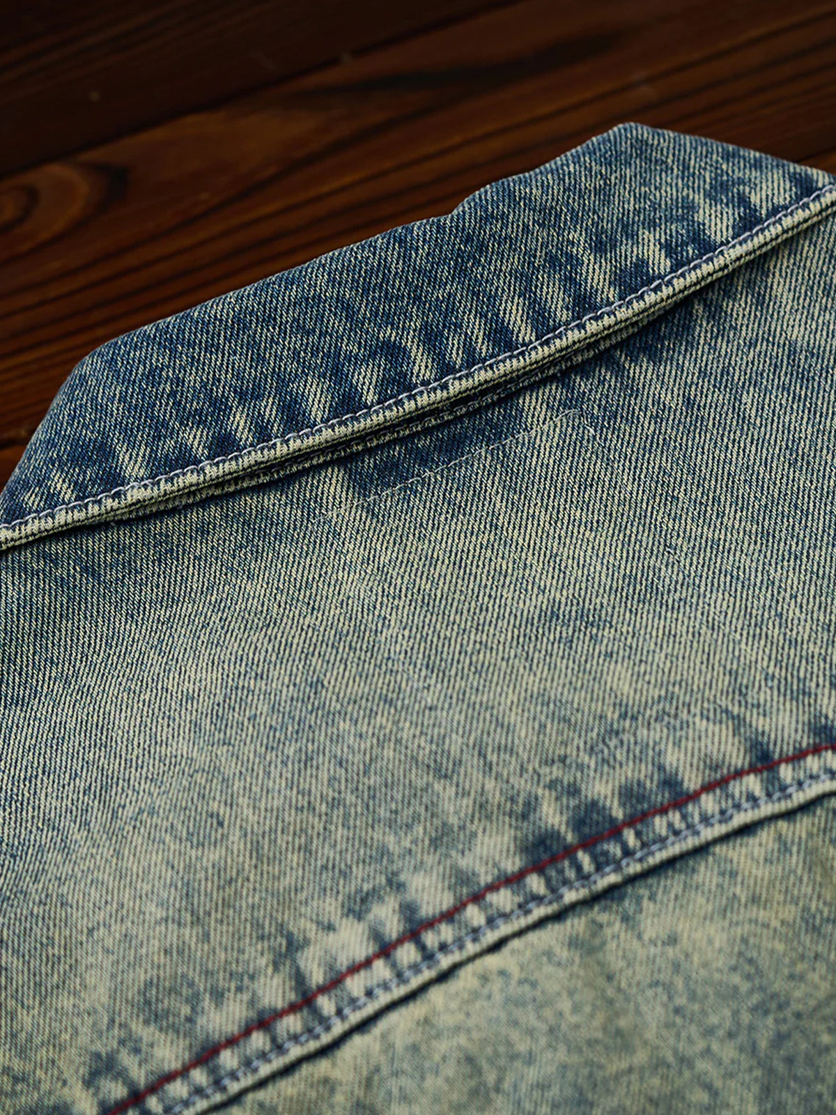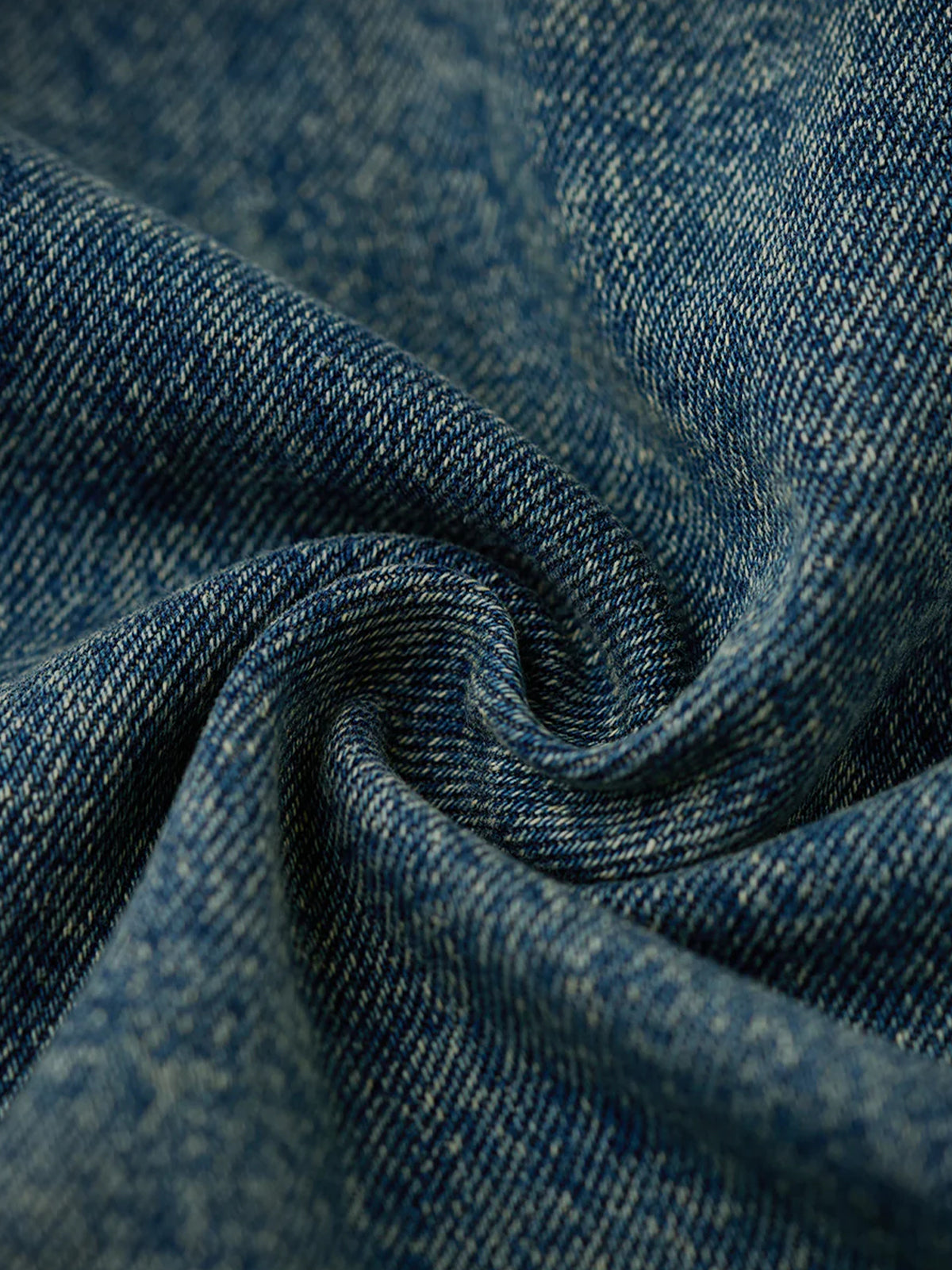 Stonewashing is the process of washing denim using stones and special abrasives to soften the texture and create a natural fading and brushed feel on the surface of the denim. It creates a vintage and classic atmosphere. Two patch pockets are set on the front, which is both tasteful and practical. It has a light and tight silhouette and fits the body moderately. It has sharp lines and three-dimensional cutting.