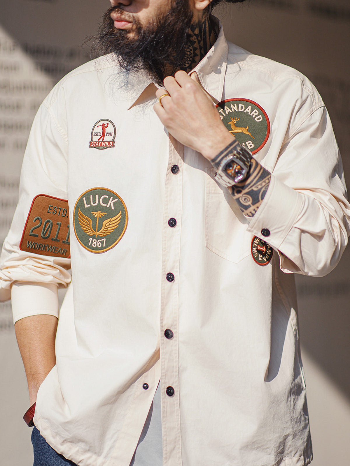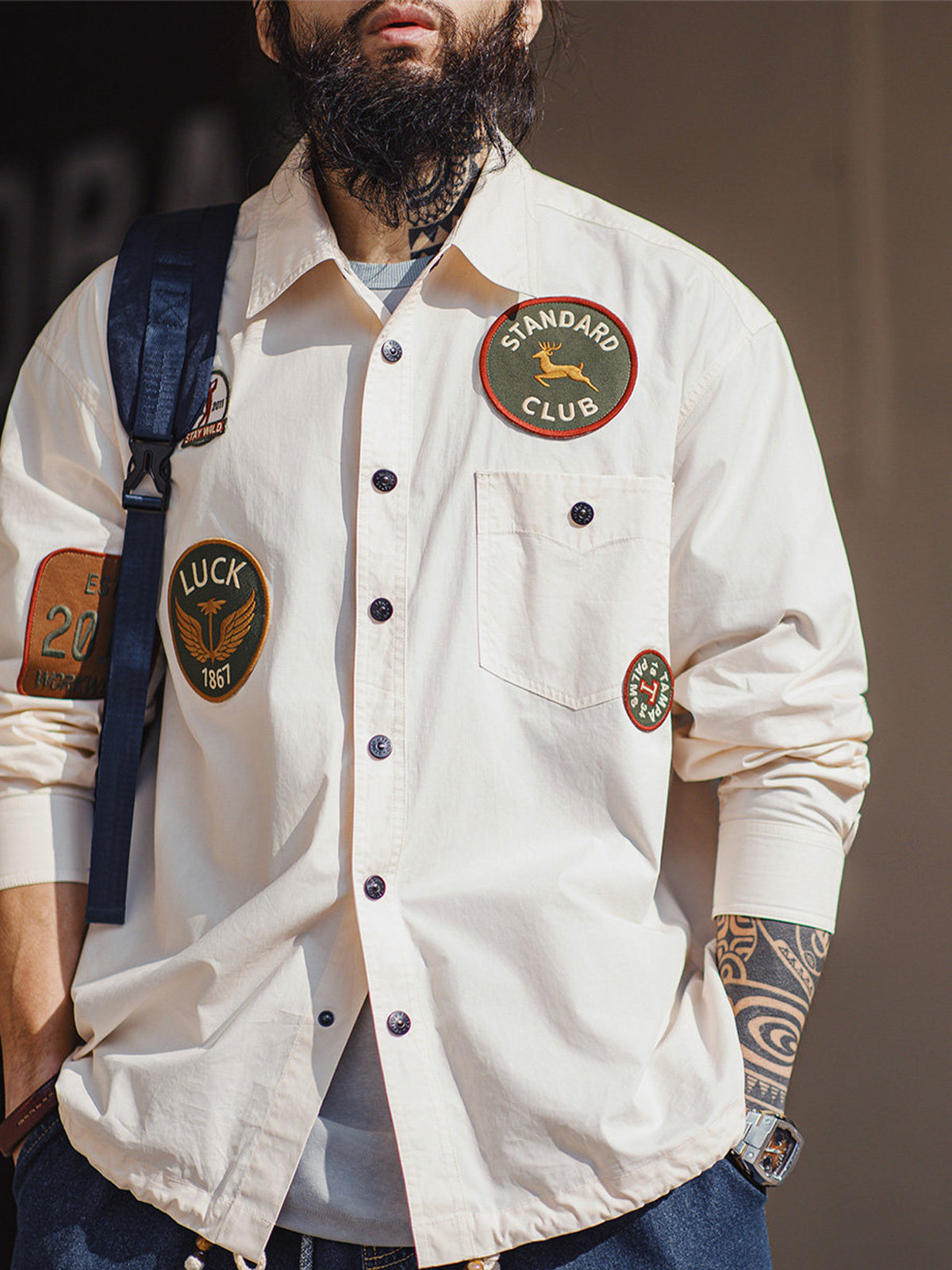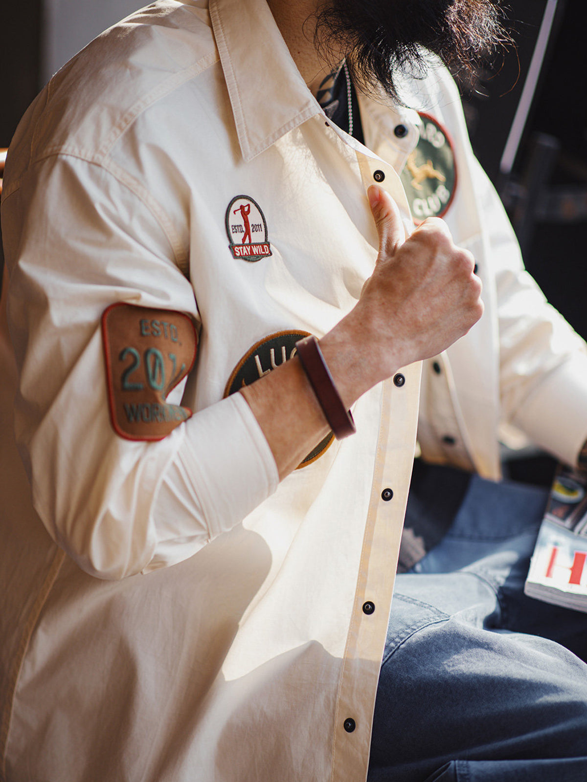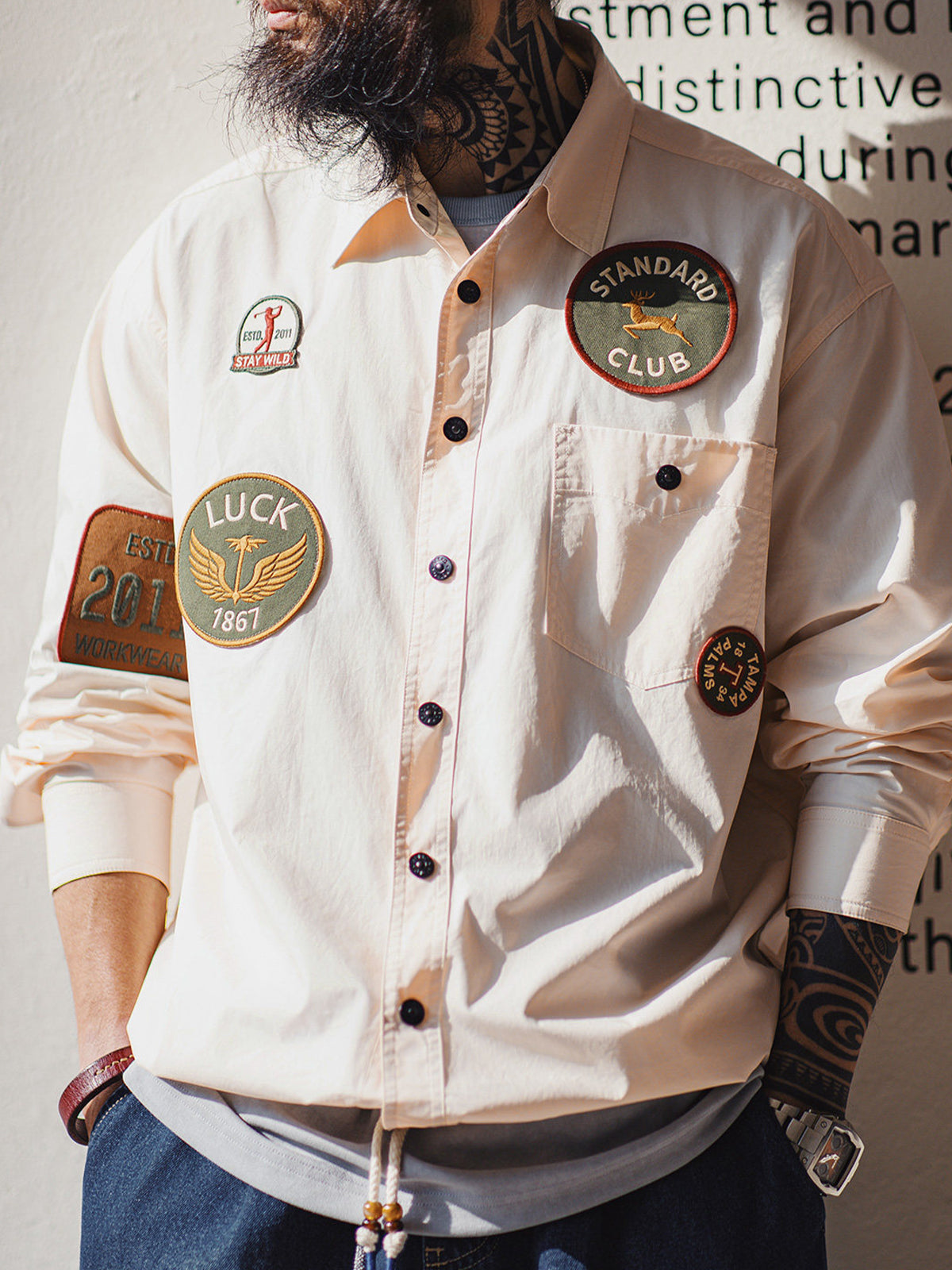 “Badge Club” Embroidered Long-Sleeve Work Shirt with Styled Hem