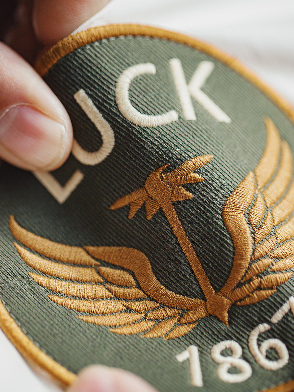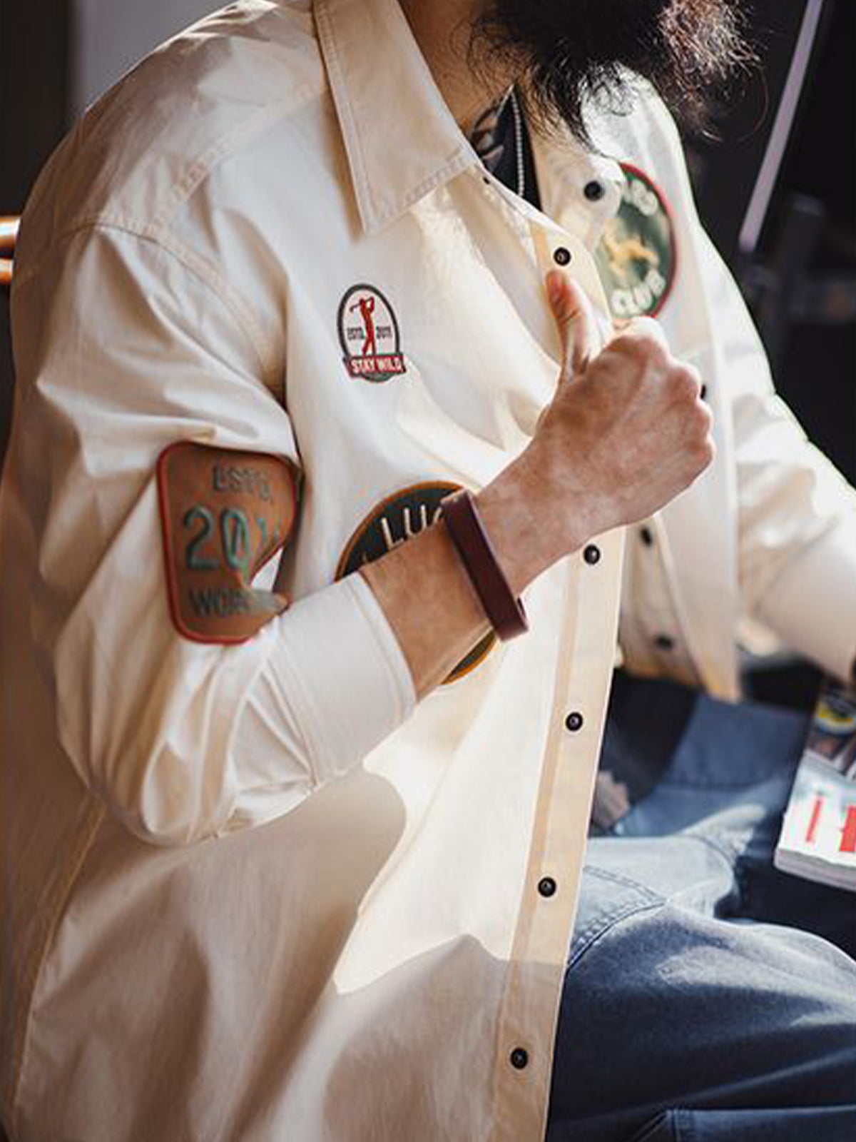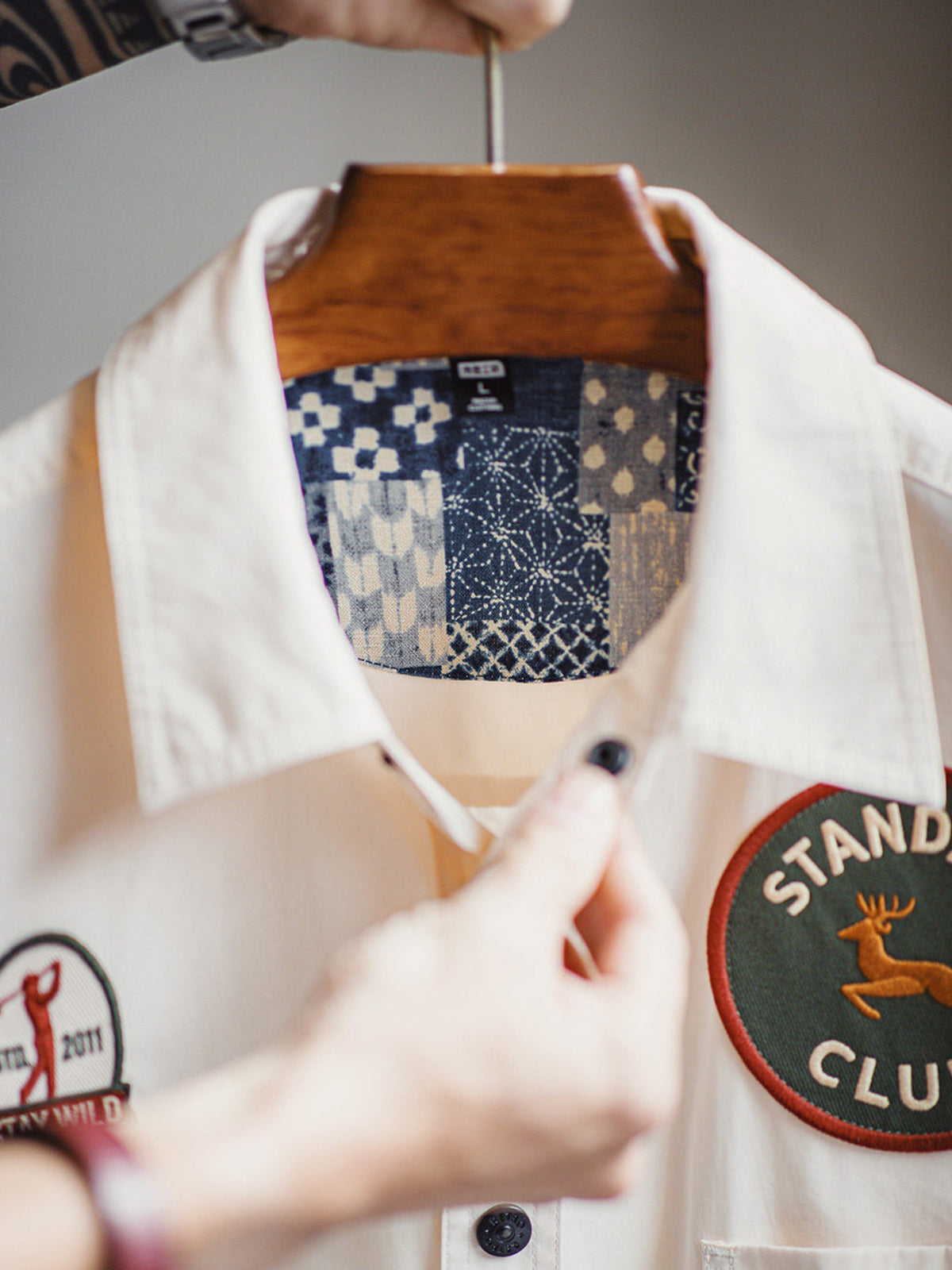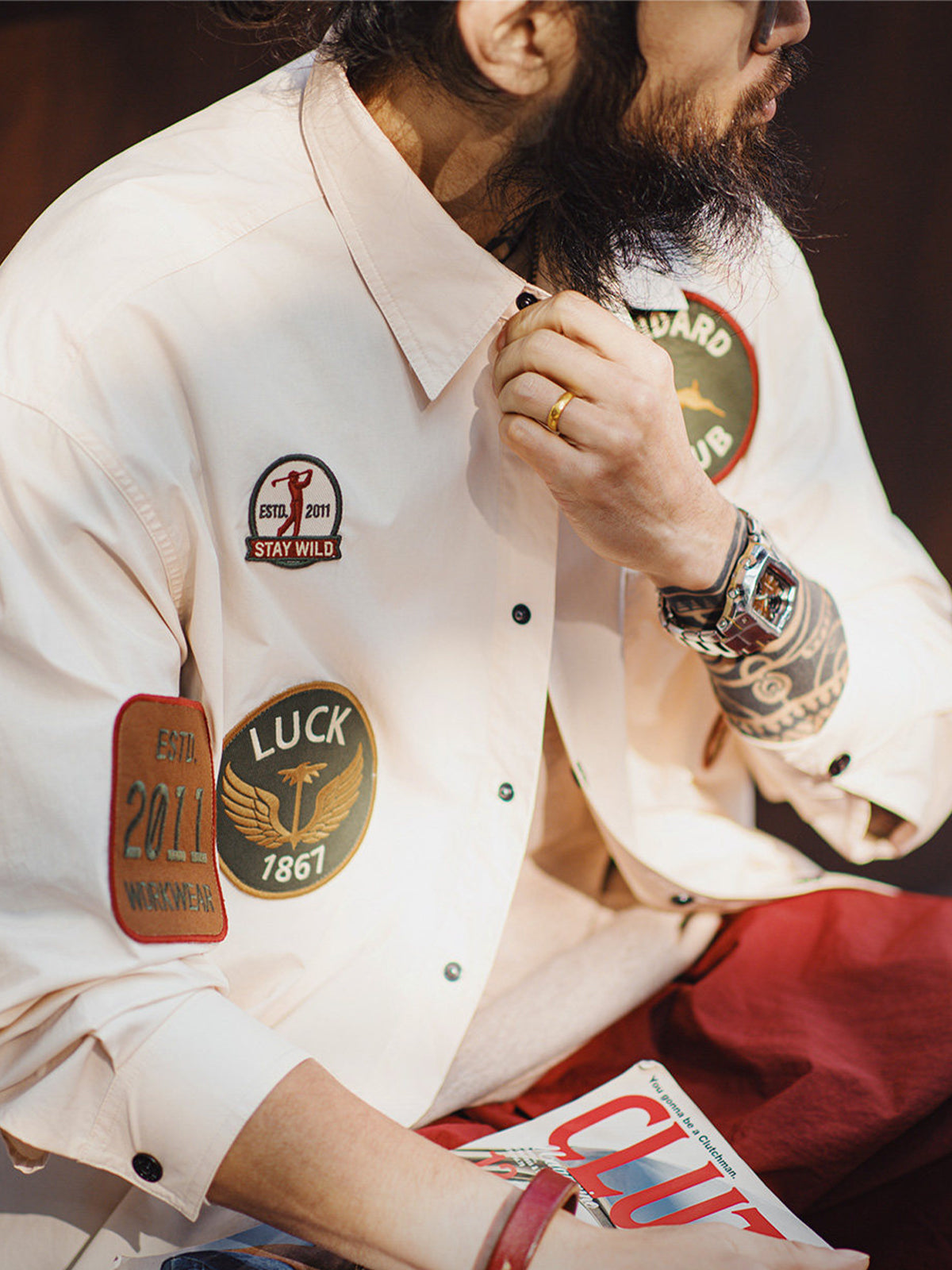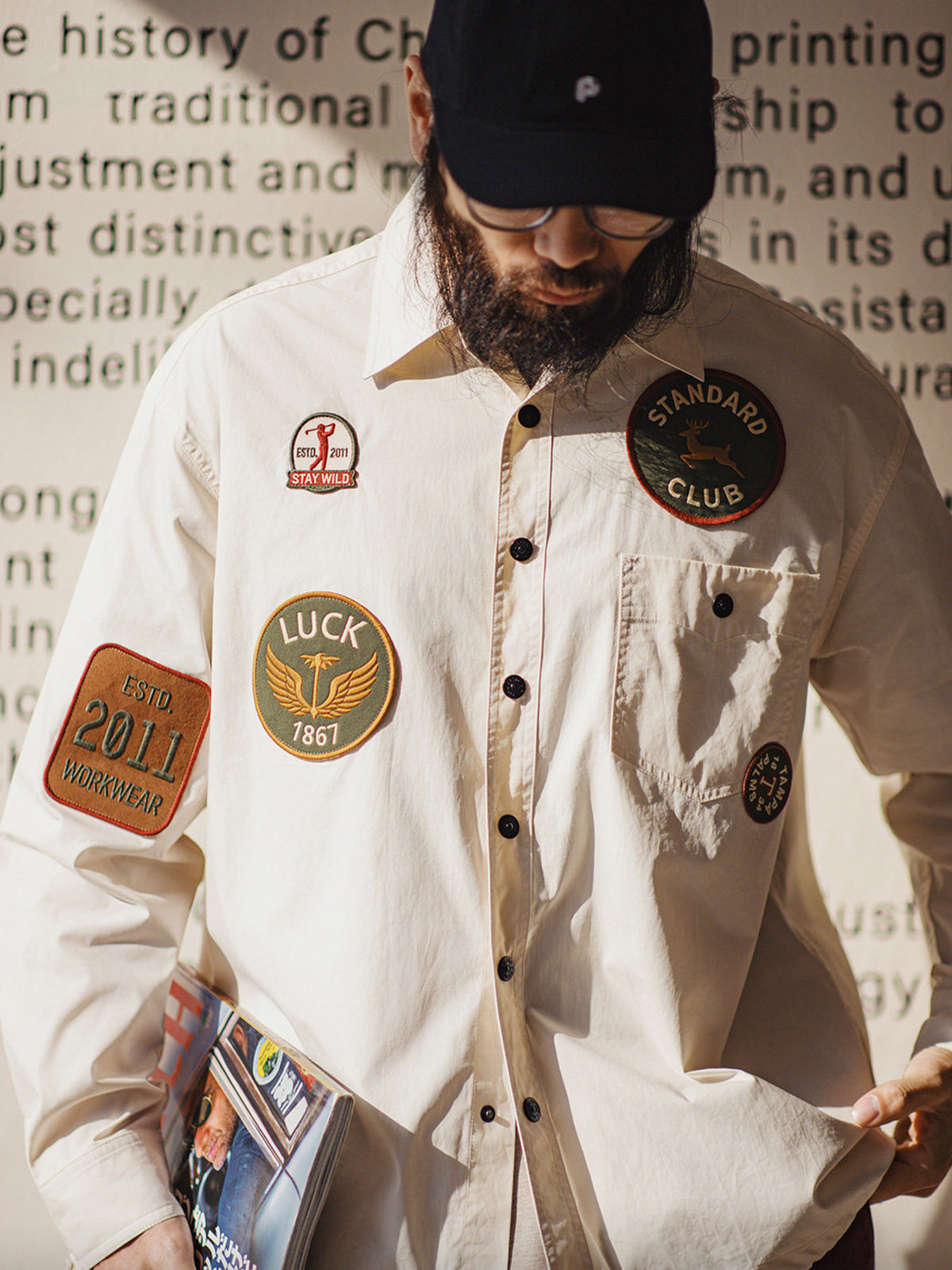 “Badge Club” Embroidered Long-Sleeve Work Shirt with Styled Hem