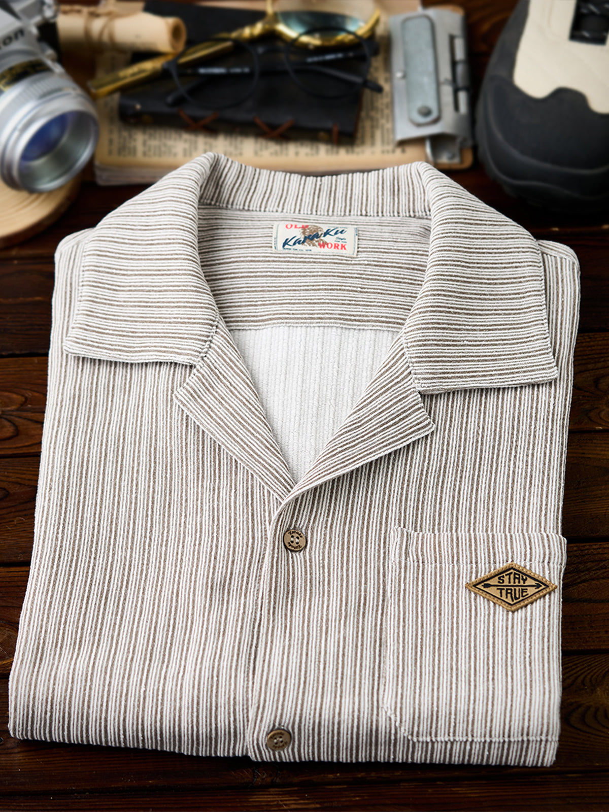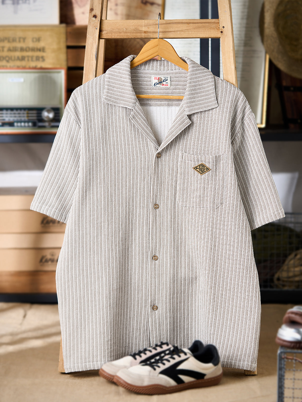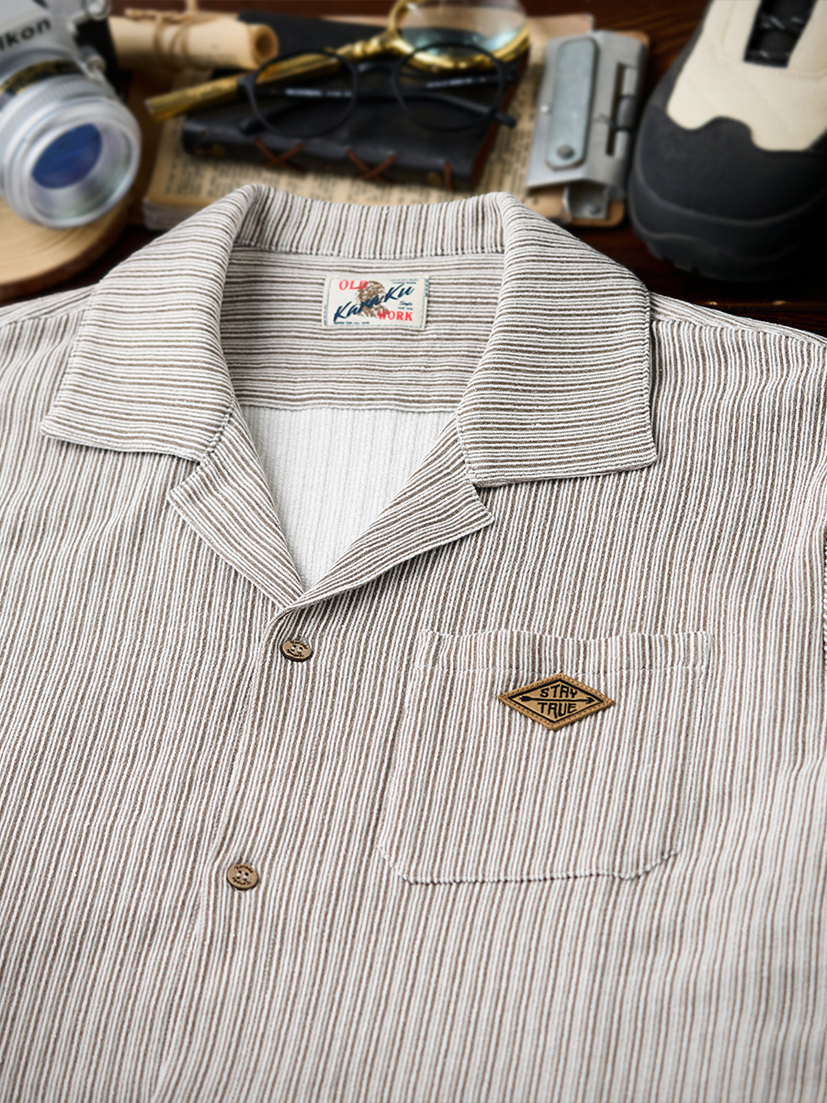 [Pre-order] “STAY TRUE” Embroidered Patch Striped Textured Knit Cuban Shirt