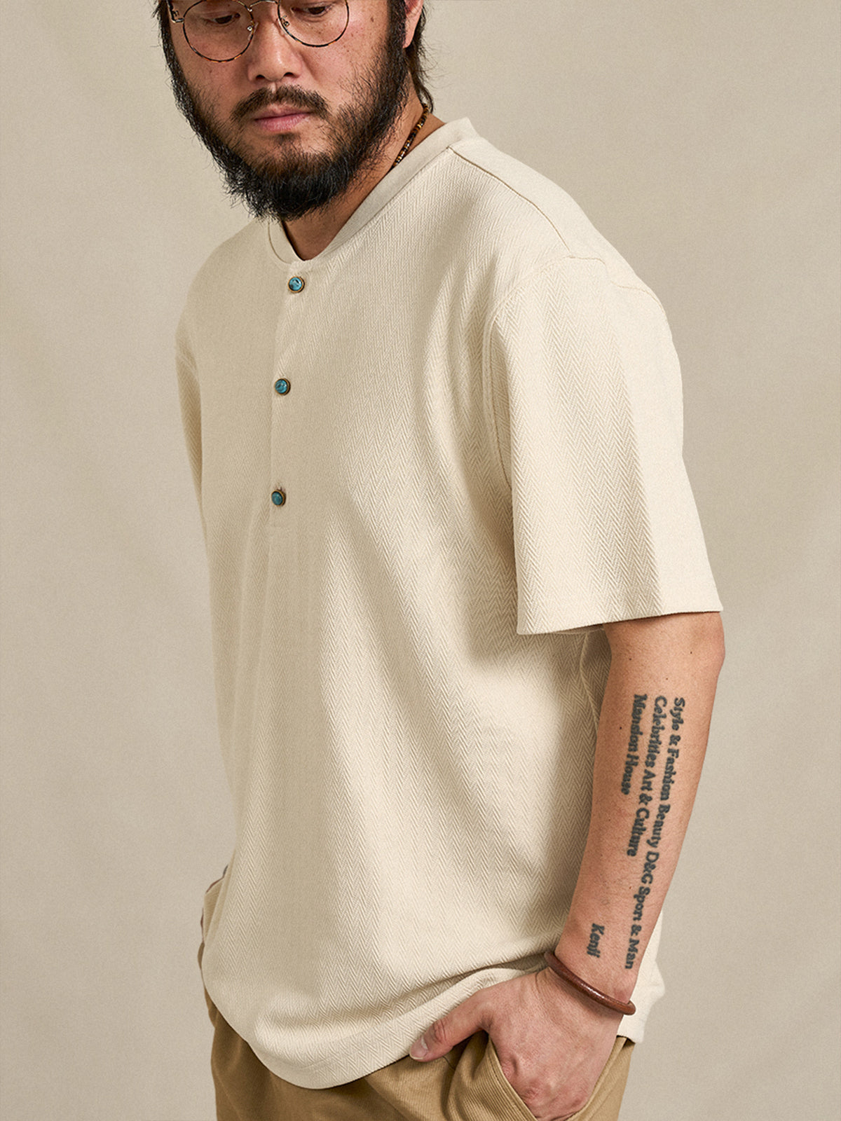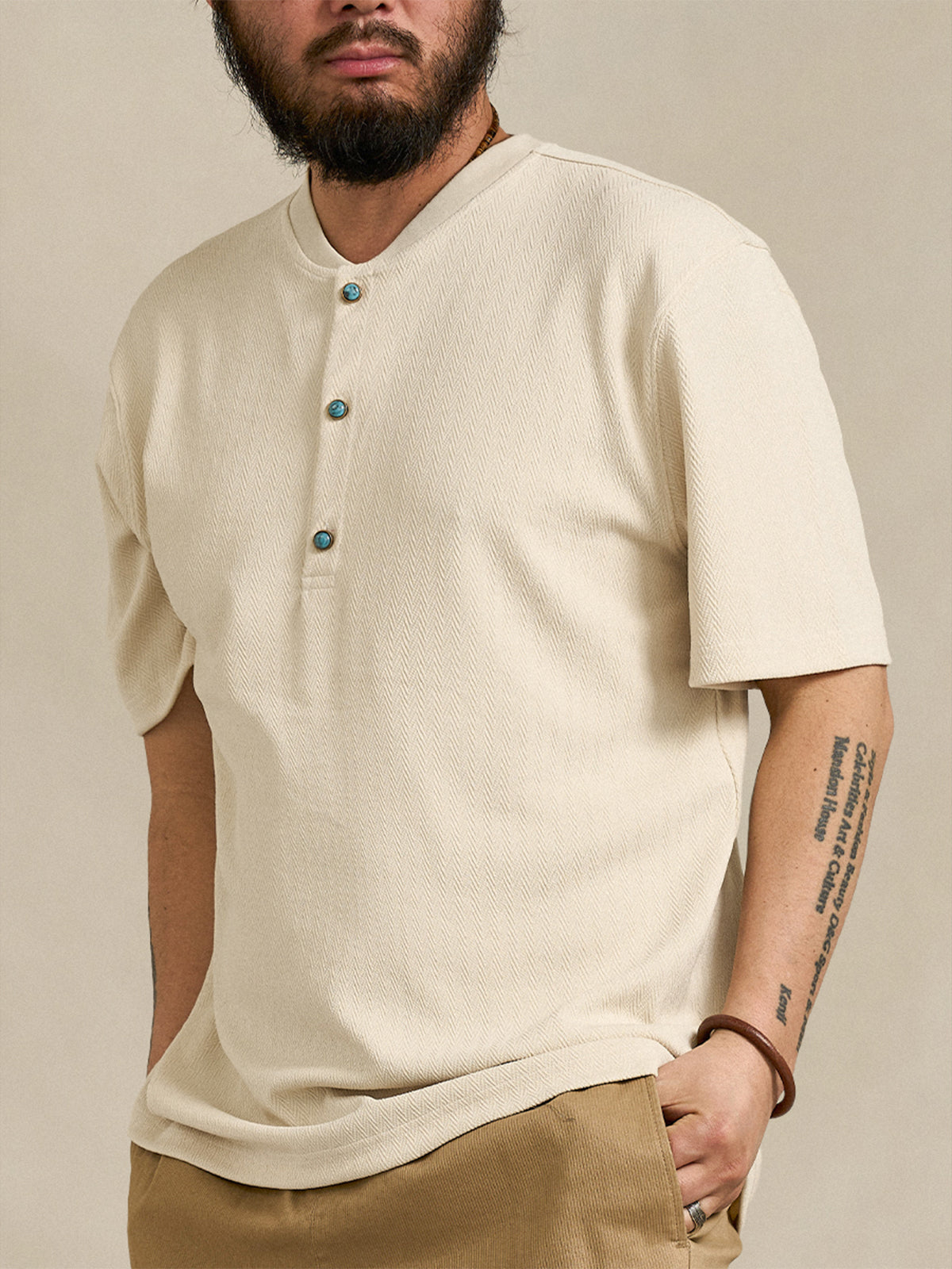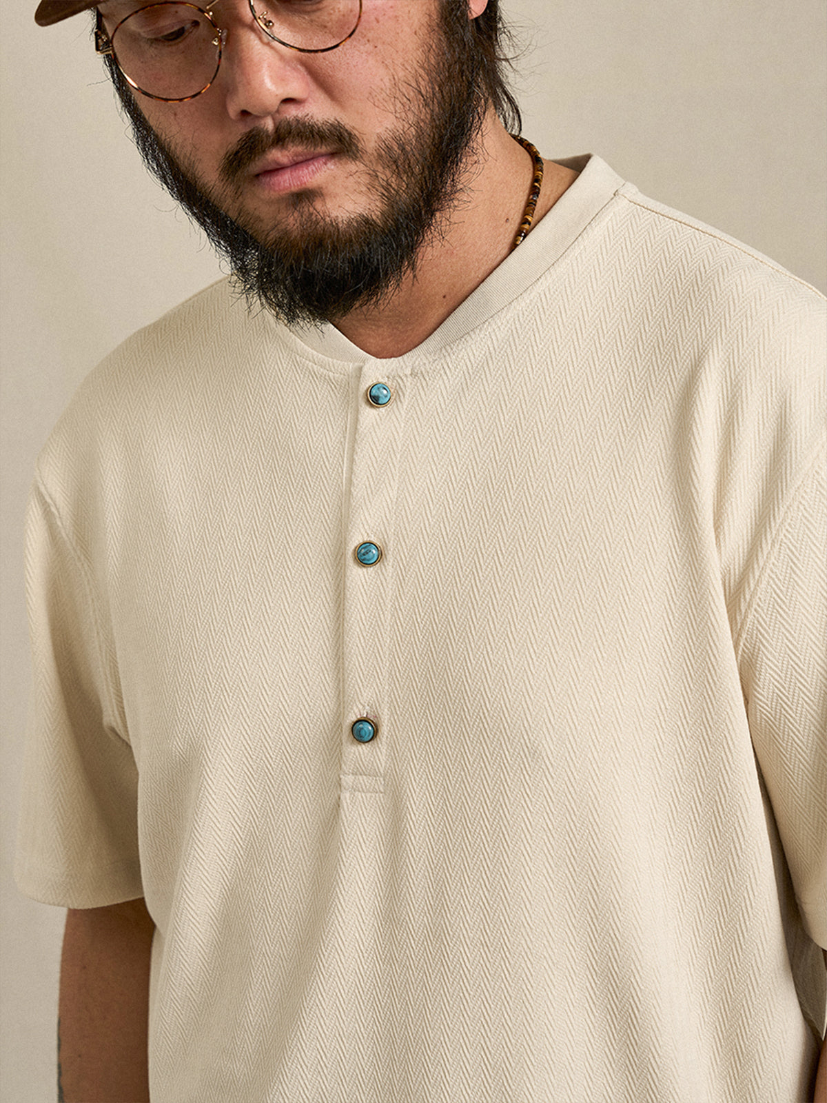 [Pre-order] Turquoise-Style Button Herringbone Jacquard Henley T-Shirt