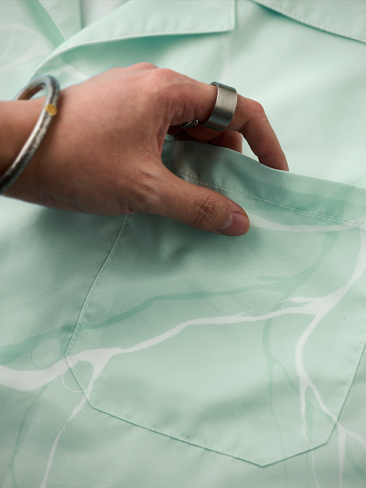 [Pre-order] “Karaku” Embroidered Color-Block Linen-Like Open Collar Shirt