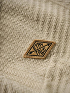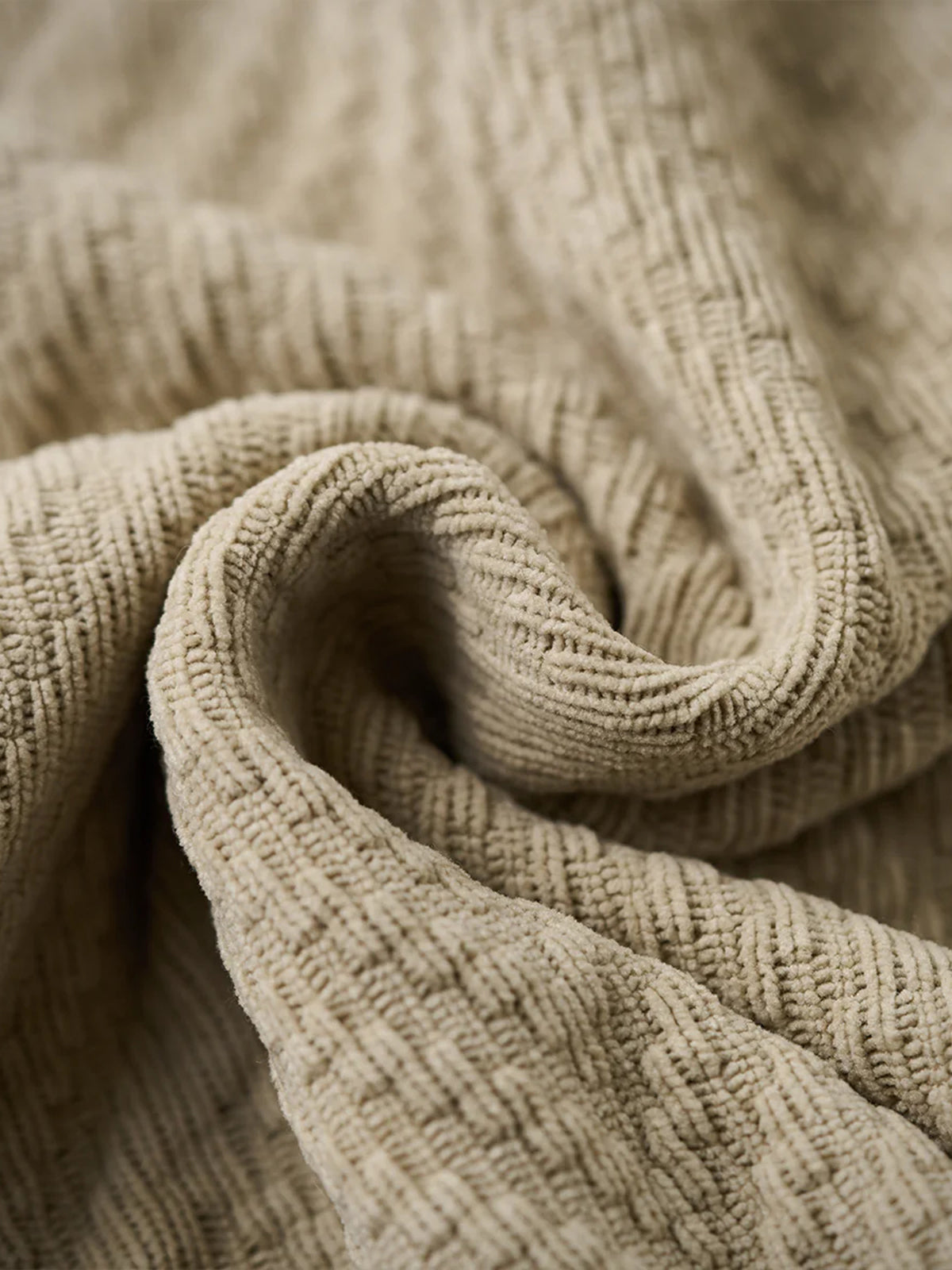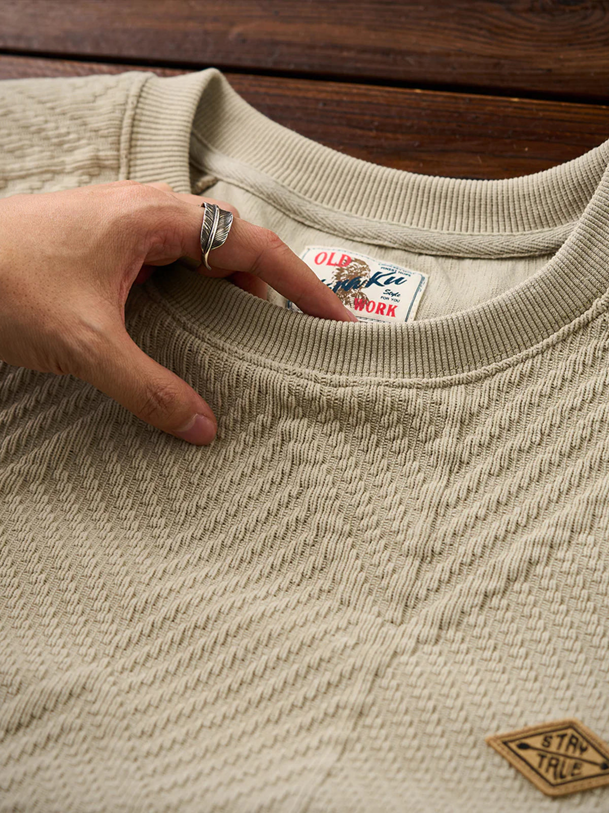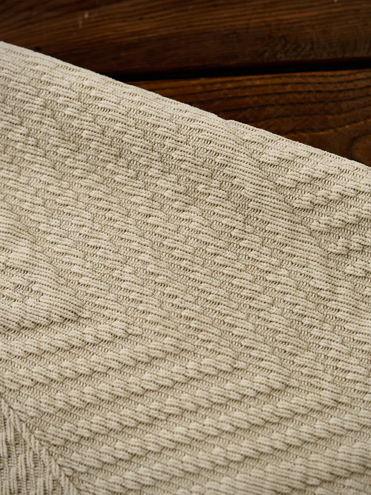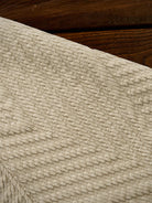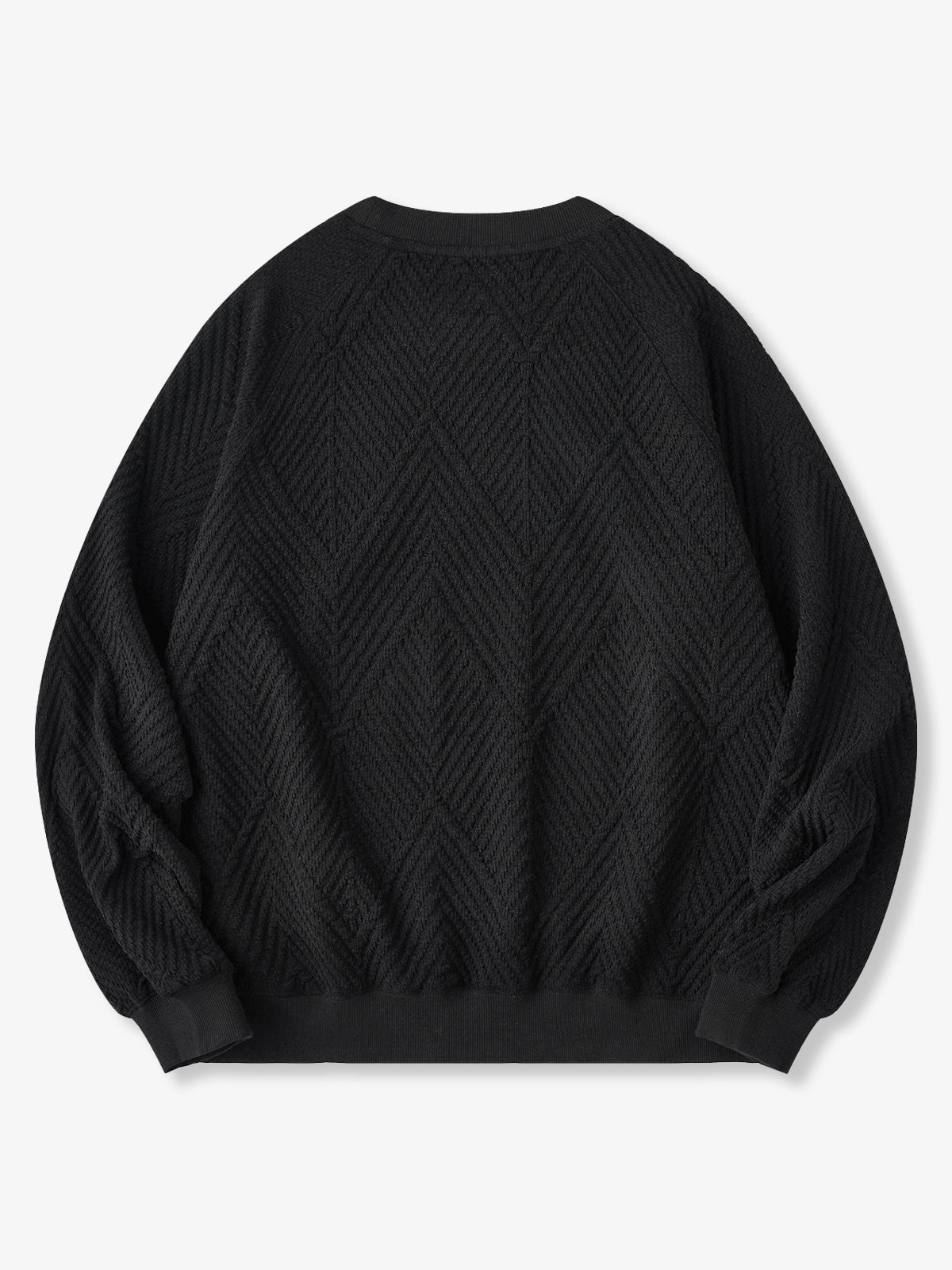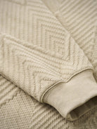 The zigzag pattern is applied across the entire garment, creating a dynamic sense of movement. Made with jacquard weaving, the fabric itself features a raised pattern, giving a simple yet visually rich and layered impression.