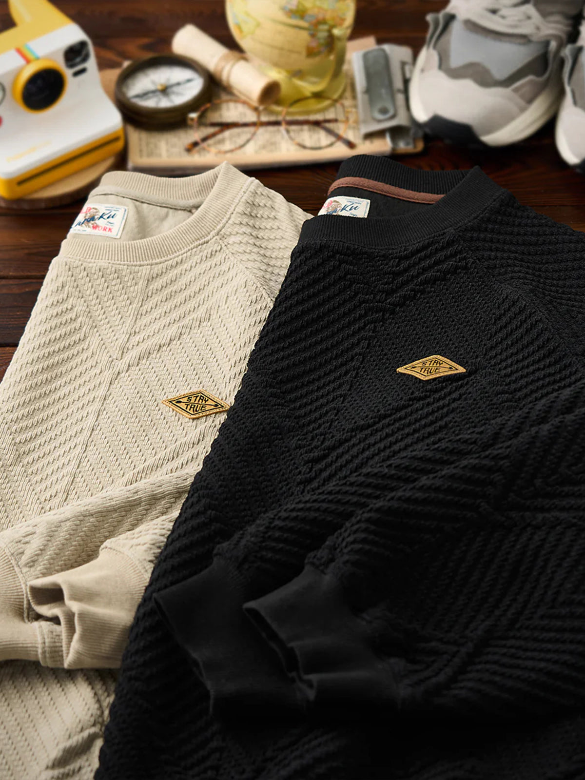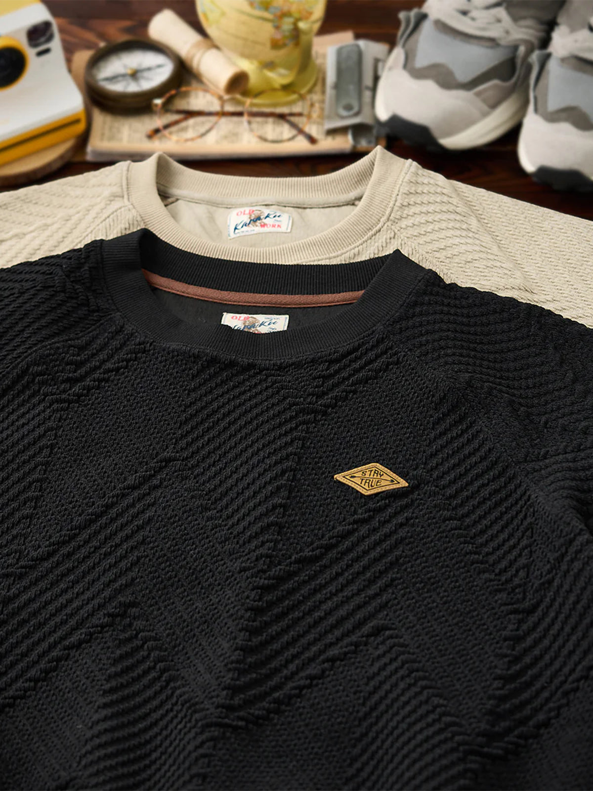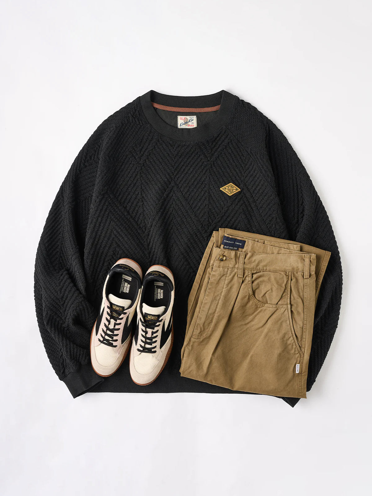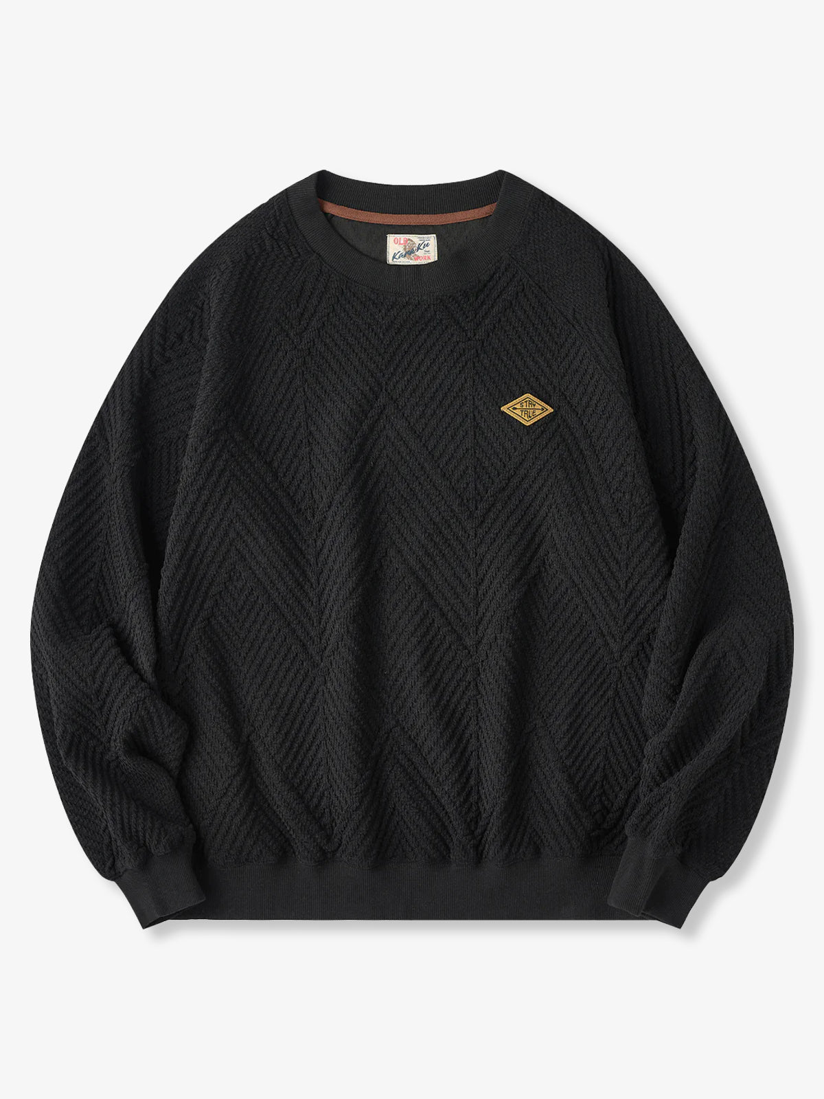 "STAY TRUE" Embroidered Patch Zigzag Jacquard Knit Sweatshirt