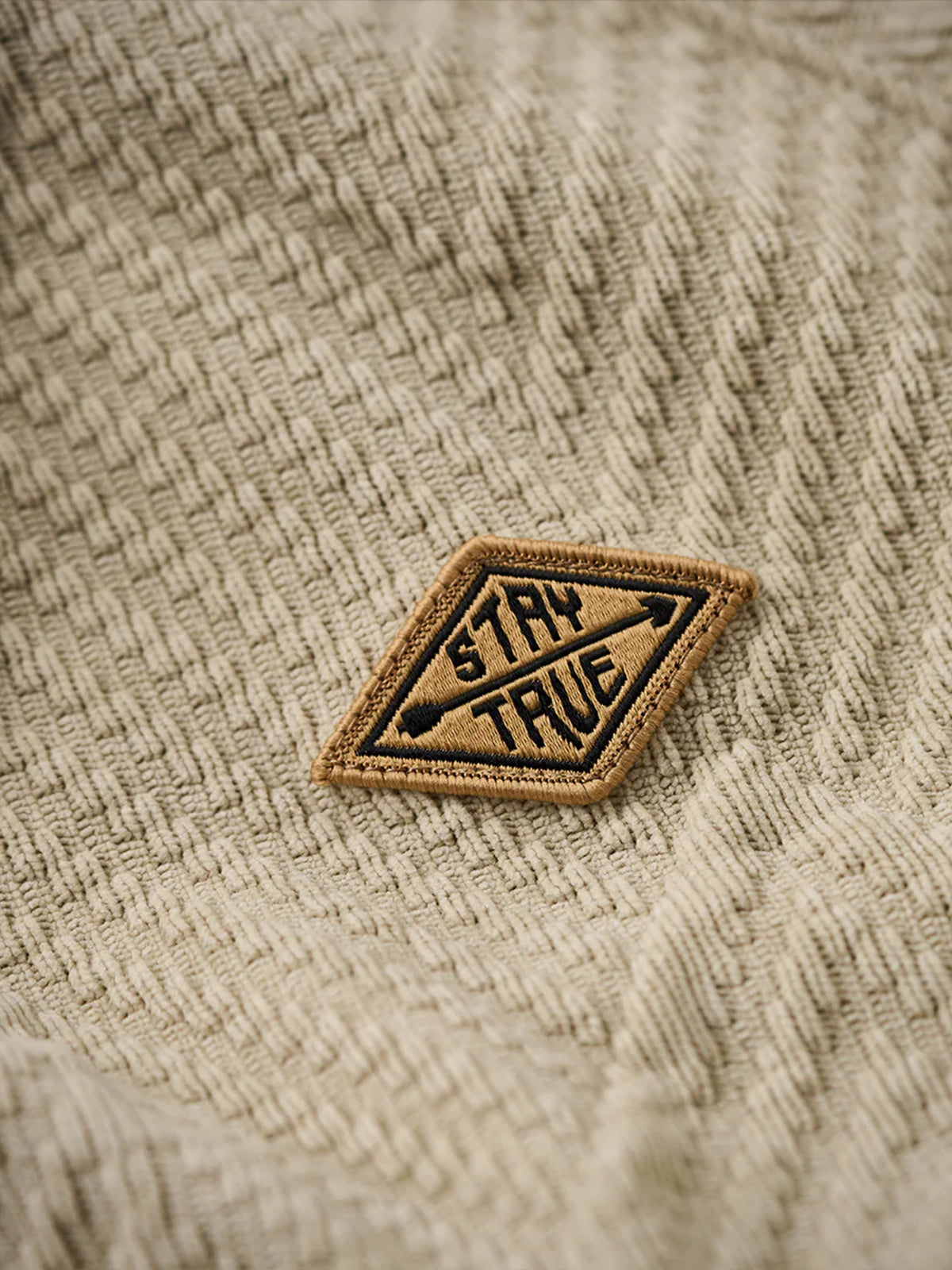 A “STAY TRUE” embroidered patch is placed on the left chest, offering a simple yet distinctive accent. The yellow patch stands out against the overall dark color, drawing attention.