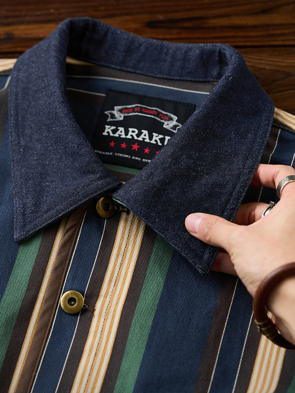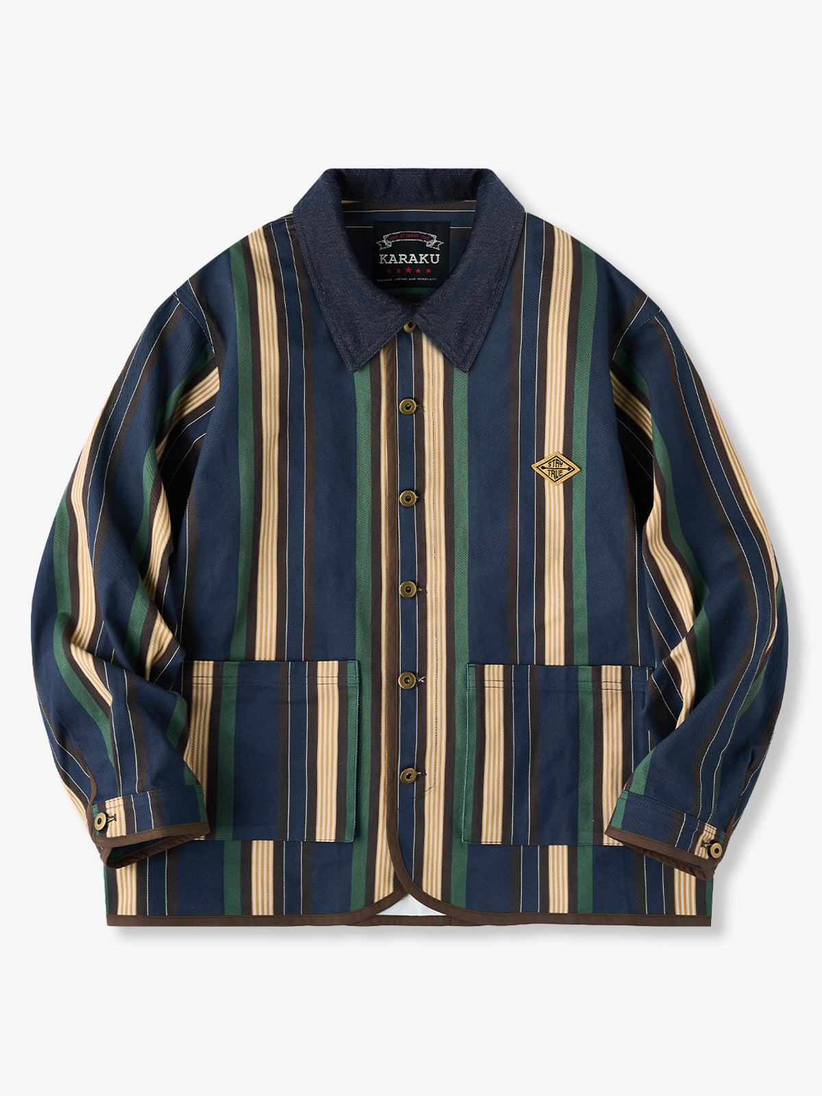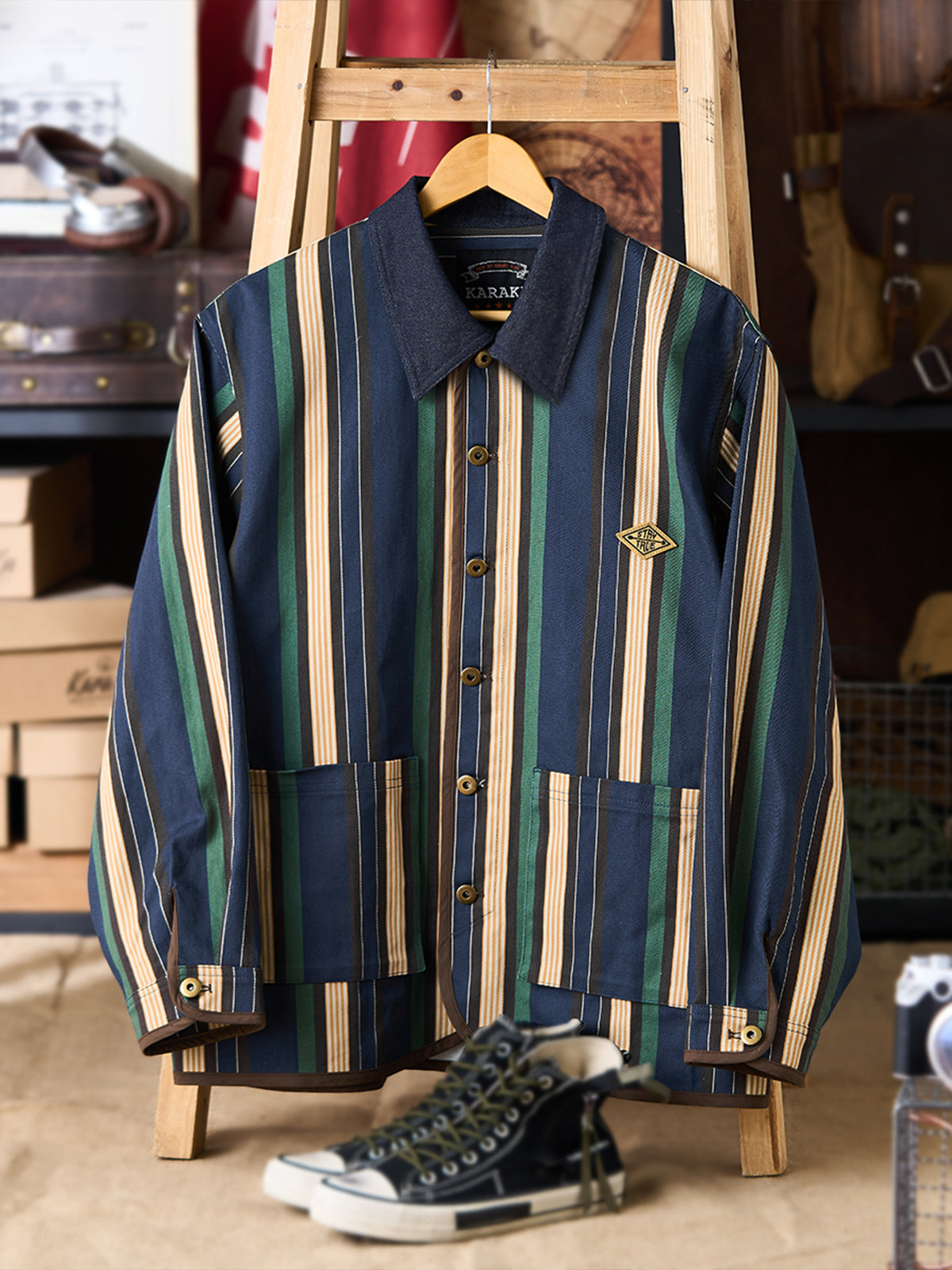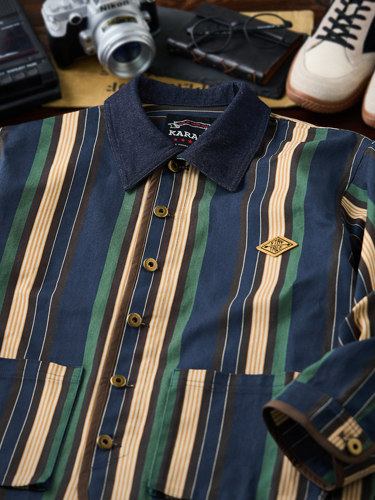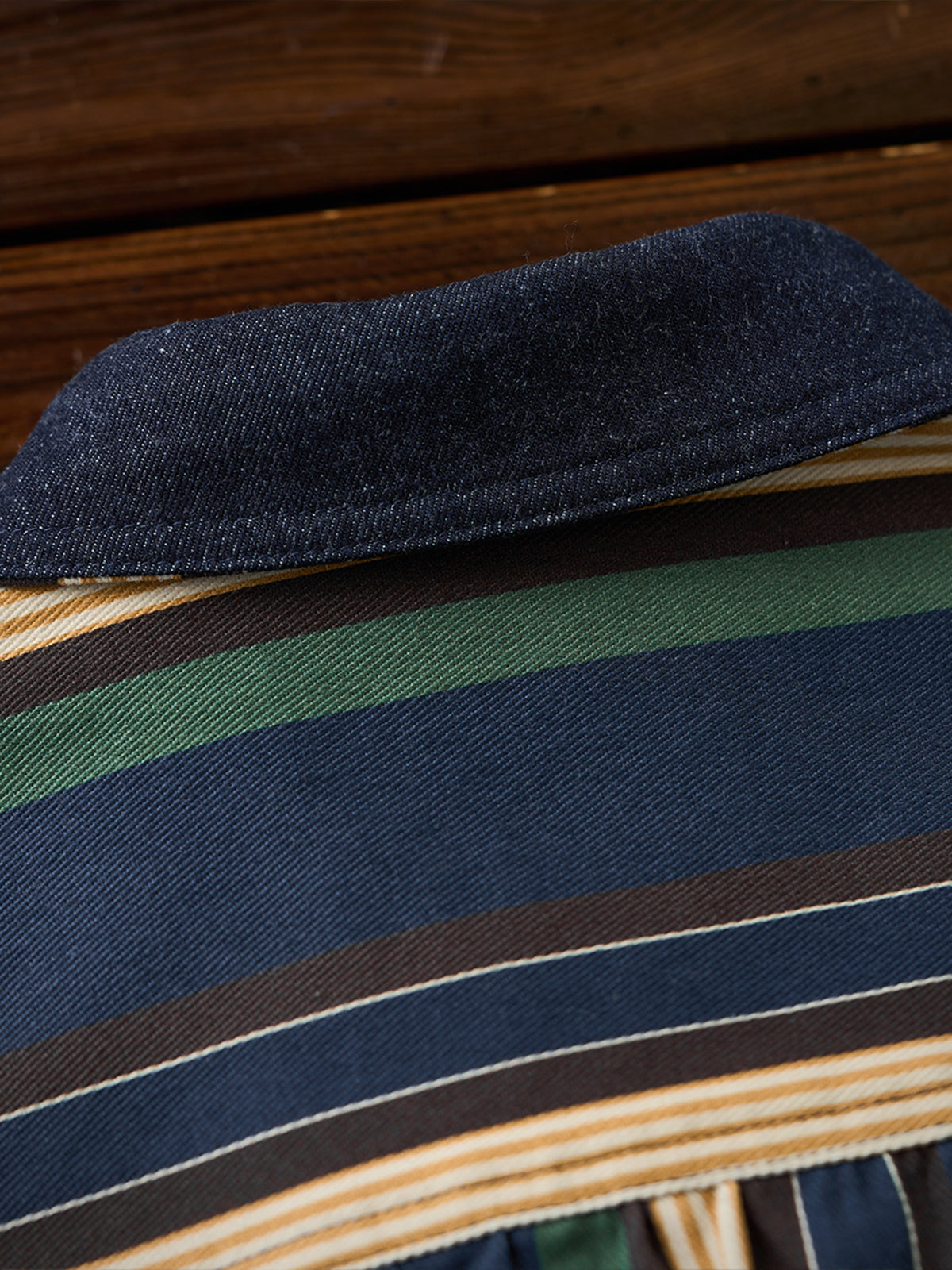 A denim collar contrast multi-stripe jacket with a design that catches the eye by combining different expressions. The body features a rhythmic multi-stripe pattern, while the collar is switched to denim, adding a moderate ruggedness and playful touch. An embroidered "STAY TRUE" patch is placed on the chest, subtly conveying the message of “staying true to yourself” as an accent, adding a gentle story to your styling. The silhouette is designed with a comfortable amount of room, making it easy to layer over any innerwear. Simply layering over a shirt or sweatshirt turns this jacket into the focal point of your outfit. It is a standout piece suitable for everyday wear or weekend styling.