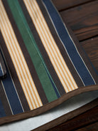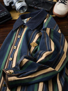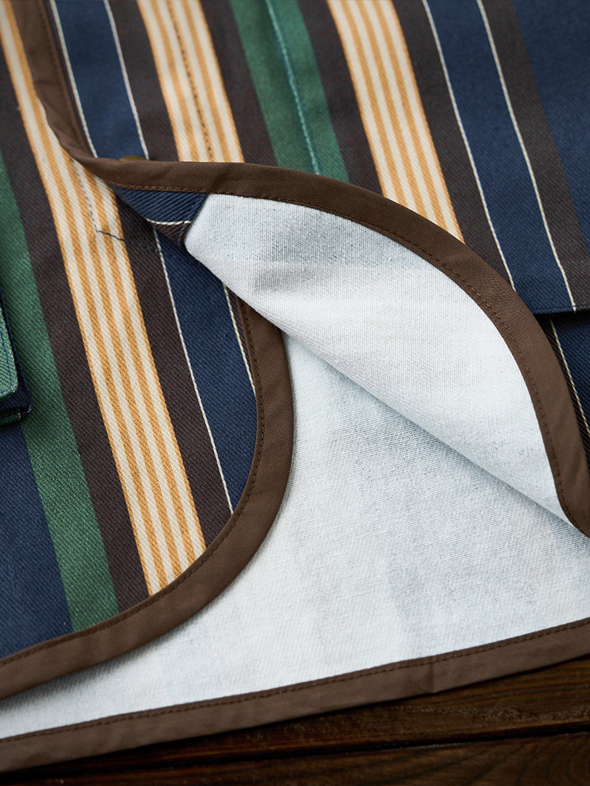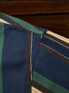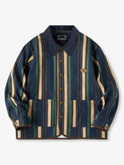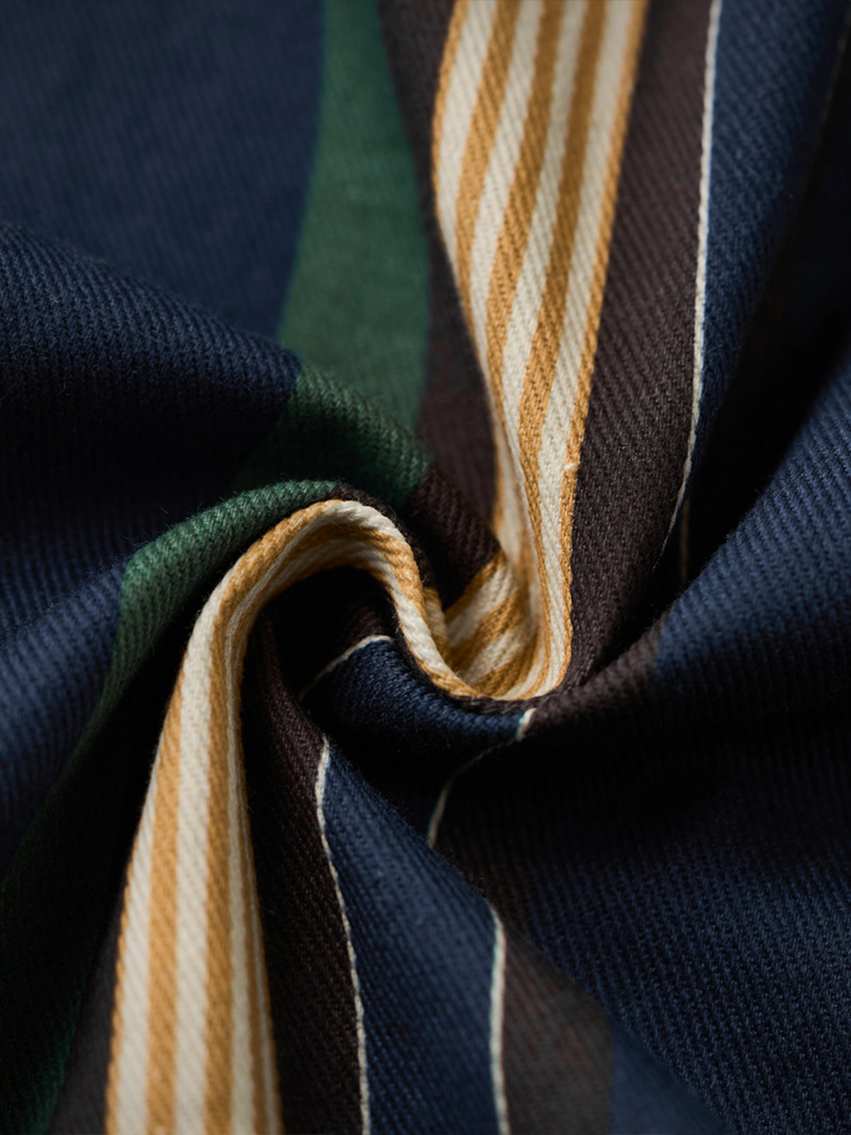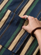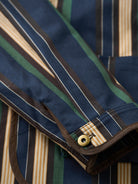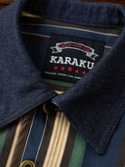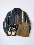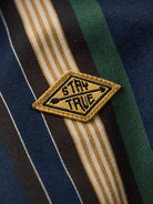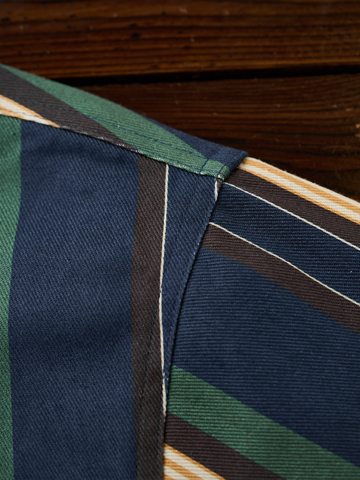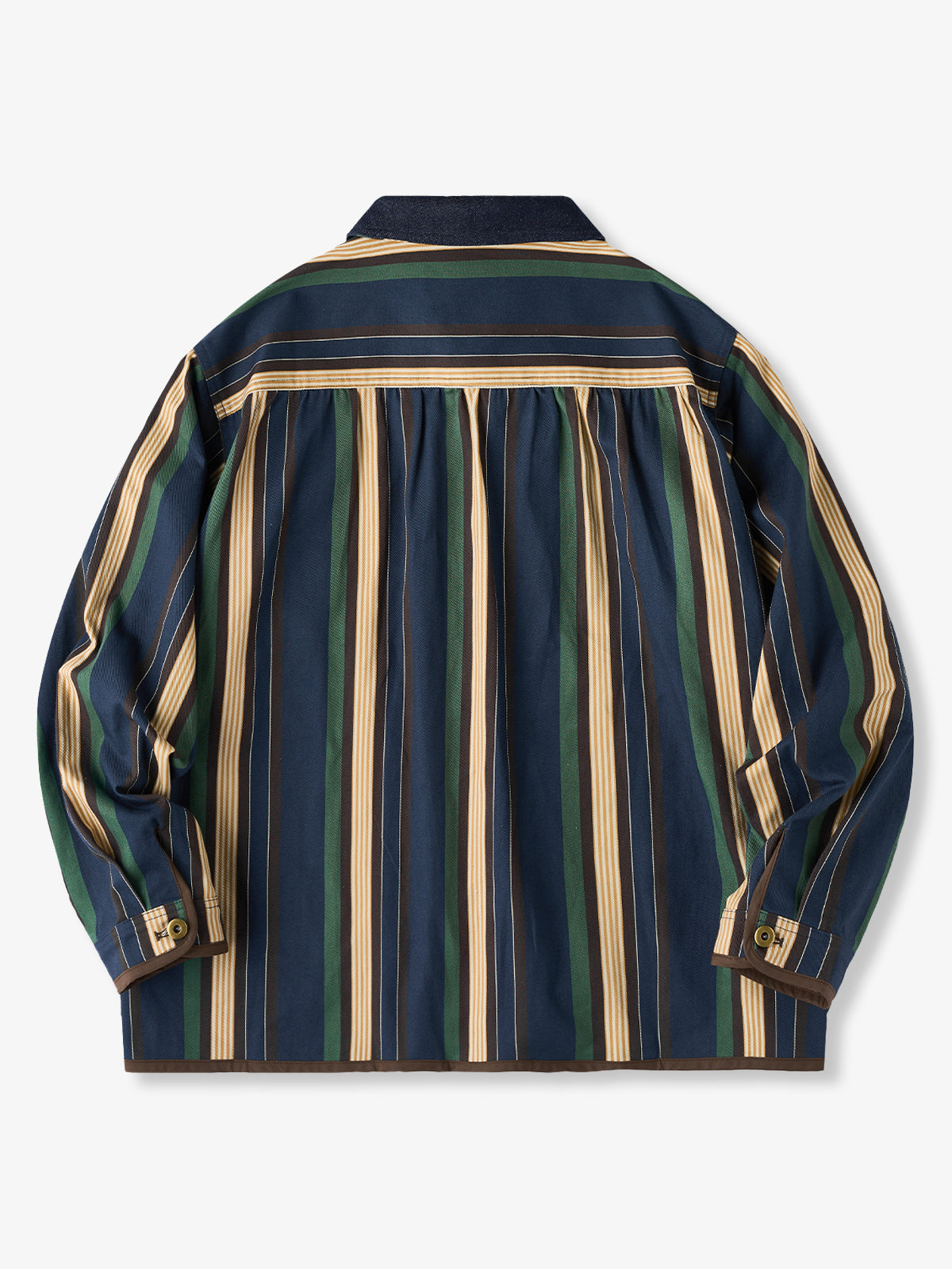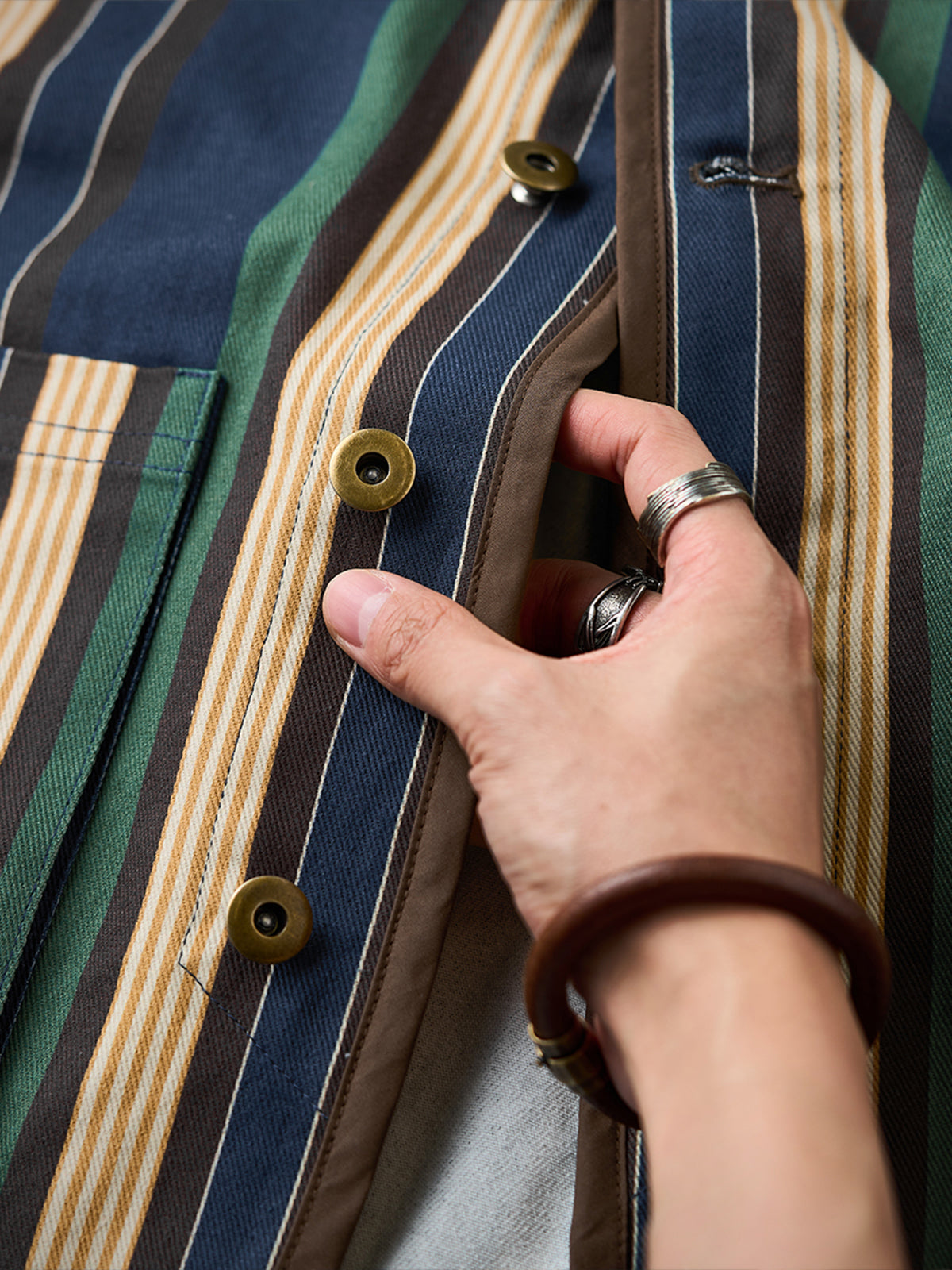 A denim collar contrast multi-stripe jacket with a design that catches the eye by combining different expressions. The body features a rhythmic multi-stripe pattern, while the collar is switched to denim, adding a moderate ruggedness and playful touch. An embroidered "STAY TRUE" patch is placed on the chest, subtly conveying the message of “staying true to yourself” as an accent, adding a gentle story to your styling. The silhouette is designed with a comfortable amount of room, making it easy to layer over any innerwear. Simply layering over a shirt or sweatshirt turns this jacket into the focal point of your outfit. It is a standout piece suitable for everyday wear or weekend styling.