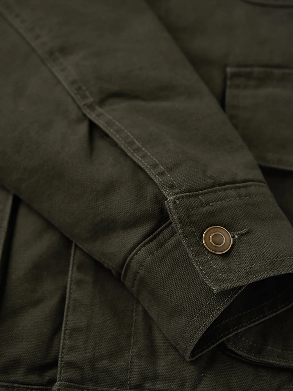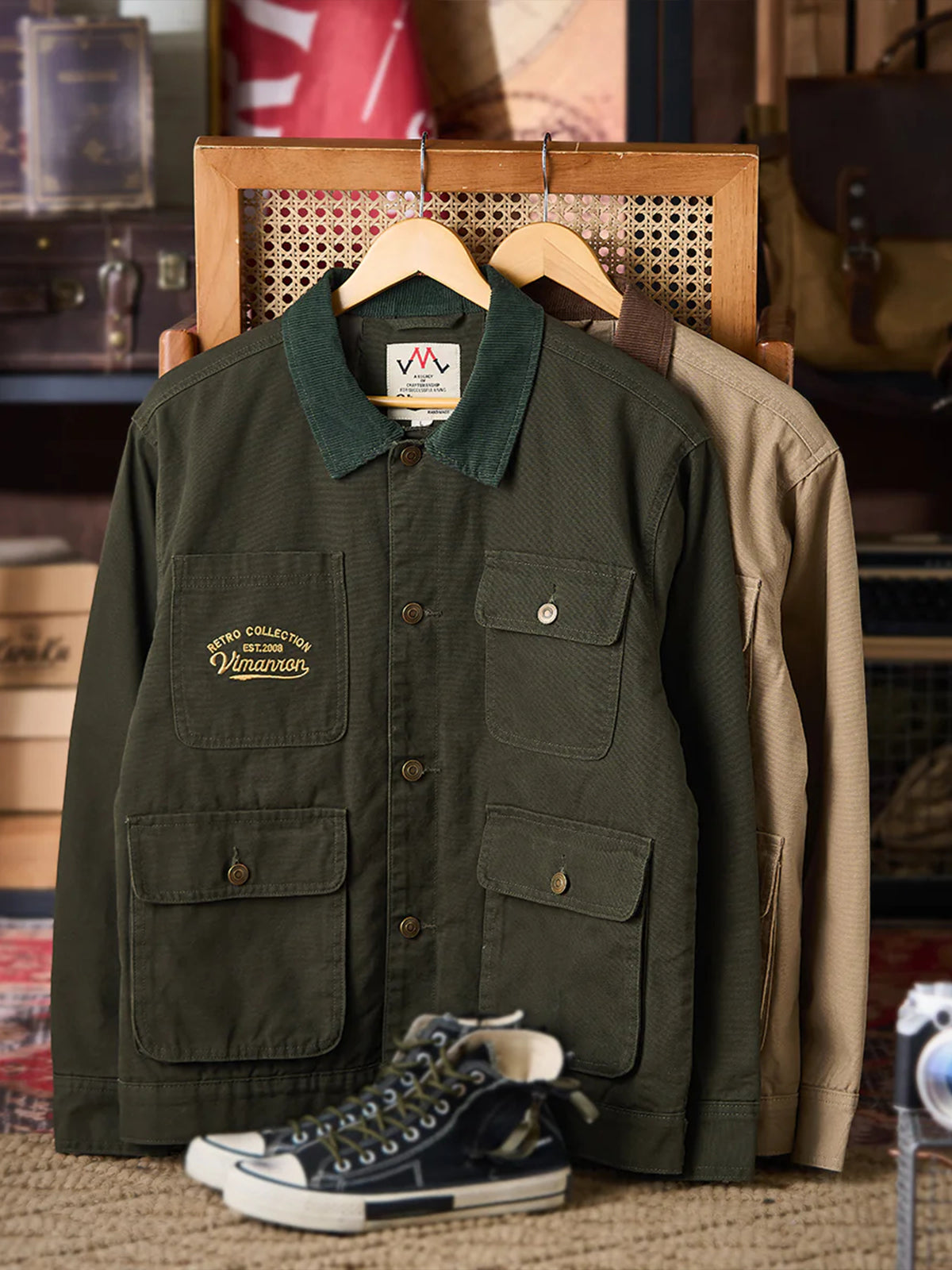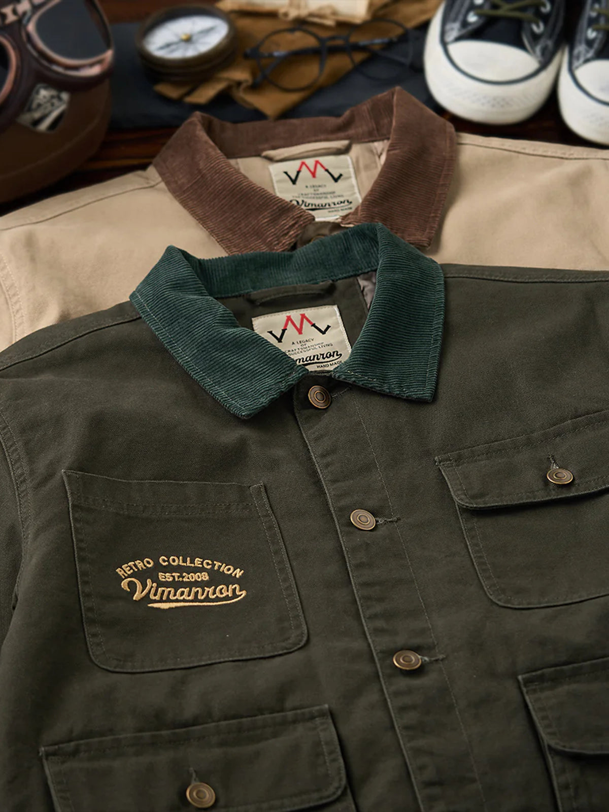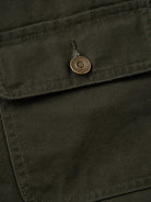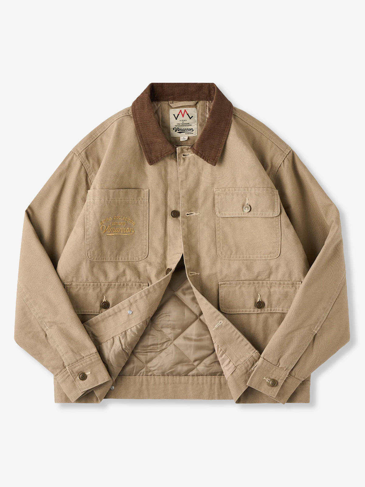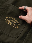 The front features four large pockets, designed for high practicality, each secured with buttons to prevent contents from falling out. The embroidery on the chest pocket serves as an important design element, emphasizing the jacket’s vintage feel.