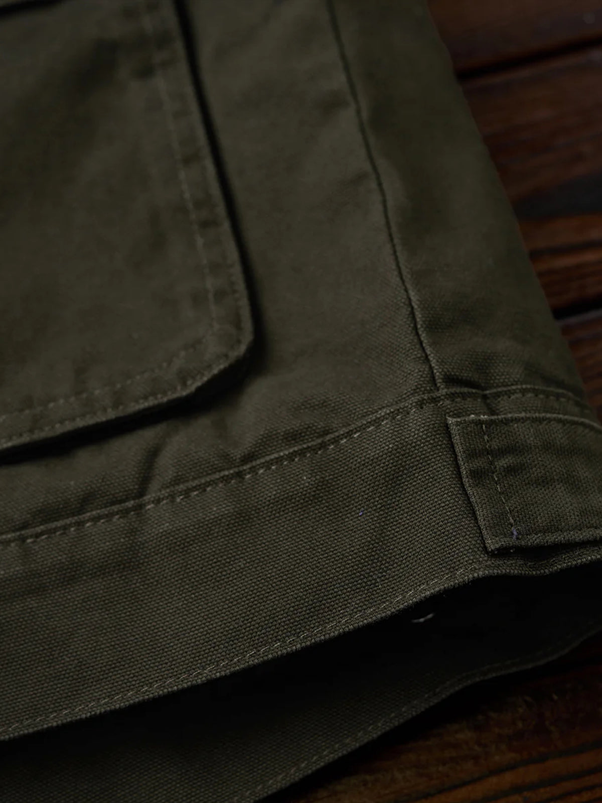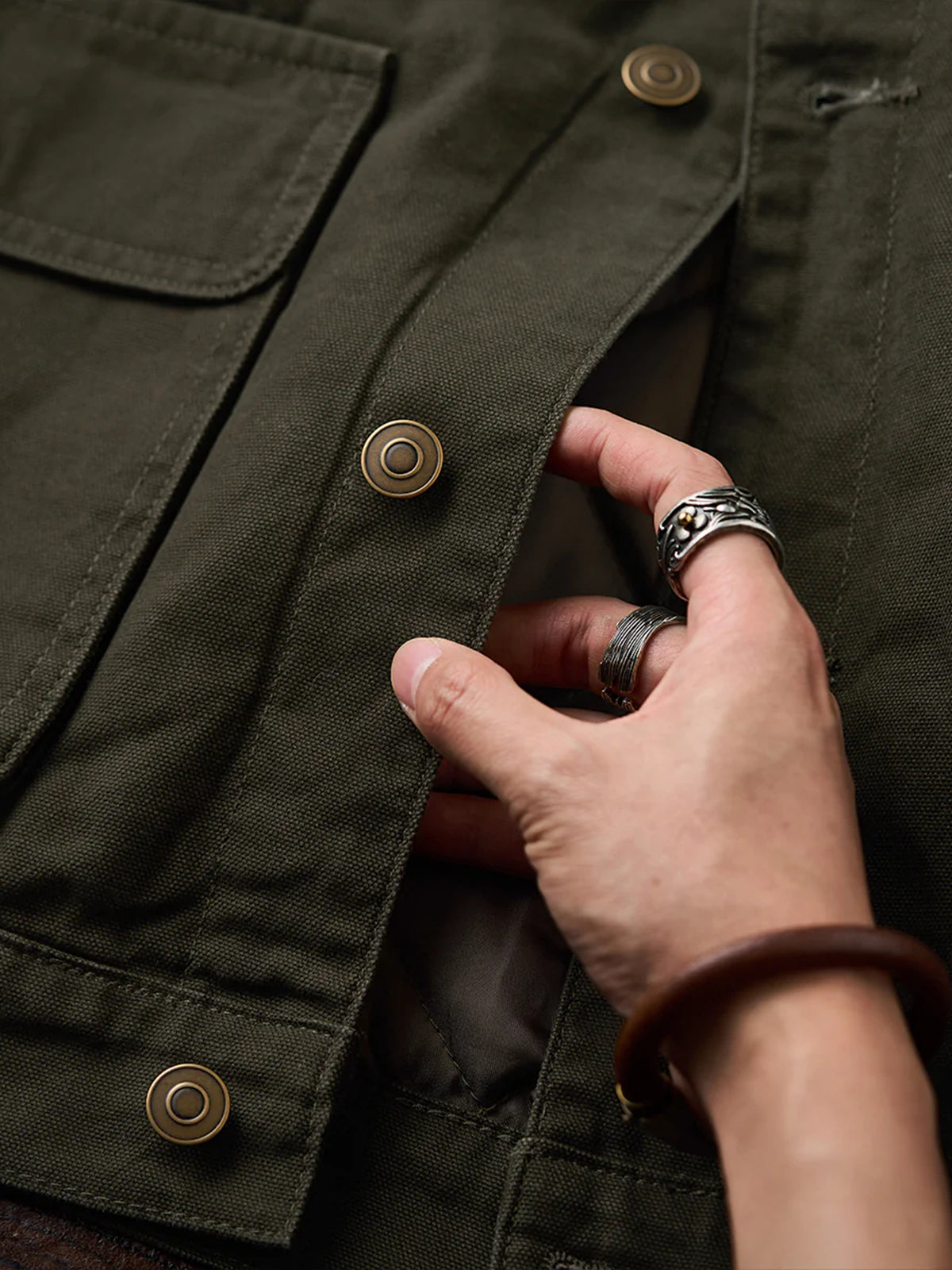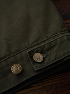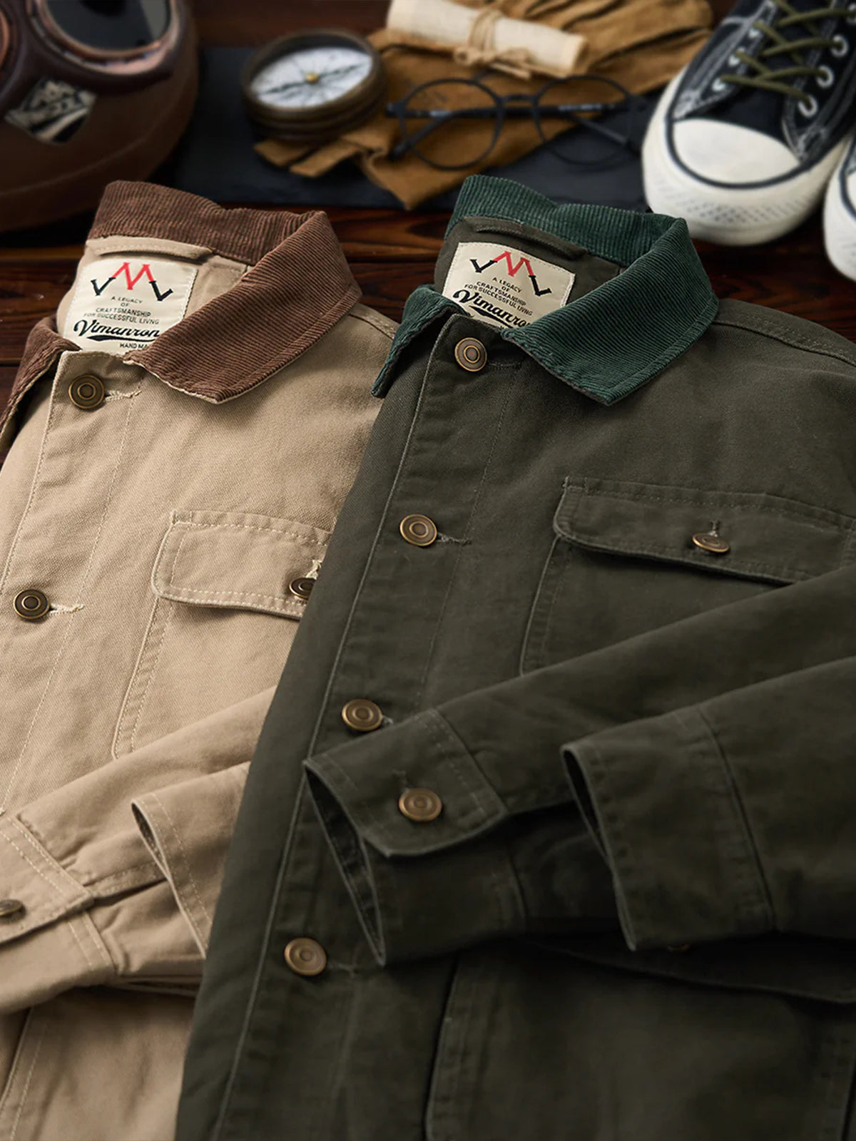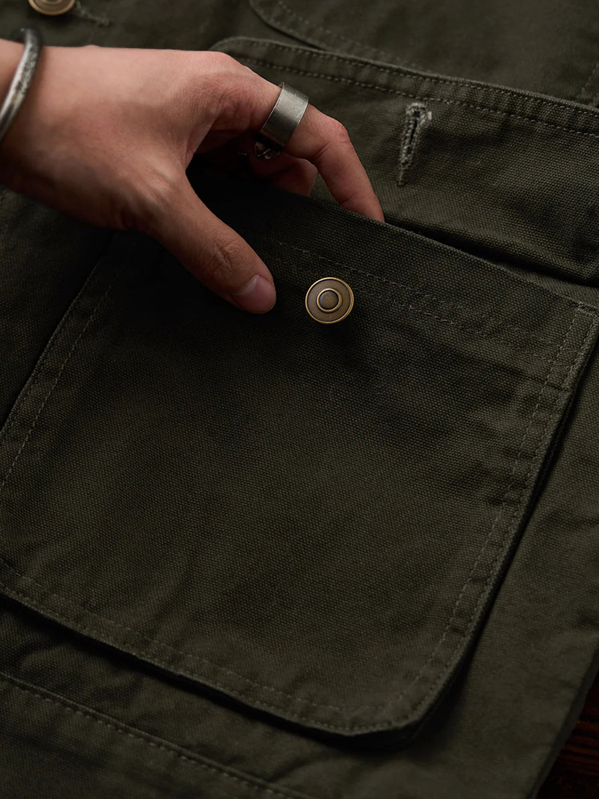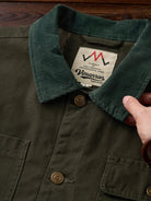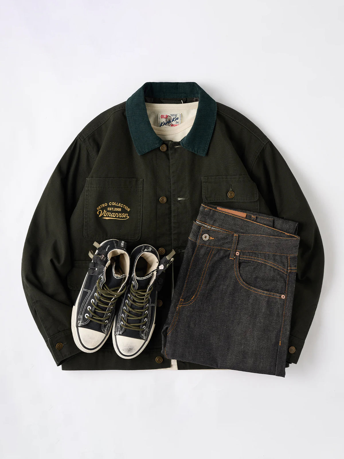 The front features four large pockets, designed for high practicality, each secured with buttons to prevent contents from falling out. The embroidery on the chest pocket serves as an important design element, emphasizing the jacket’s vintage feel.