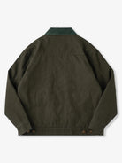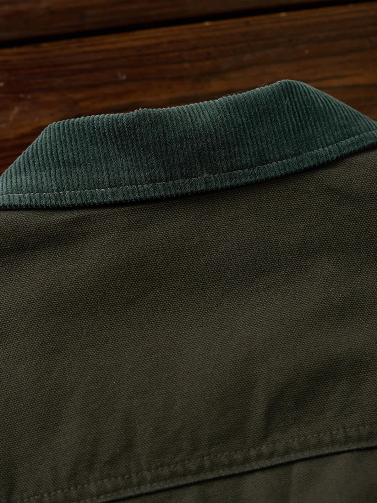 The collar is made from corduroy, providing both durability and a design accent. This mix of materials enhances the overall aesthetic.