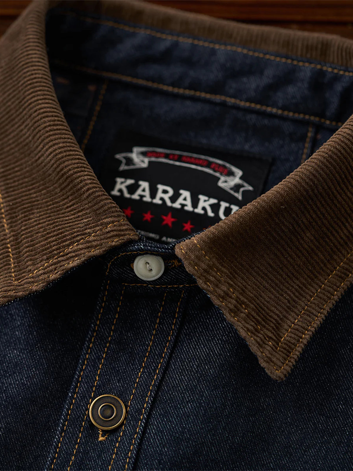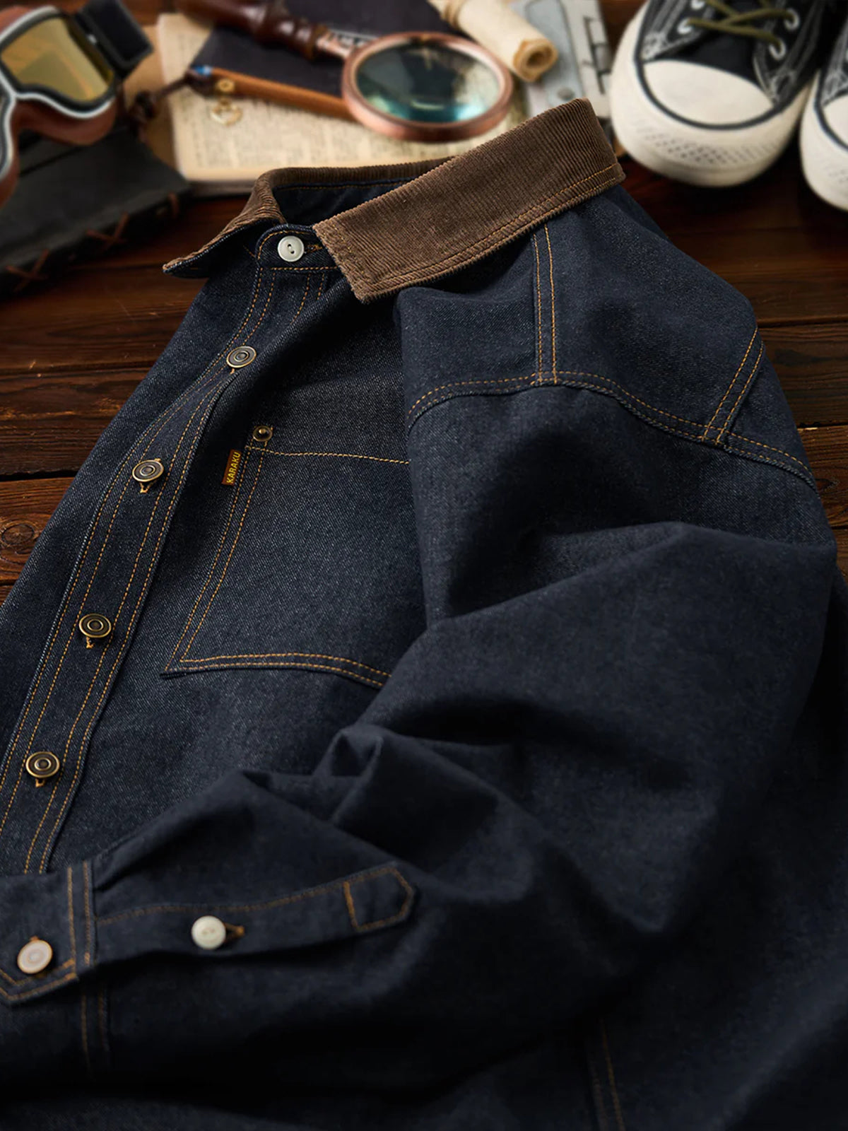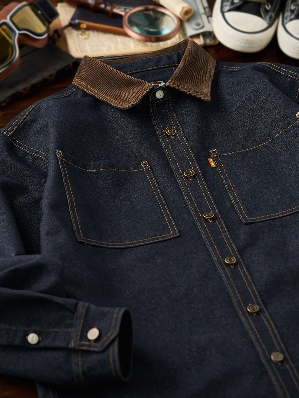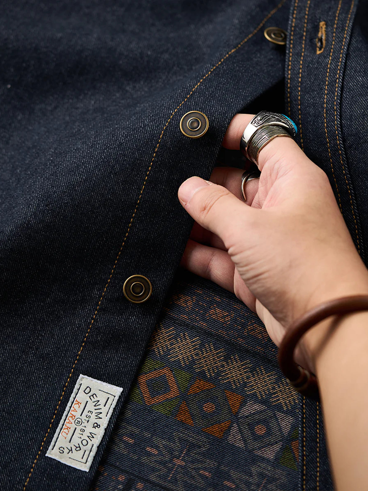 [Pre-Order] Corduroy Collar Denim Work Shirt with Ethnic Pattern Lining