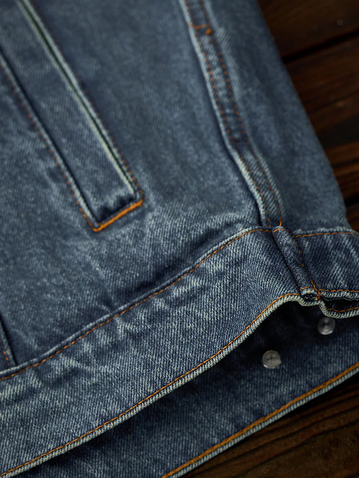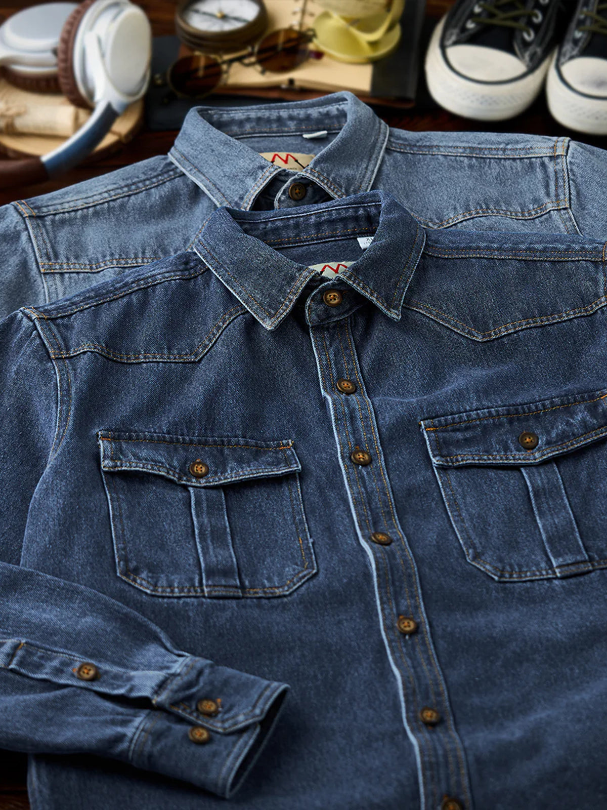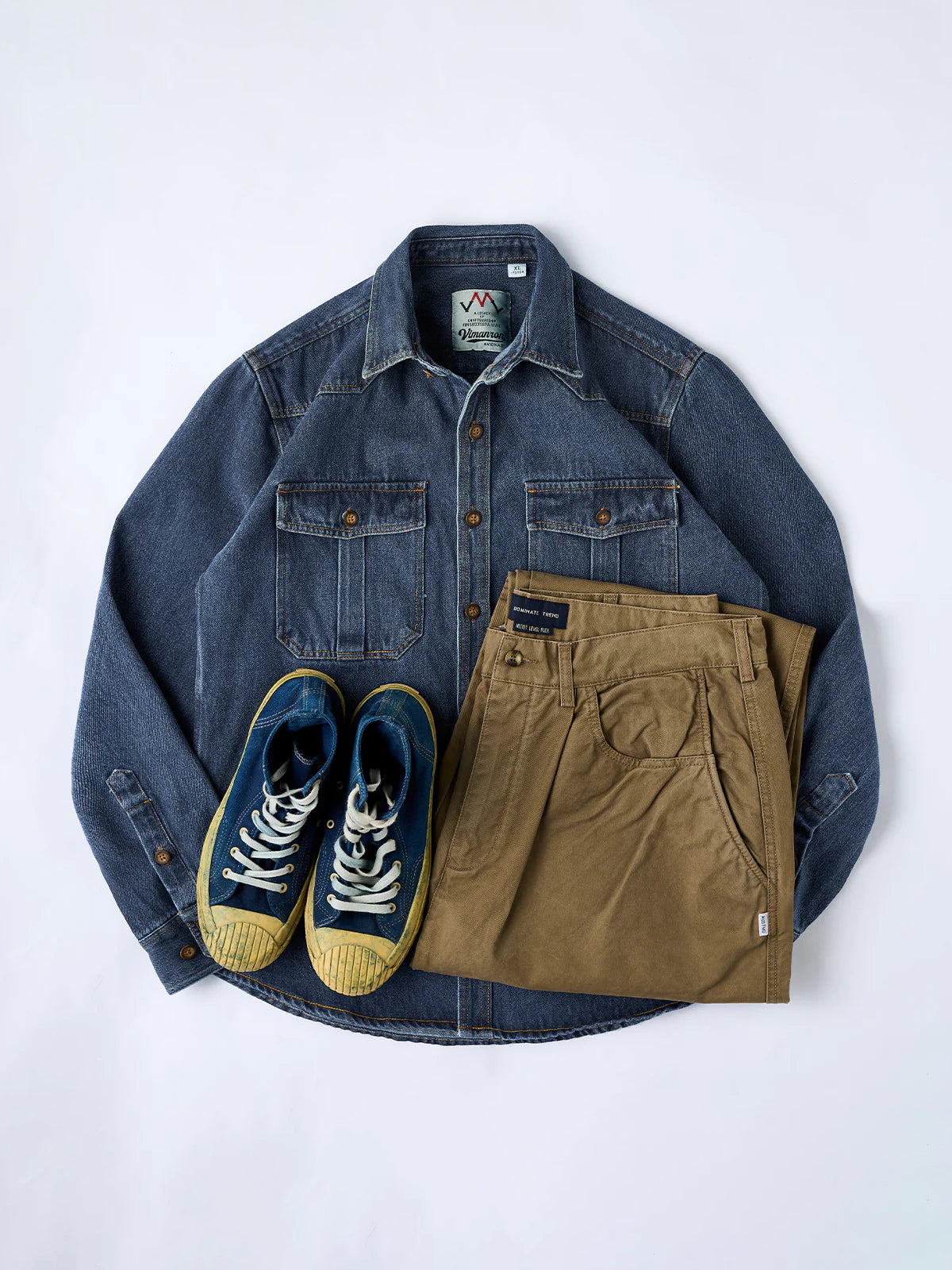 Denim Work Shirt with Fringed Hem & Washed Finish