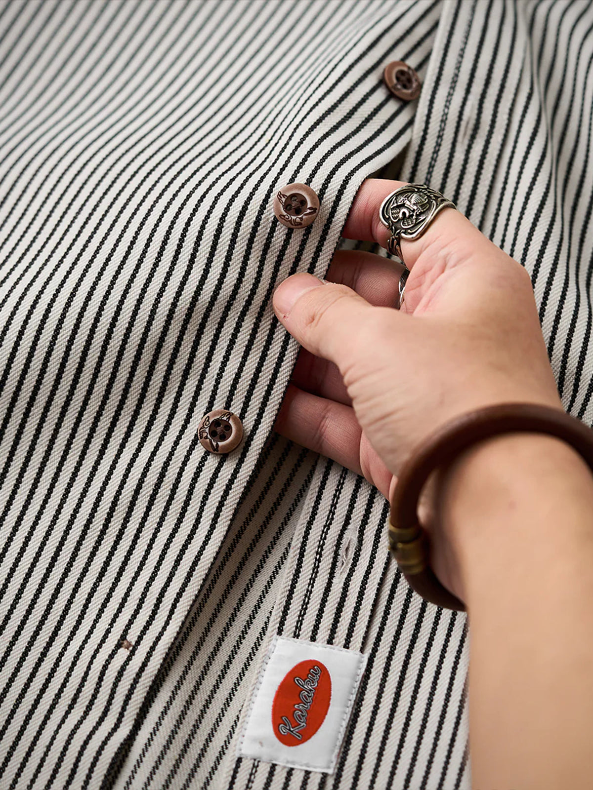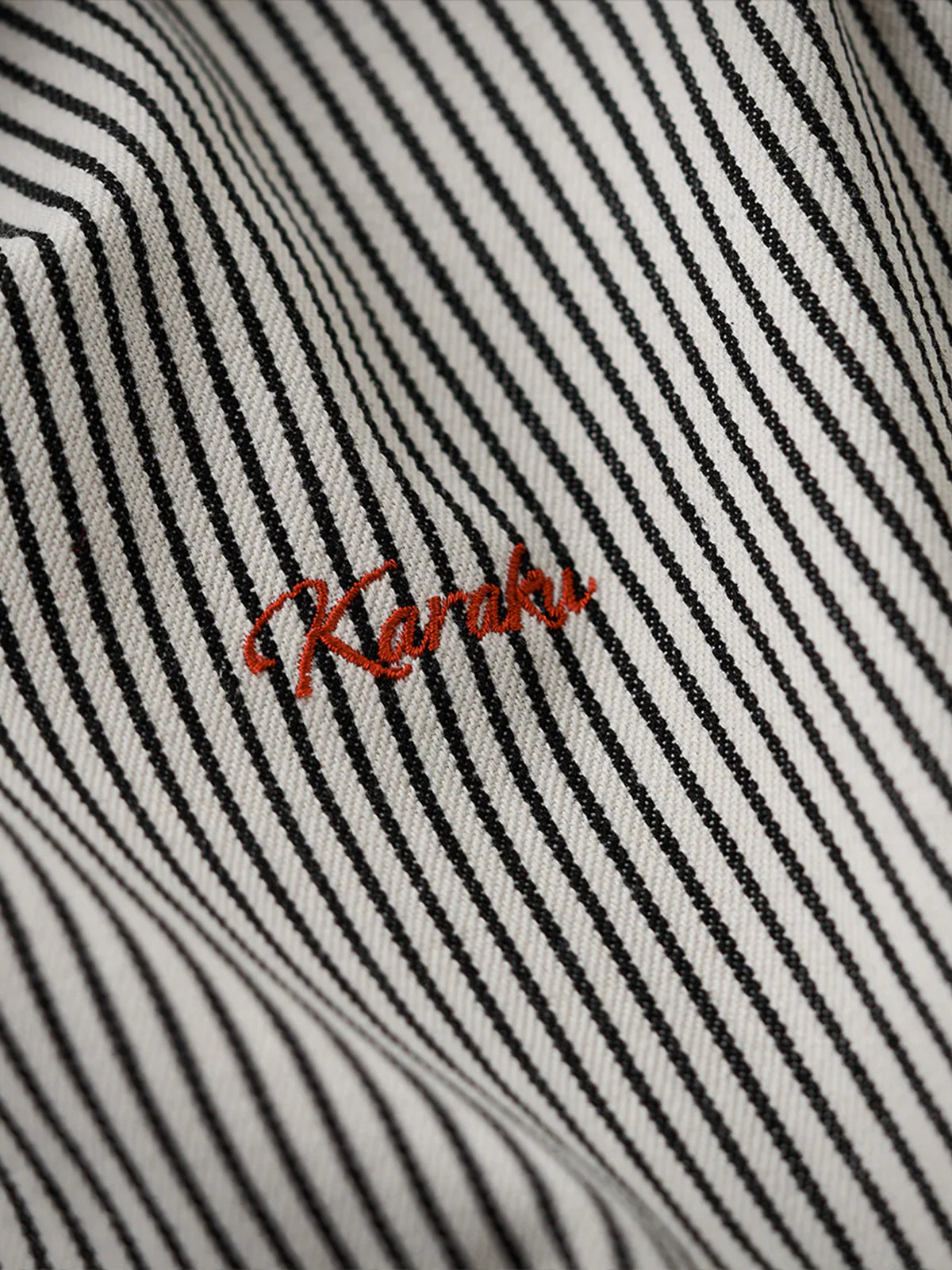 [Pre-Order] ‘Karaku’ Embroidered Logo Striped Long-Sleeve Shirt with Red-White Drawstrings