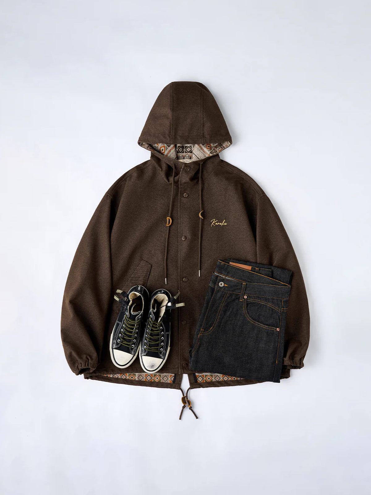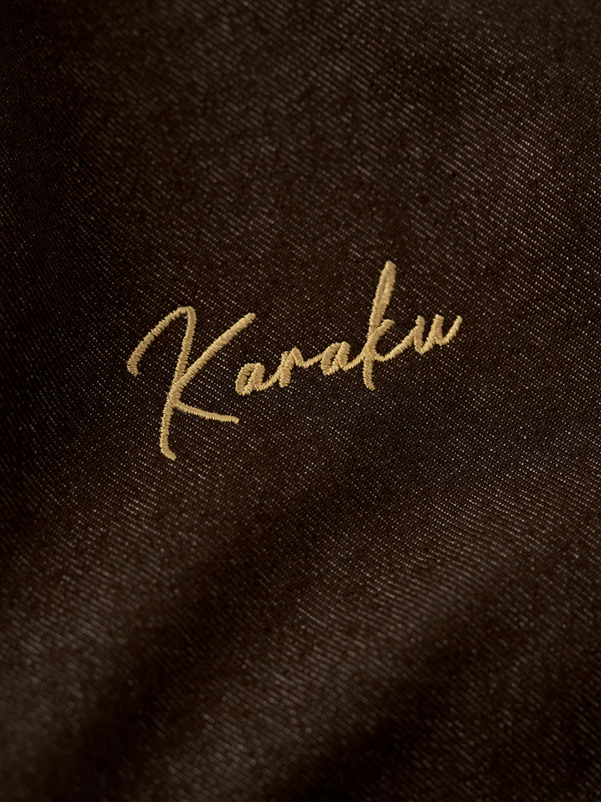 [Pre-Order] Denim Hooded Jacket with ‘Karaku’ Embroidered Logo and Ethnic-Pattern Lining