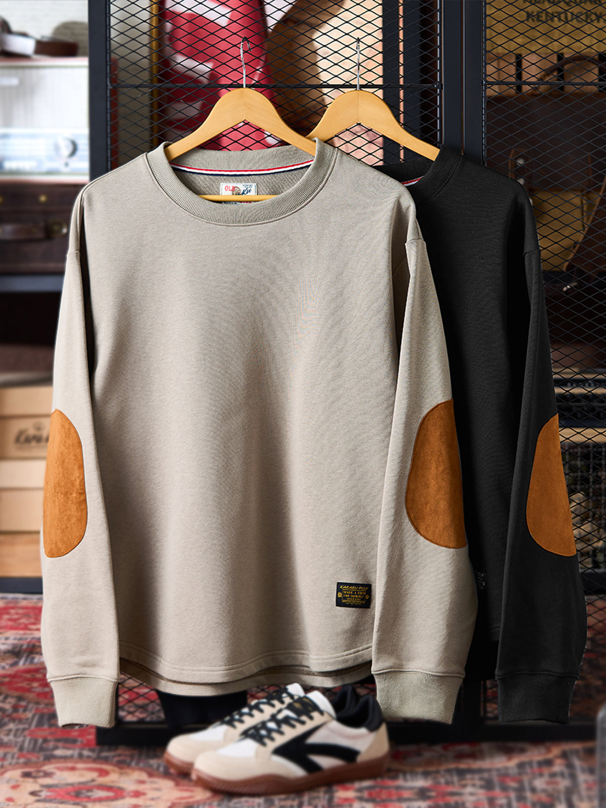 [Pre-Order] Terry-Lined Crewneck Sweatshirt with Red Drawstring & Suede Elbow Patches