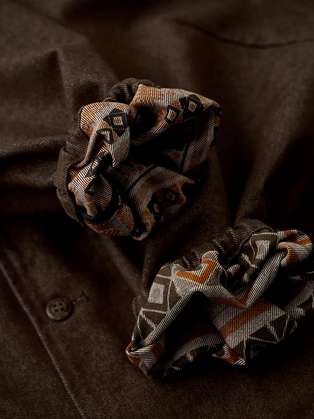 A subtle embroidered “Karaku” logo is placed on the left chest, creating a simple yet refined look that serves as a minimal design accent without disrupting the overall harmony. The interior features ethnic-inspired geometric patterns, adding a visual accent. The colors of the patterns complement the denim exterior while incorporating a distinct cultural touch.