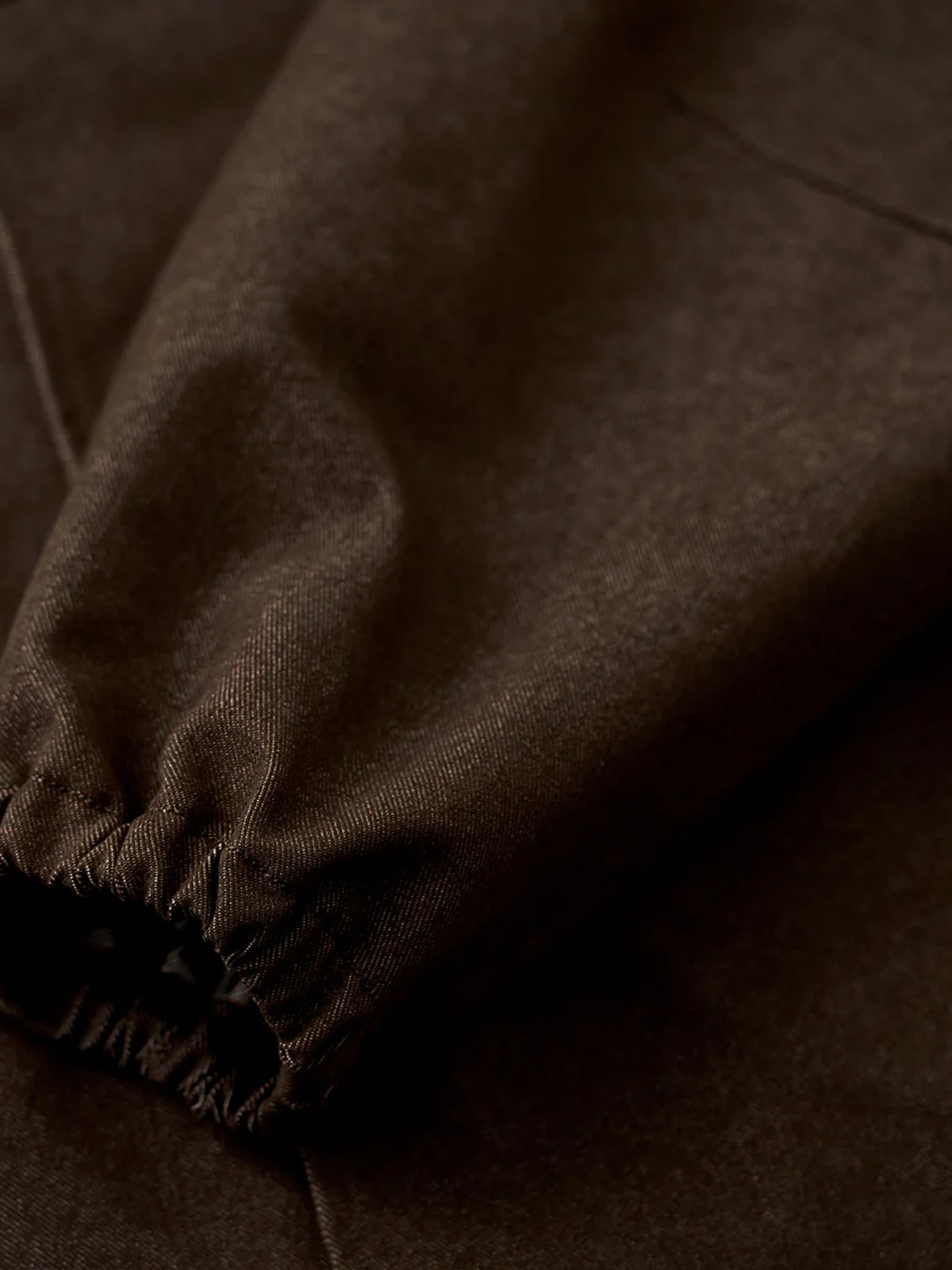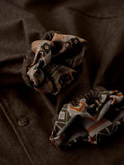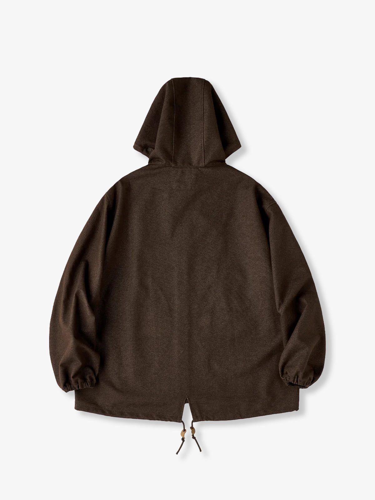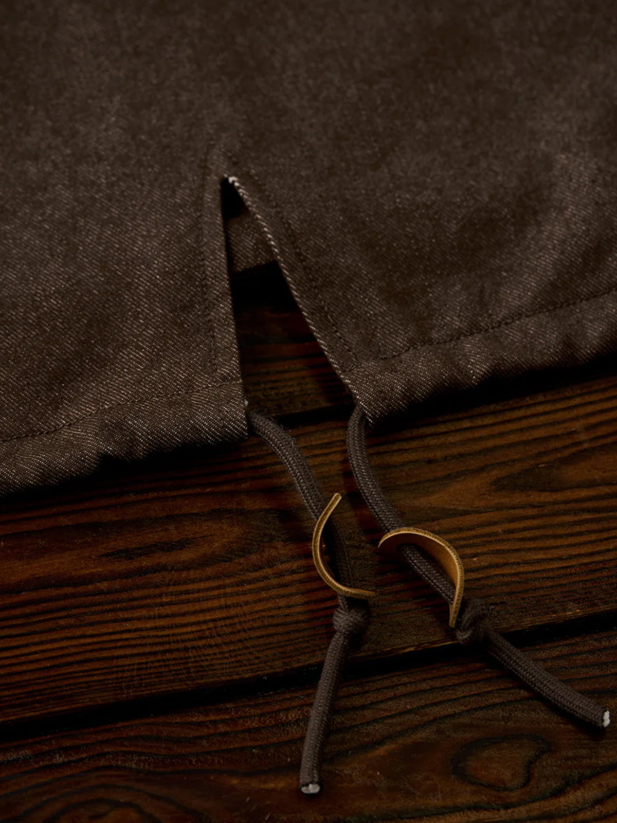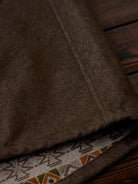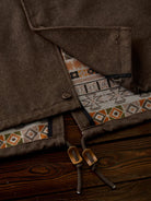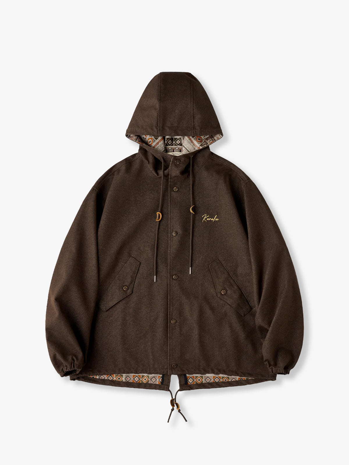 Designed with practicality in mind, the jacket includes a hood. The ethnic-pattern lining is also visible inside the hood, maintaining design consistency. The hem is slightly longer at the back with a center slit, enhancing ease of movement.