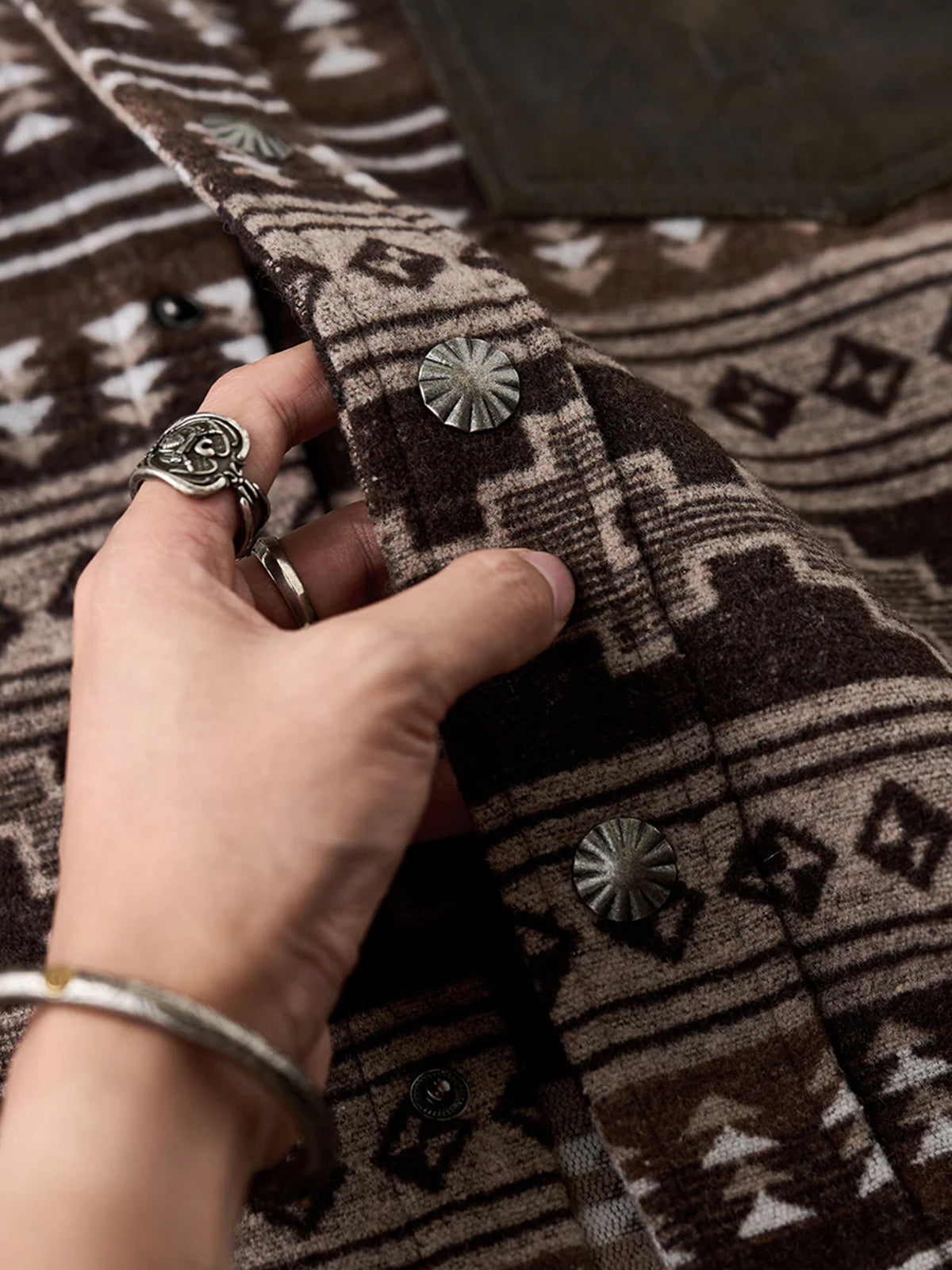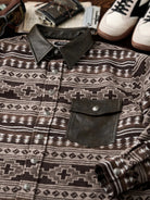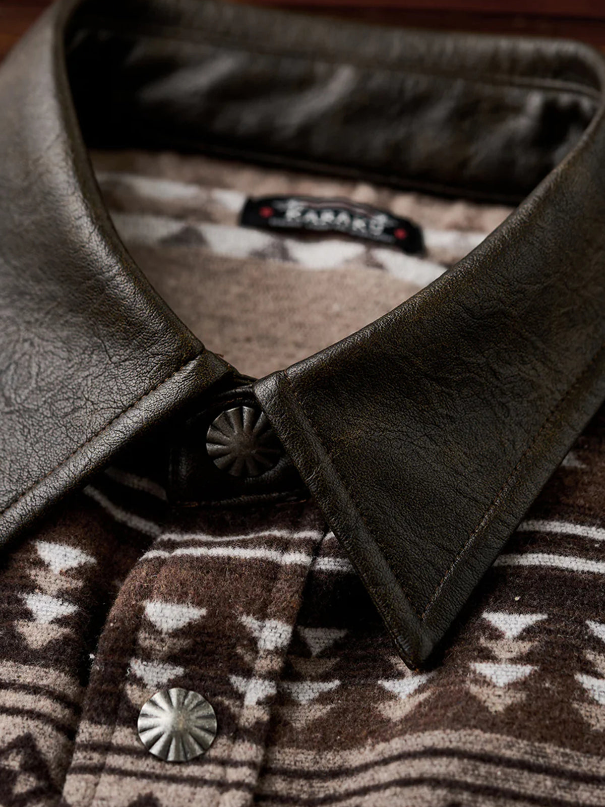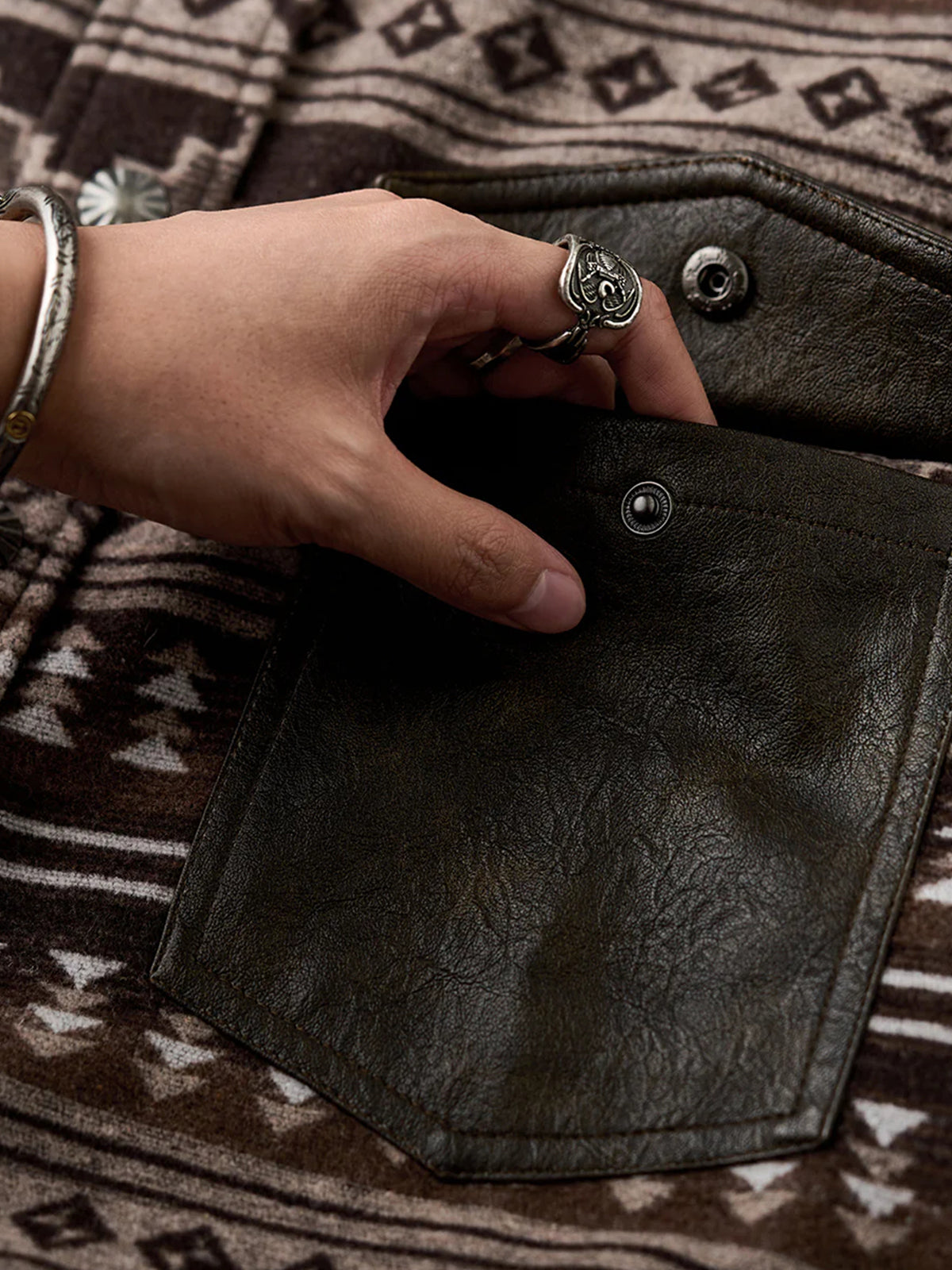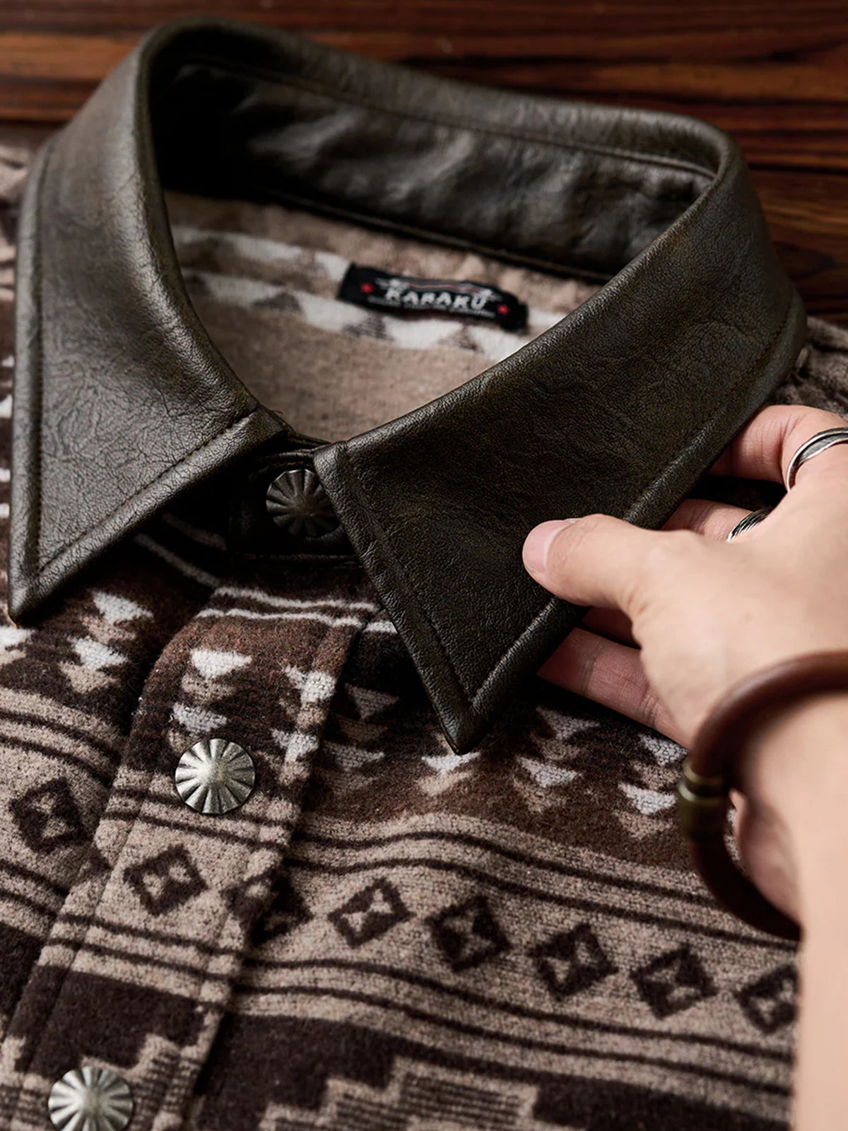 Ethnic-Inspired Wool-Blend Tweed Shirt with Leather Collar & Pocket Accents