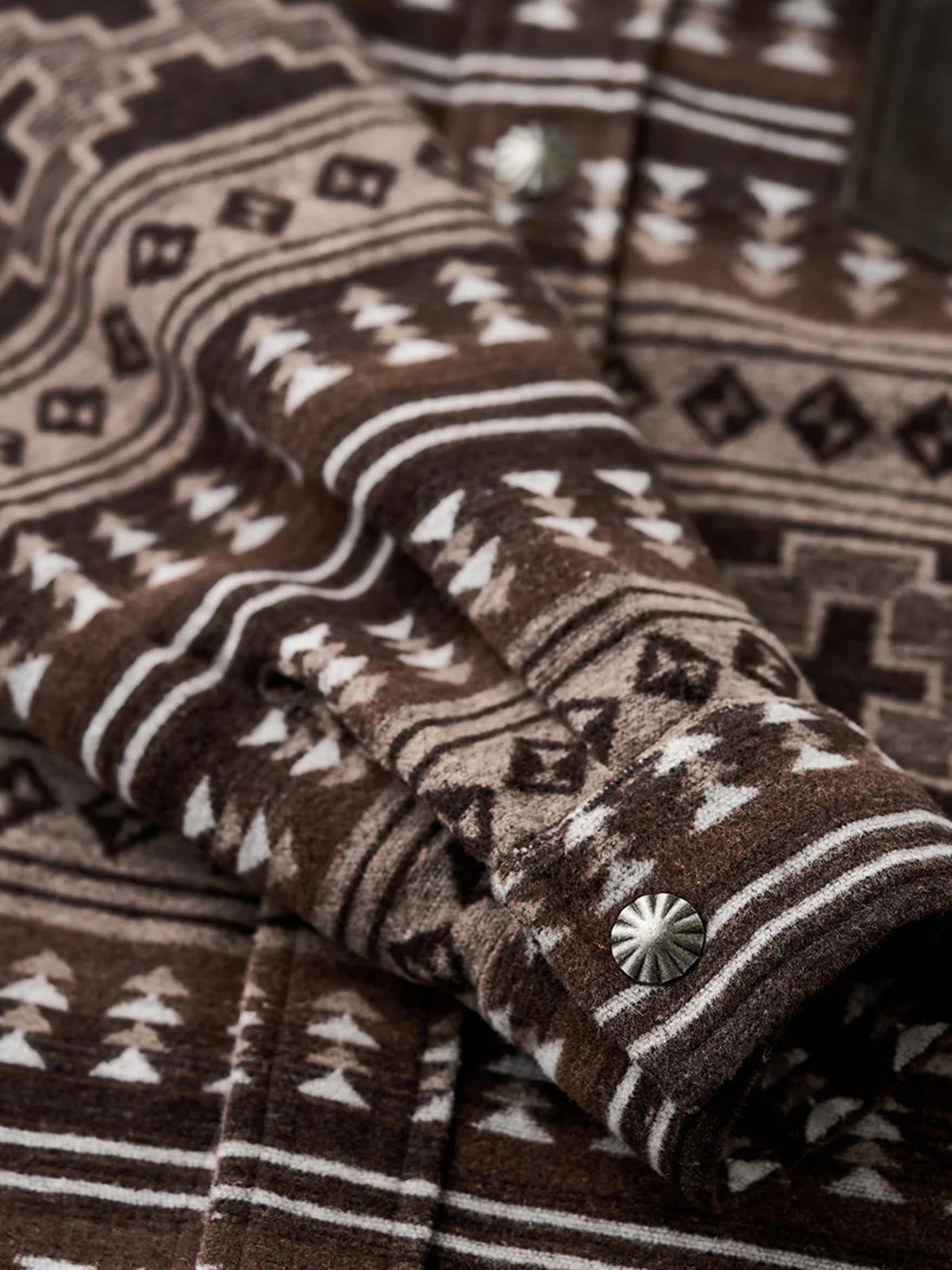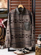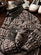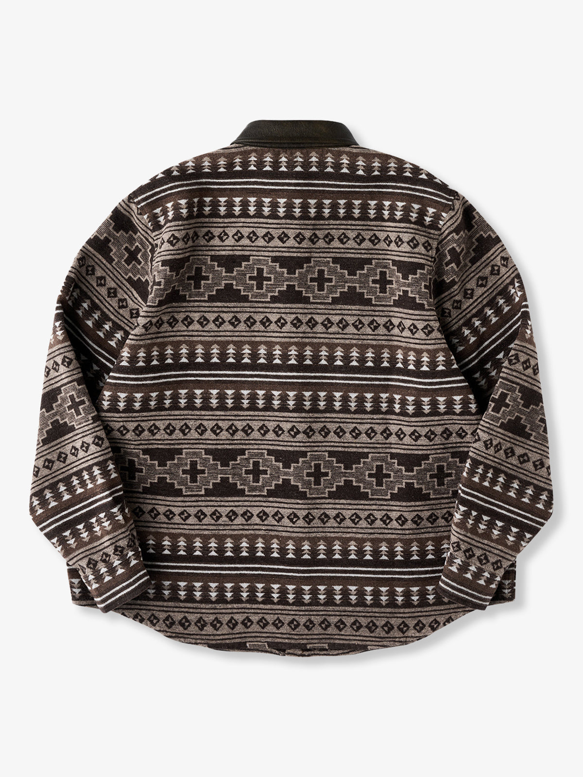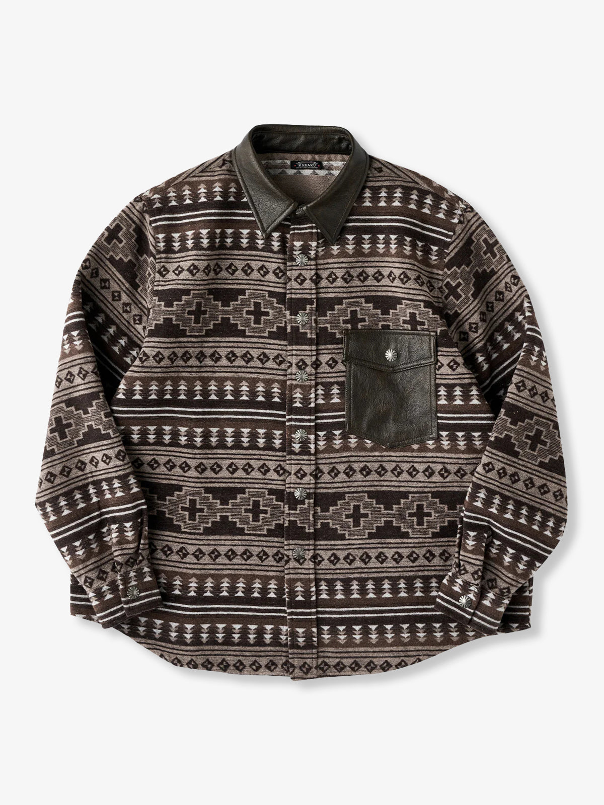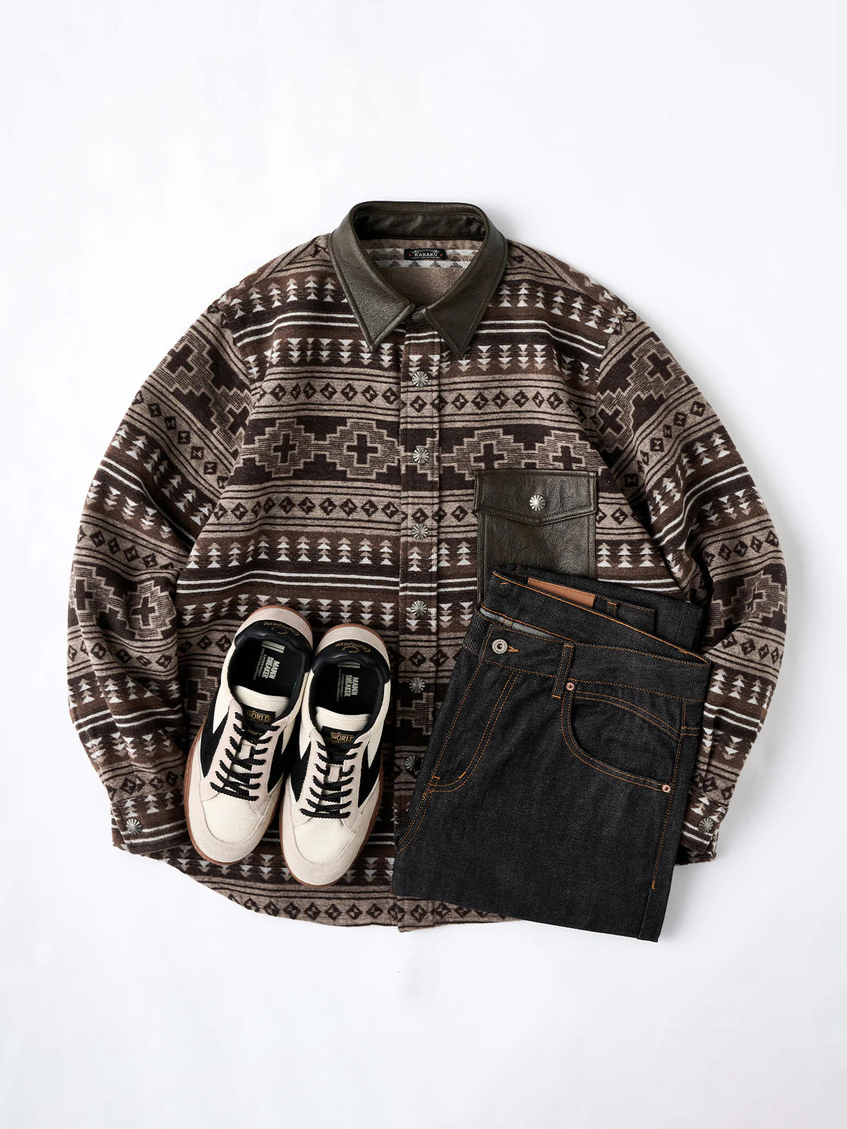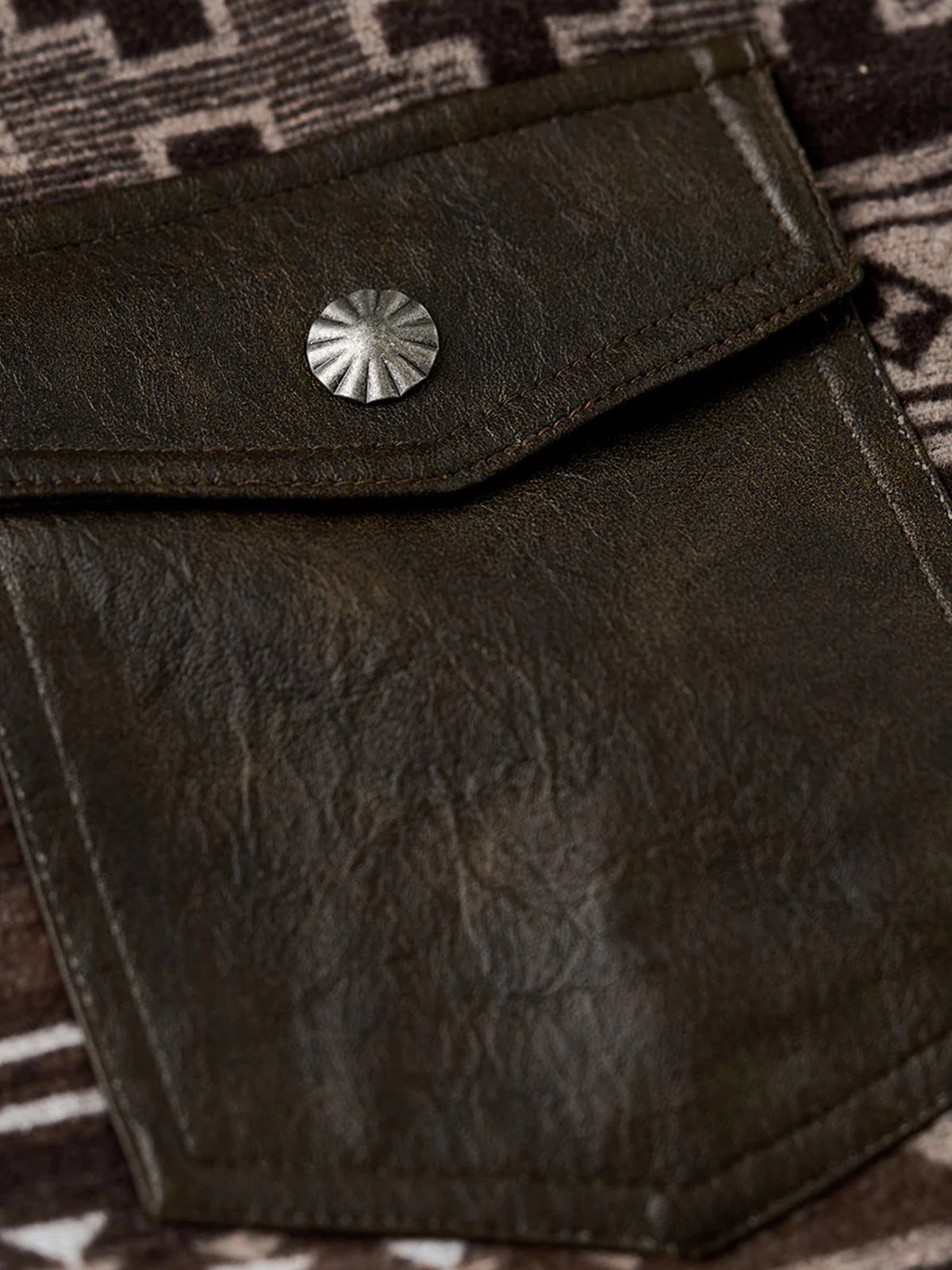 Ethnic-Inspired Wool-Blend Tweed Shirt with Leather Collar & Pocket Accents