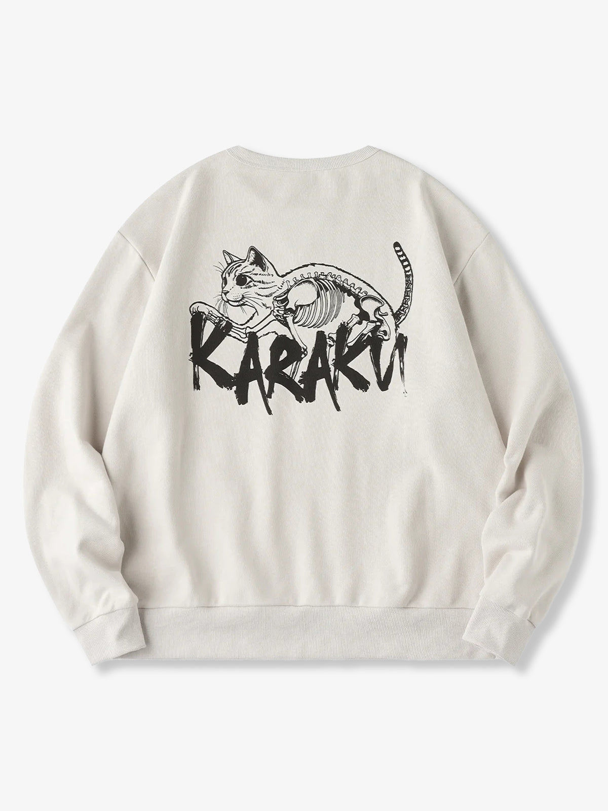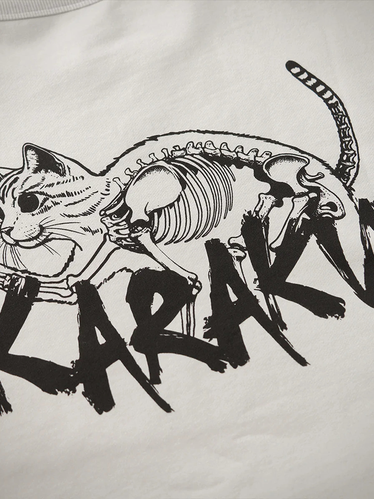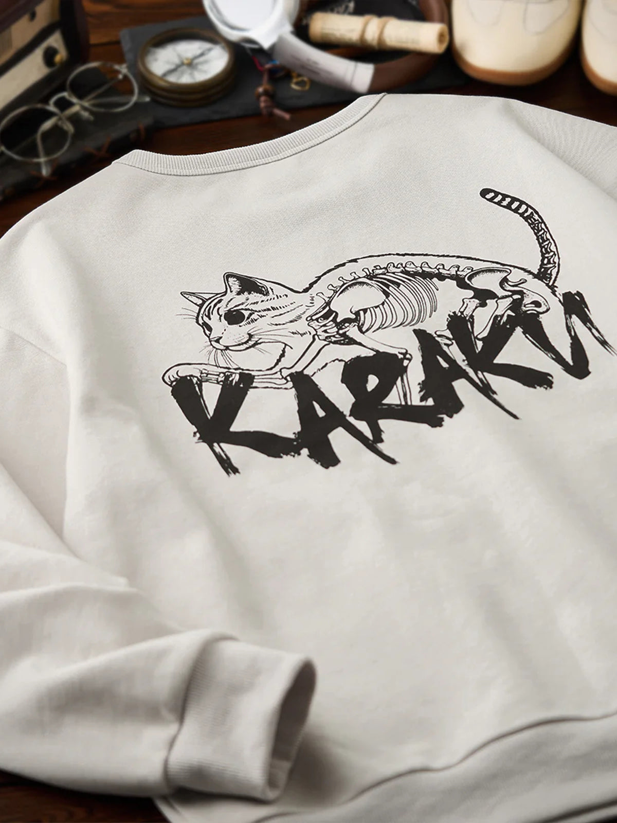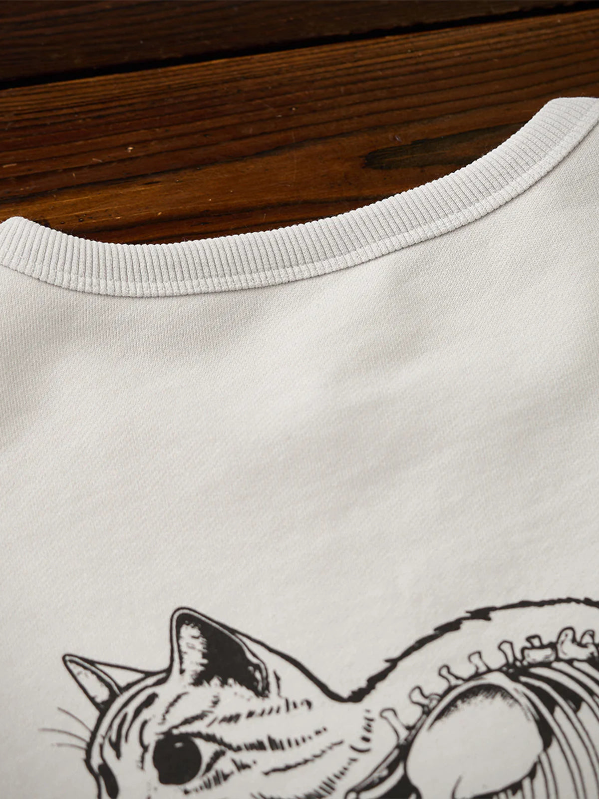"Skeleton-Visible Cat" Print Back-Pile Cotton V-Gusset Sweatshirt