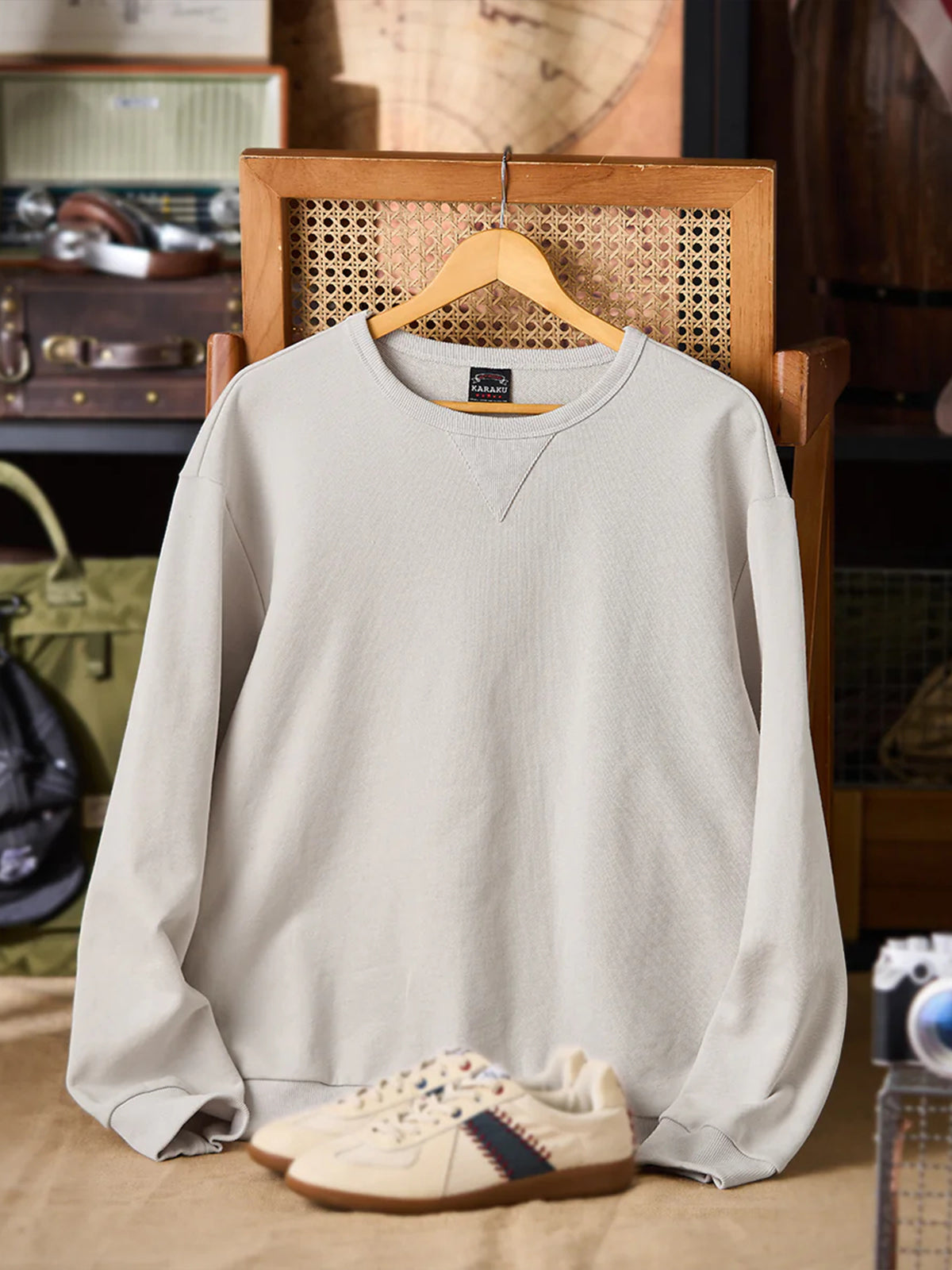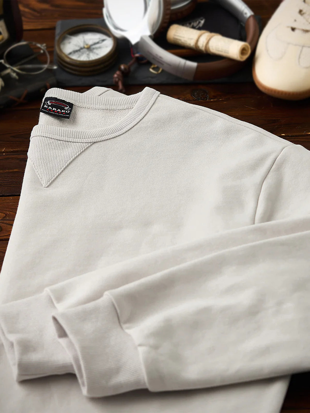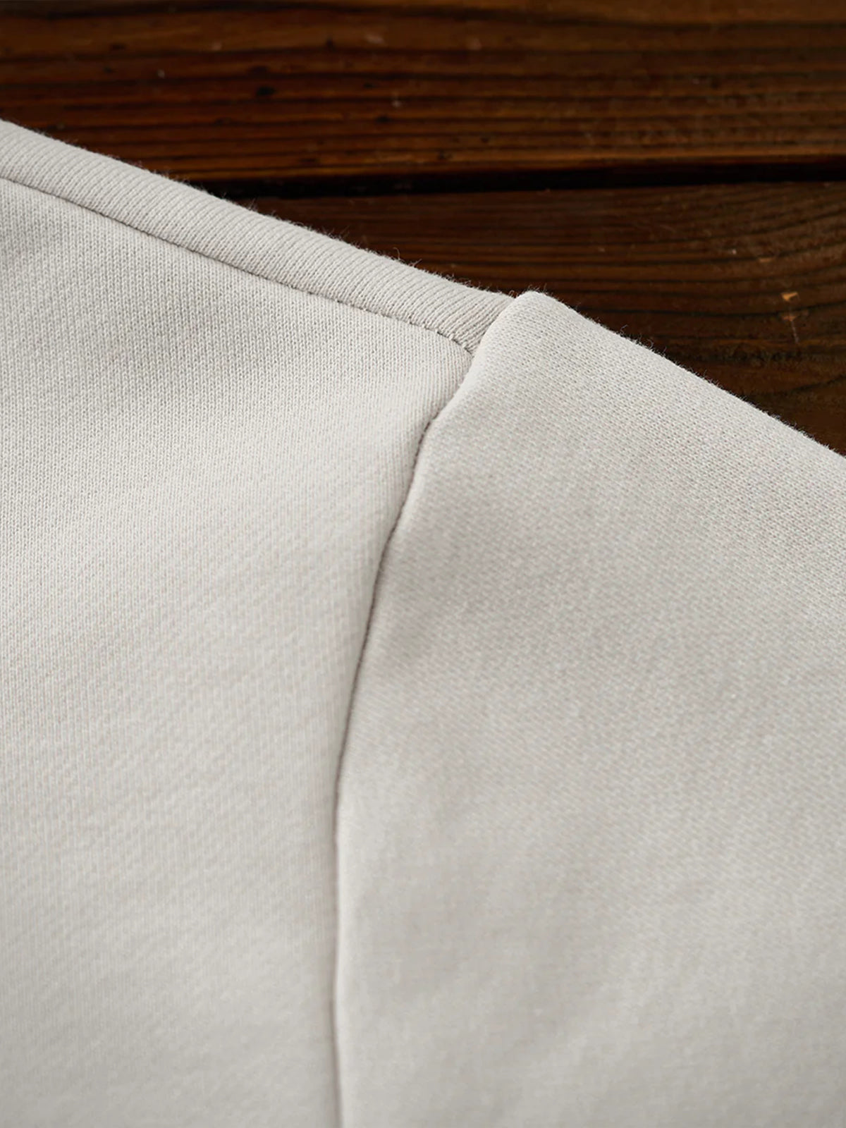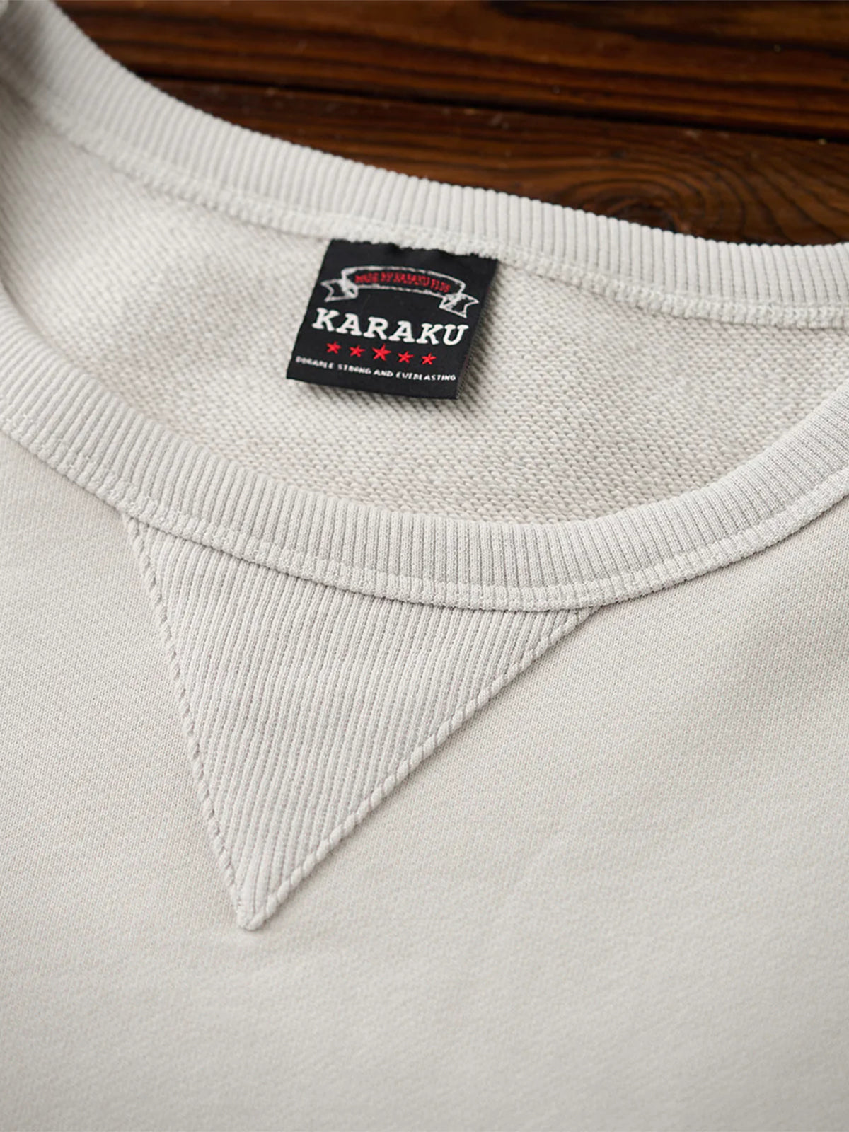 The sweatshirt features a V-shaped gusset placed under the neckline, a classic detail that adds a vintage touch. This traditional element also serves a functional role by reinforcing the garment.