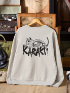 The word "KARAKU" is boldly printed in a hand-drawn style font, conveying a sense of strength. The artistic and rough font style adds a streetwear element to the design.