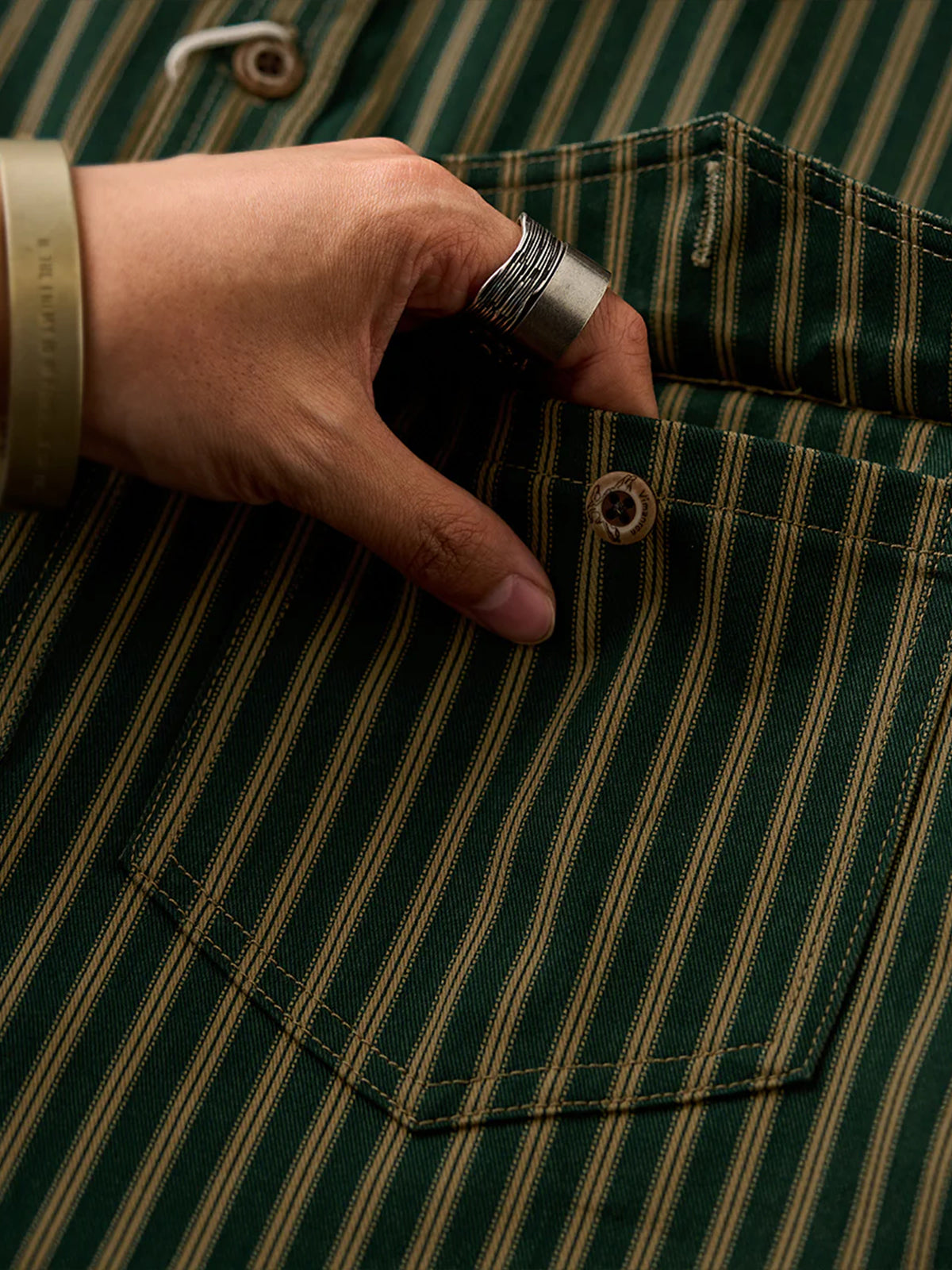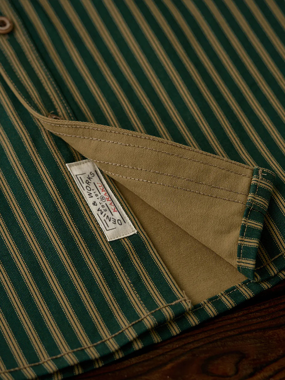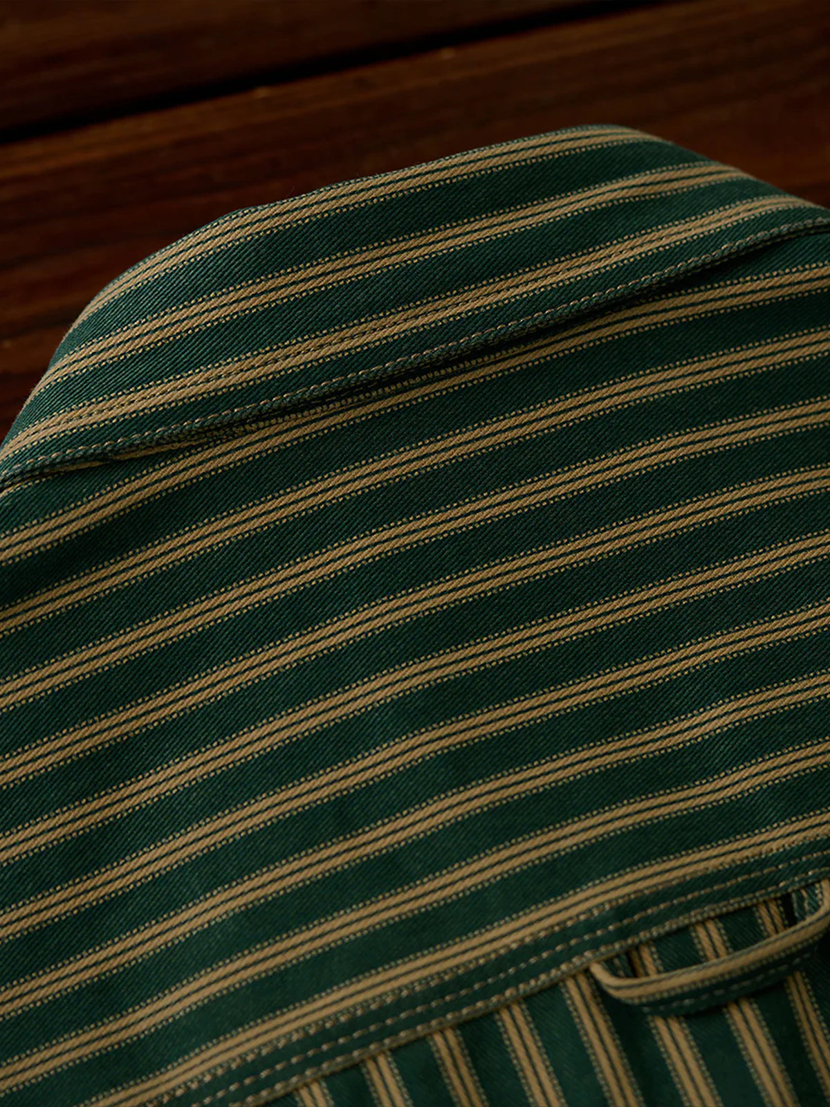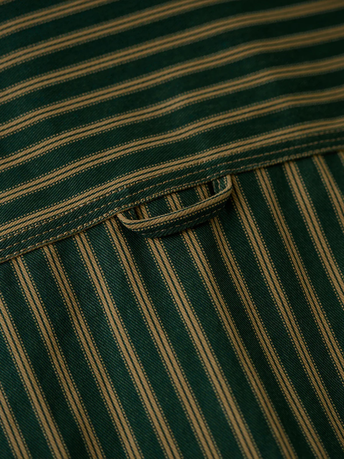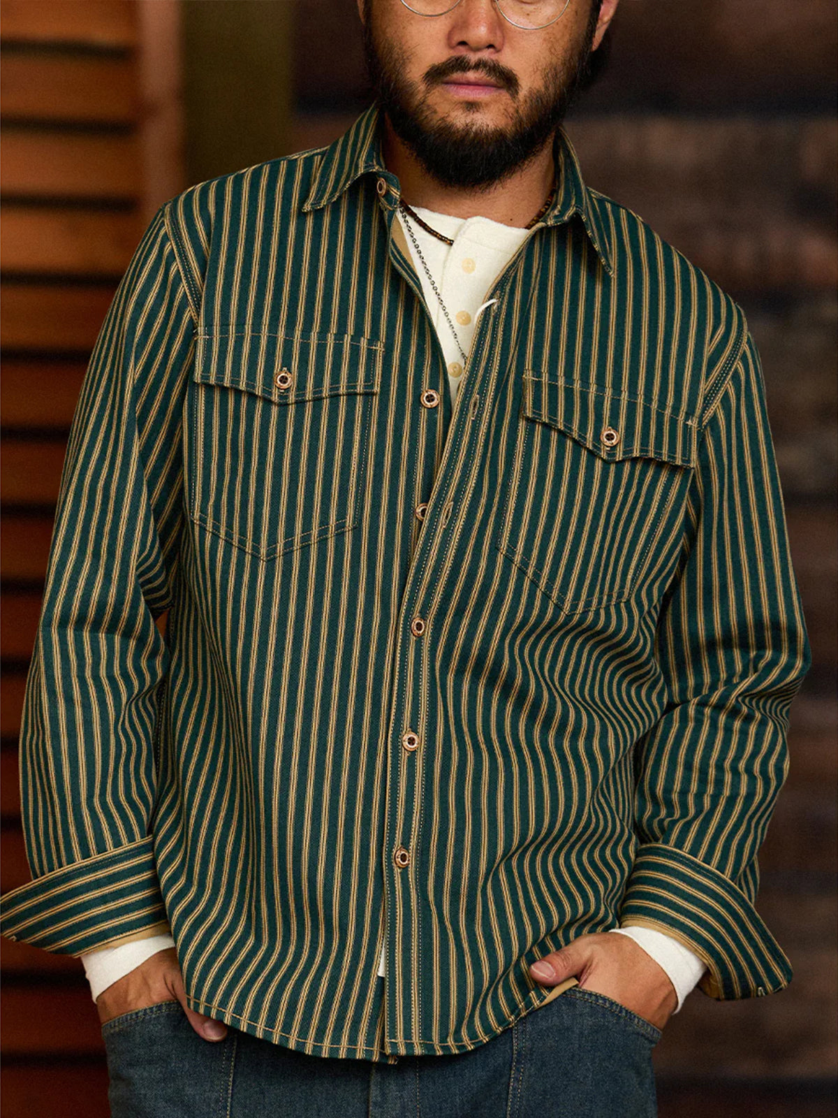 A heavyweight outerwear with a strong presence and distressed finish that gives you a vintage feel. The classic vintage stripe pattern creates a sophisticated impression while exuding a sense of nostalgia. It is a sturdy and thick fabric that can be worn not only as a shirt but also as a light outerwear. The moderately loose silhouette creates a comfortable atmosphere that complements a variety of styles from casual to vintage.