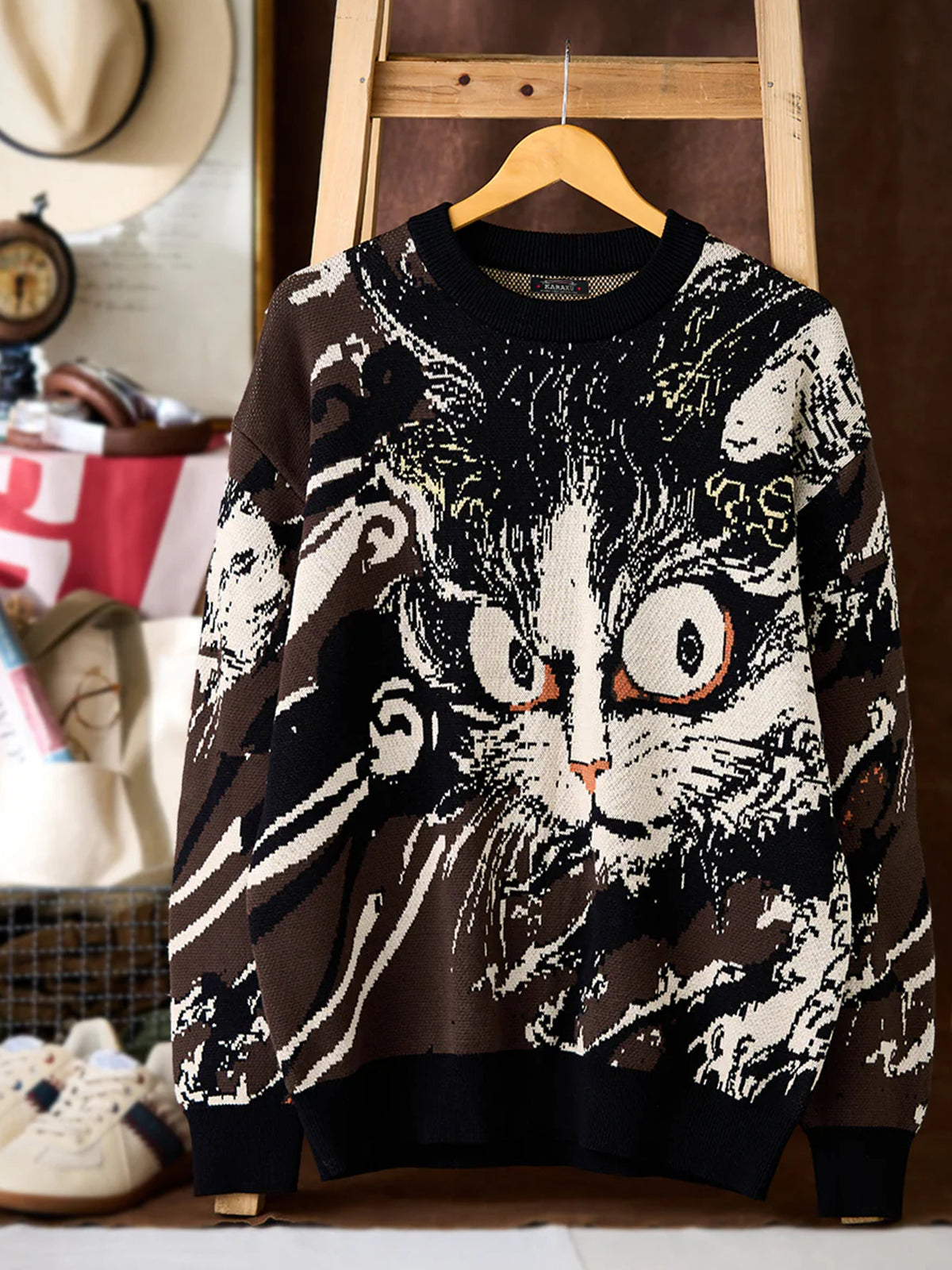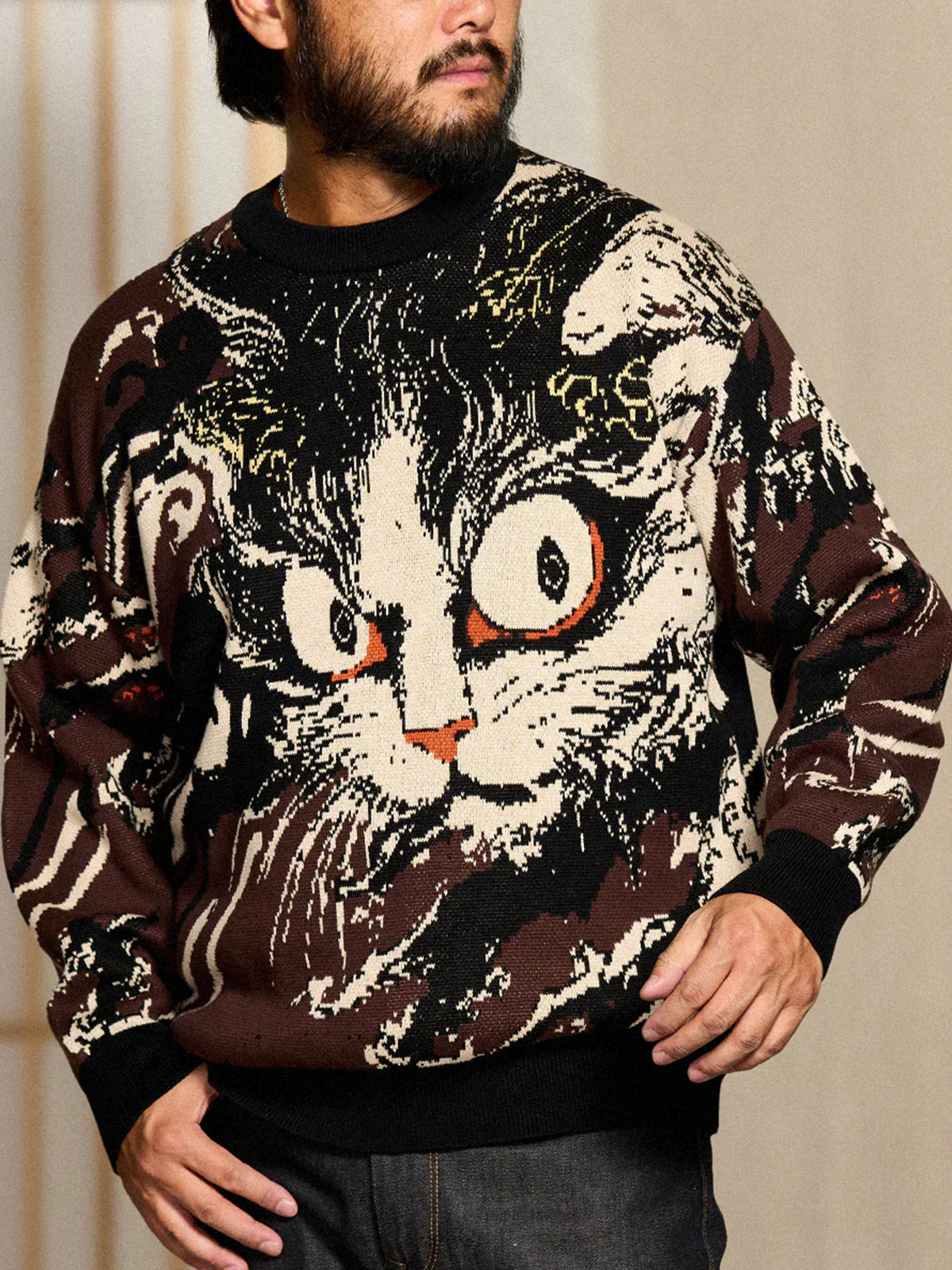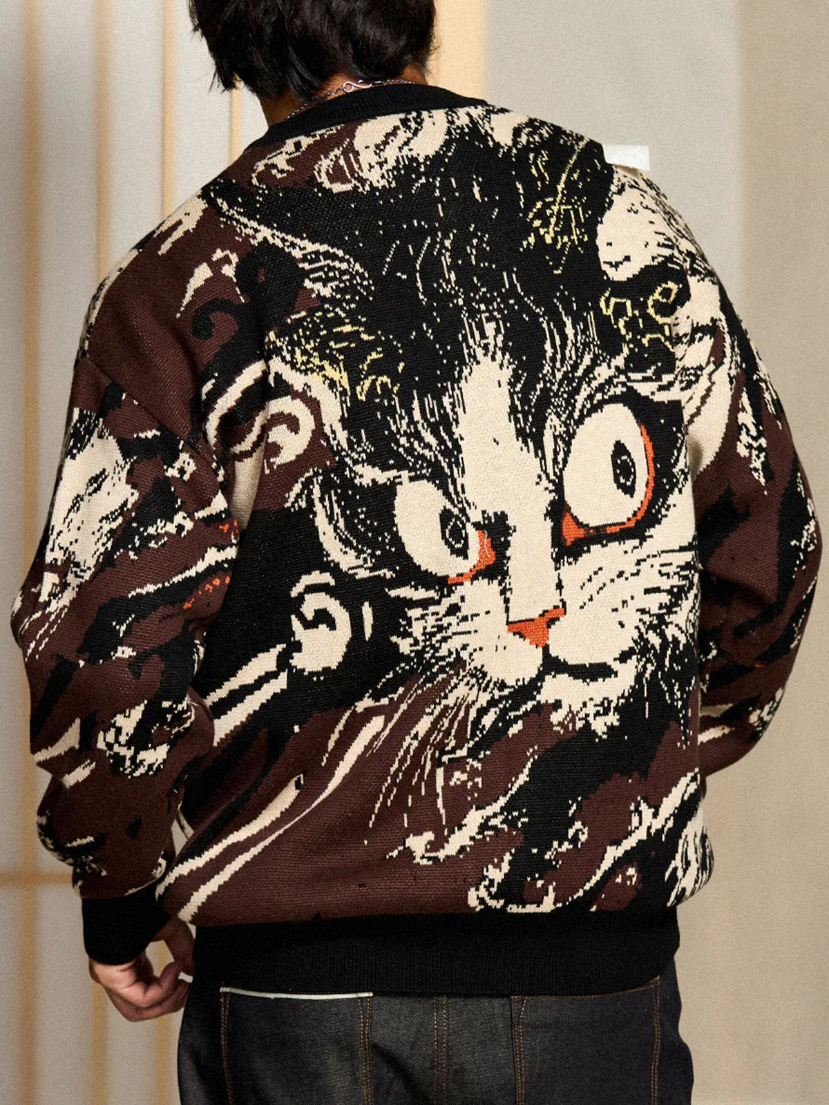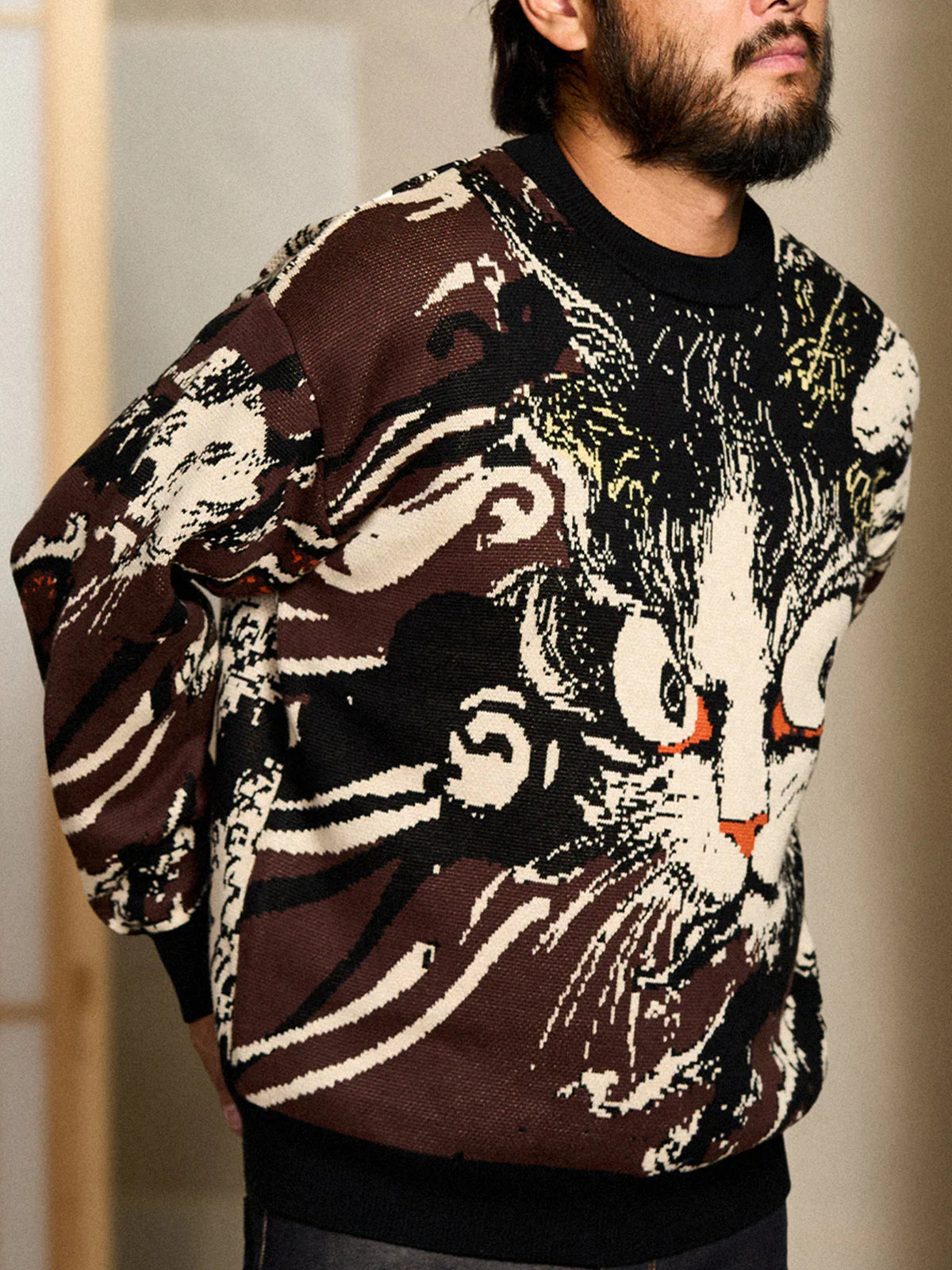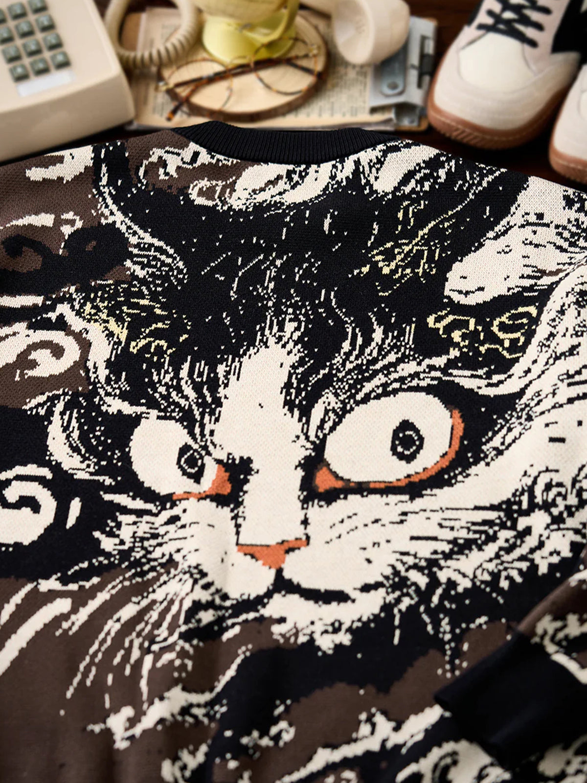 Ukiyo-e Style Jacquard Sweater with “Bakeneko” Folklore Motif