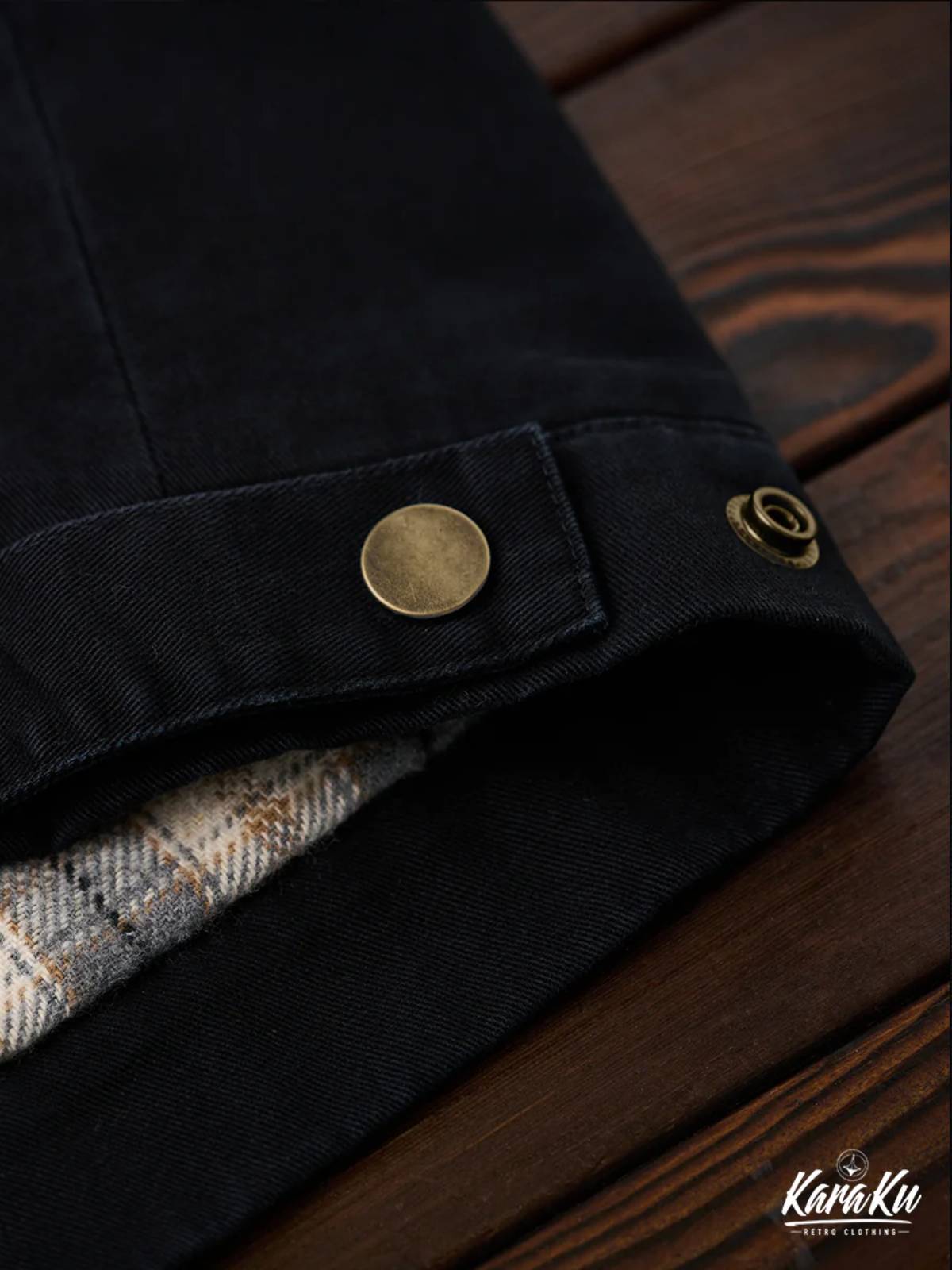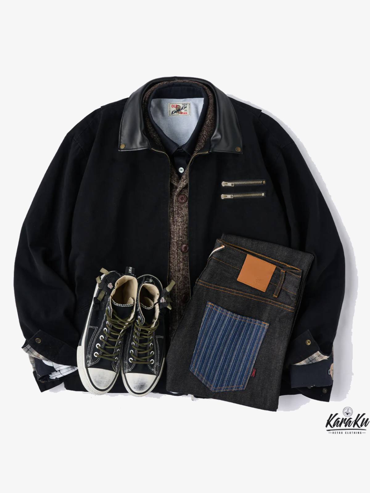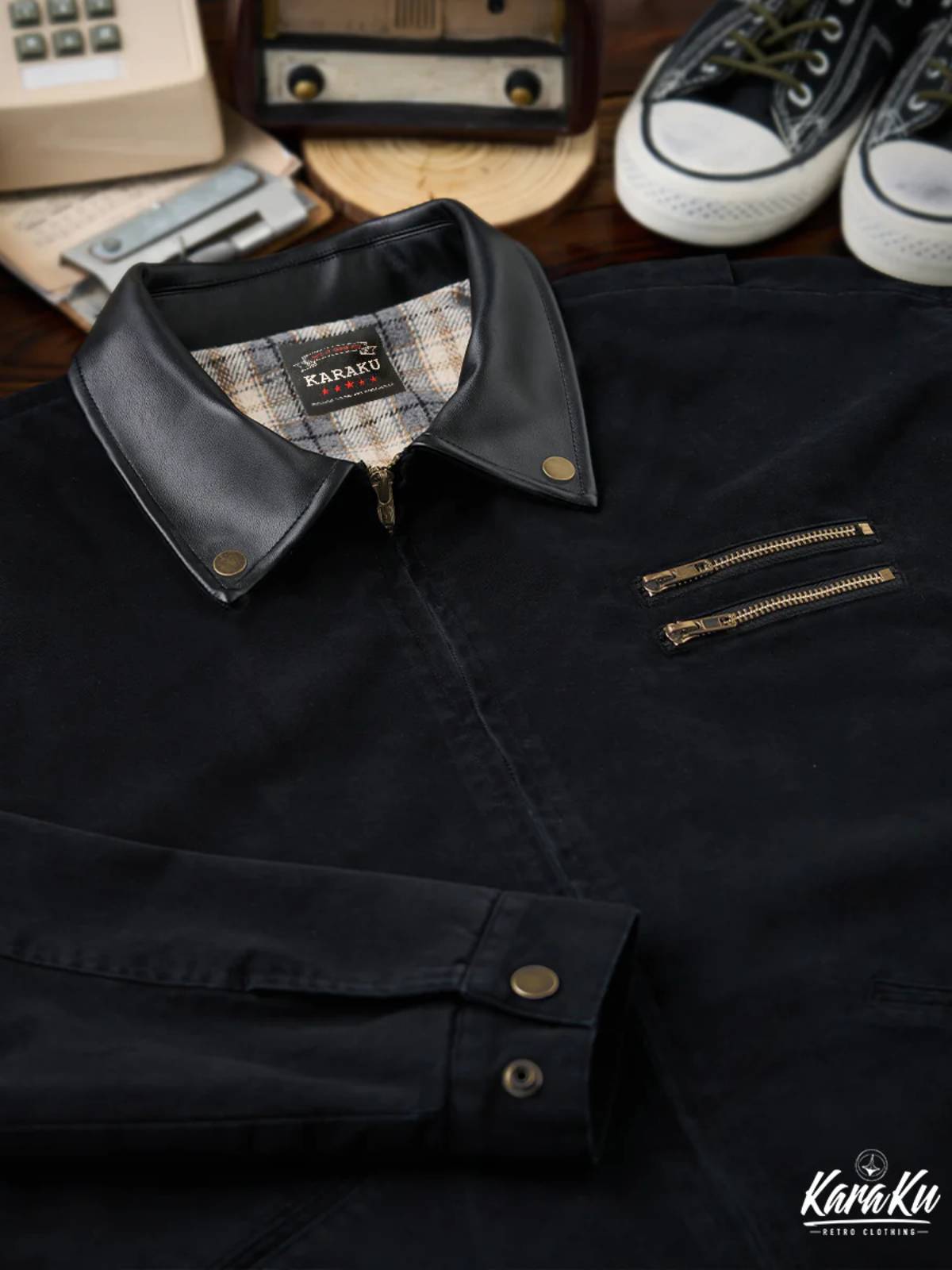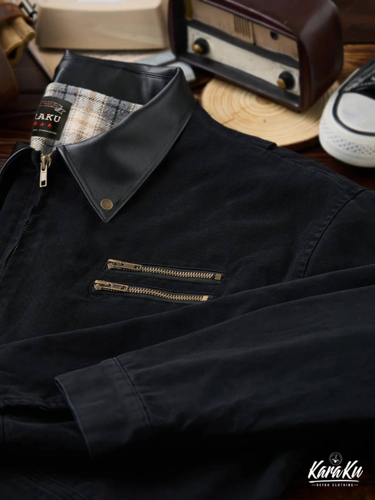 This modern take on a work jacket features a luxurious microfiber leather collar and double-zip front, enhanced with vintage buttons. Lined with soft, fleece-backed cotton check fabric for comfort and warmth, it blends design with functionality. Ideal for various styles, from American casual to streetwear, it's perfect for year-round wear and versatile layering.