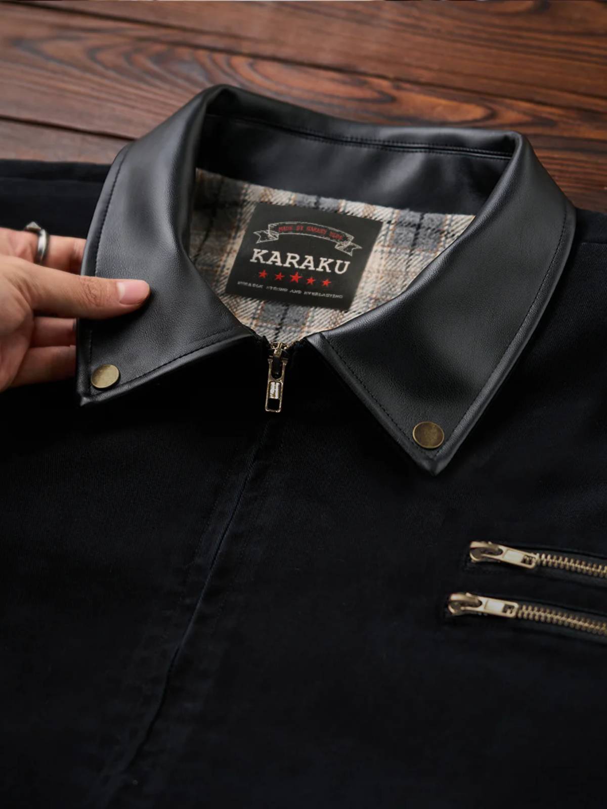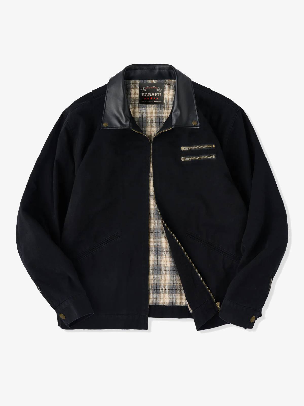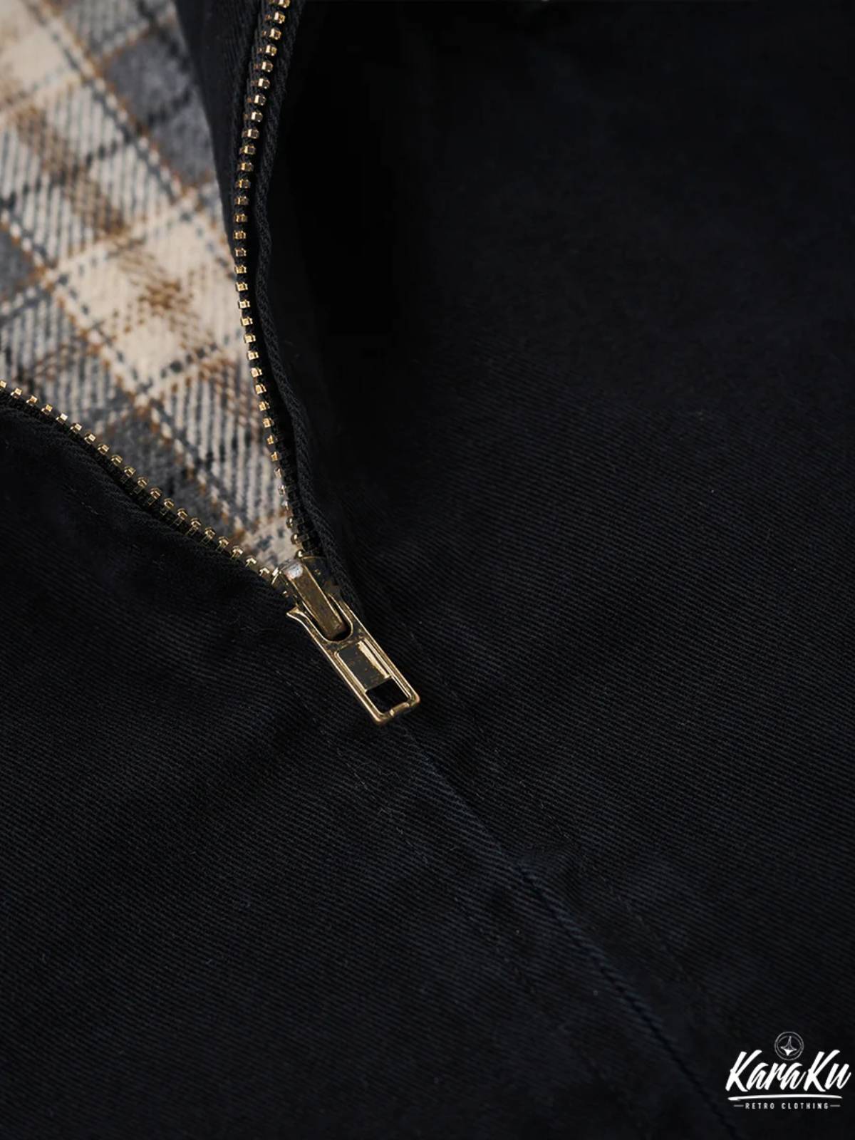 This modern take on a work jacket features a luxurious microfiber leather collar and double-zip front, enhanced with vintage buttons. Lined with soft, fleece-backed cotton check fabric for comfort and warmth, it blends design with functionality. Ideal for various styles, from American casual to streetwear, it's perfect for year-round wear and versatile layering.