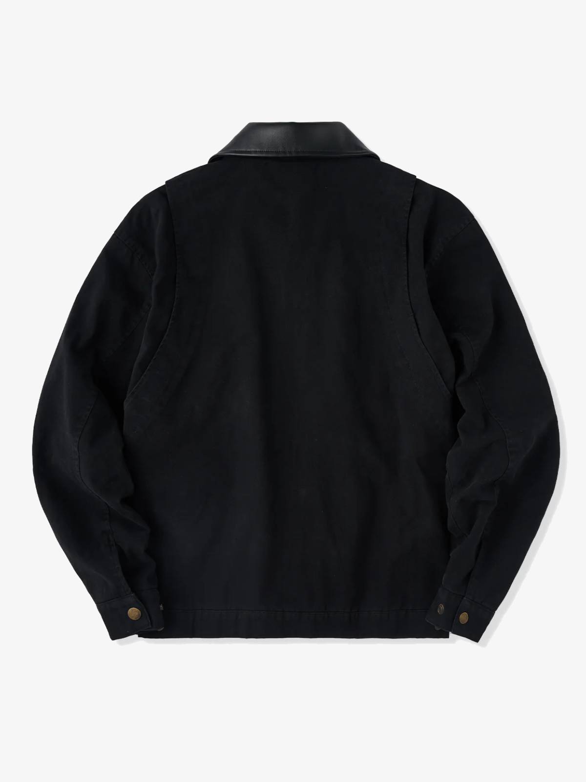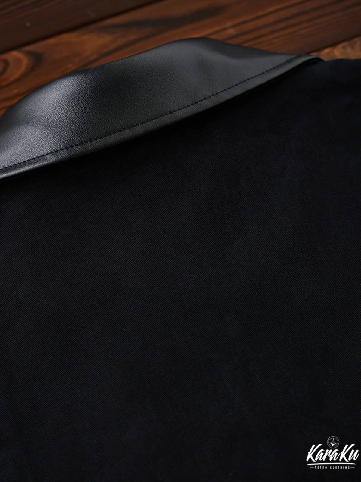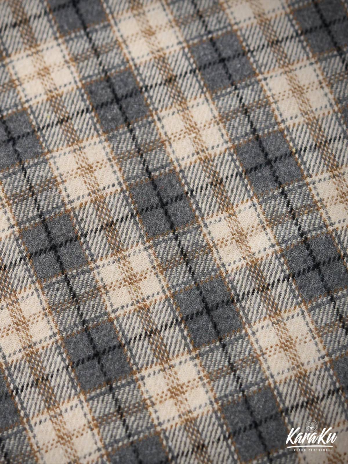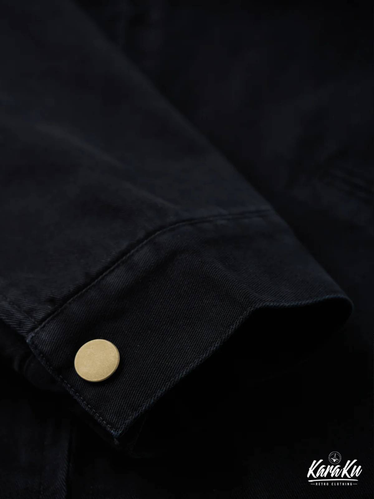 This modern take on a work jacket features a luxurious microfiber leather collar and double-zip front, enhanced with vintage buttons. Lined with soft, fleece-backed cotton check fabric for comfort and warmth, it blends design with functionality. Ideal for various styles, from American casual to streetwear, it's perfect for year-round wear and versatile layering.