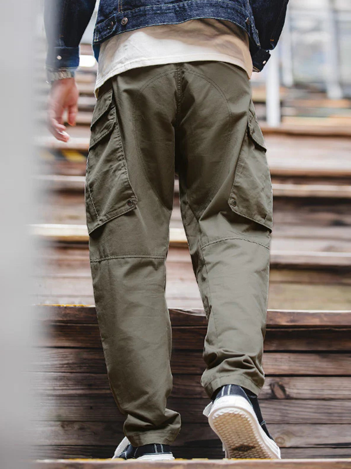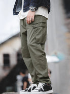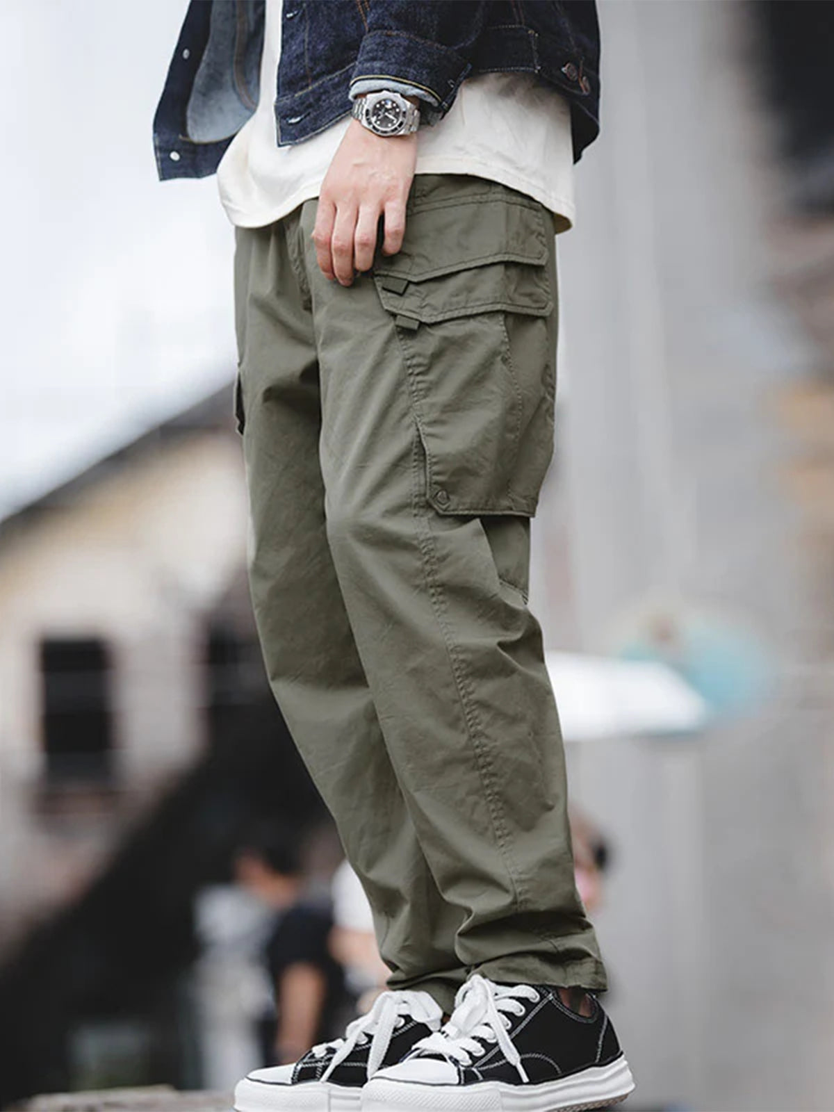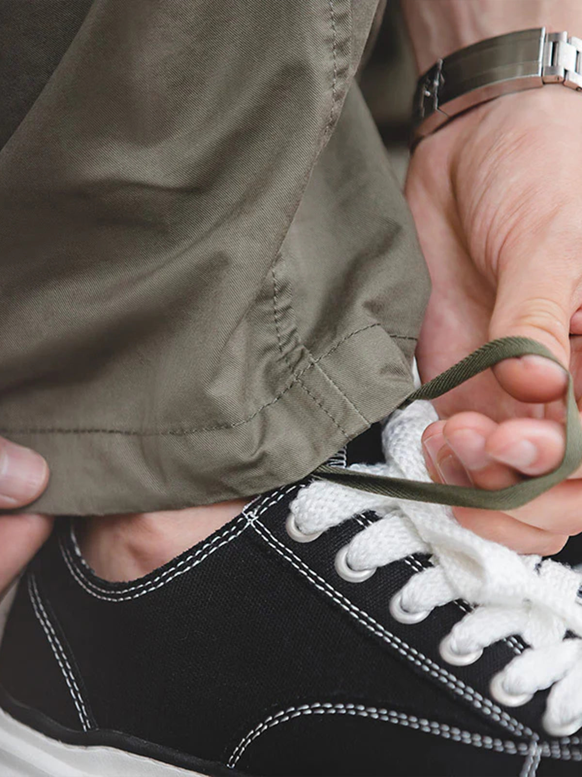 Features two three-dimensional double-layer flap pockets, perfectly suited for the trendy urban sports style. The ankle length creates a clean and favorable impression, offering excellent balance not only with tops but also matching both sneakers and leather shoes. A straight-leg silhouette with a gentle taper creates a balloon silhouette that allows for trendy styling from casual to smart. The hem comes with a drawstring, allowing you to adjust the silhouette to your liking. It is also designed to pair well with sturdy shoes such as boots.