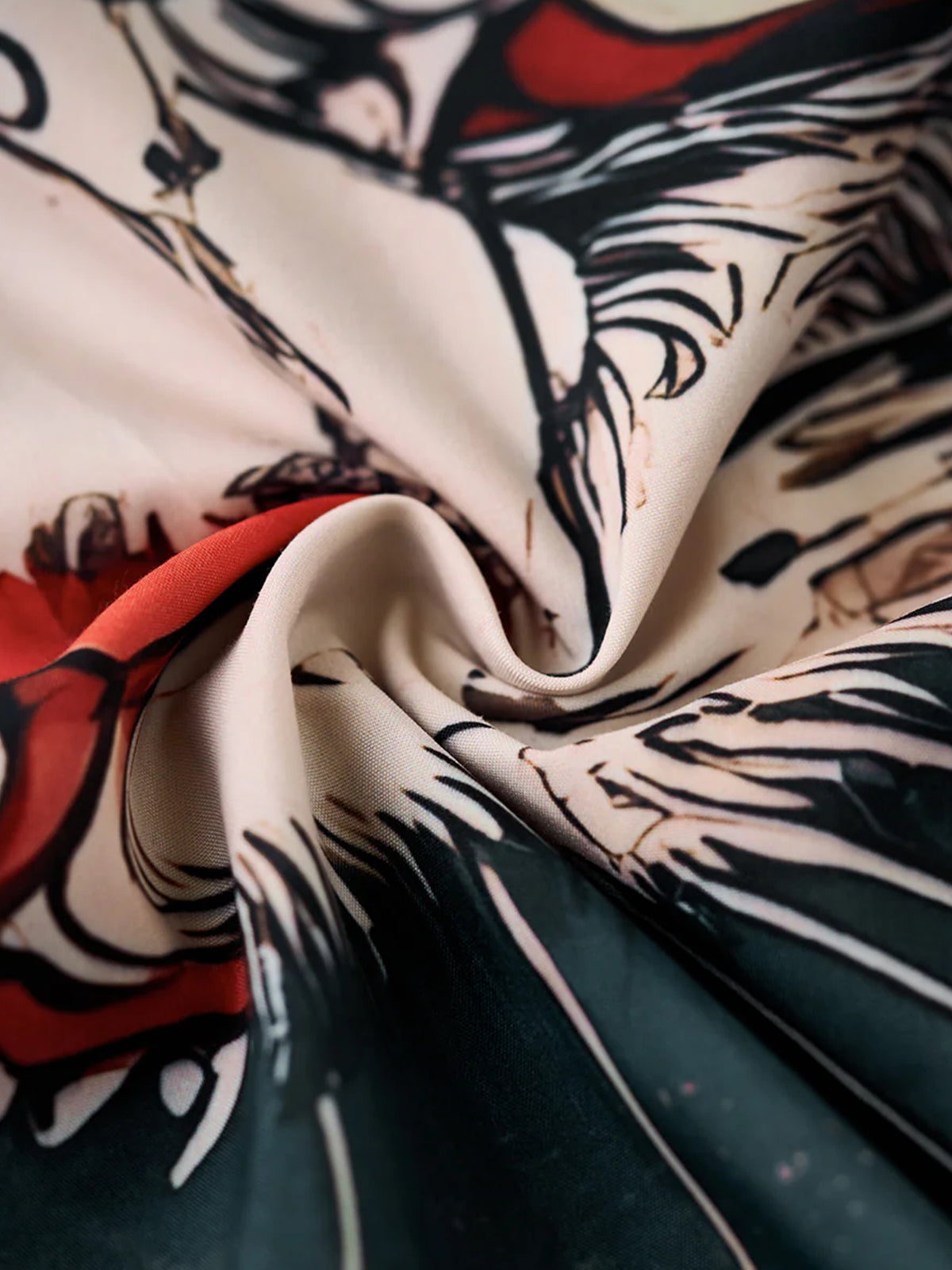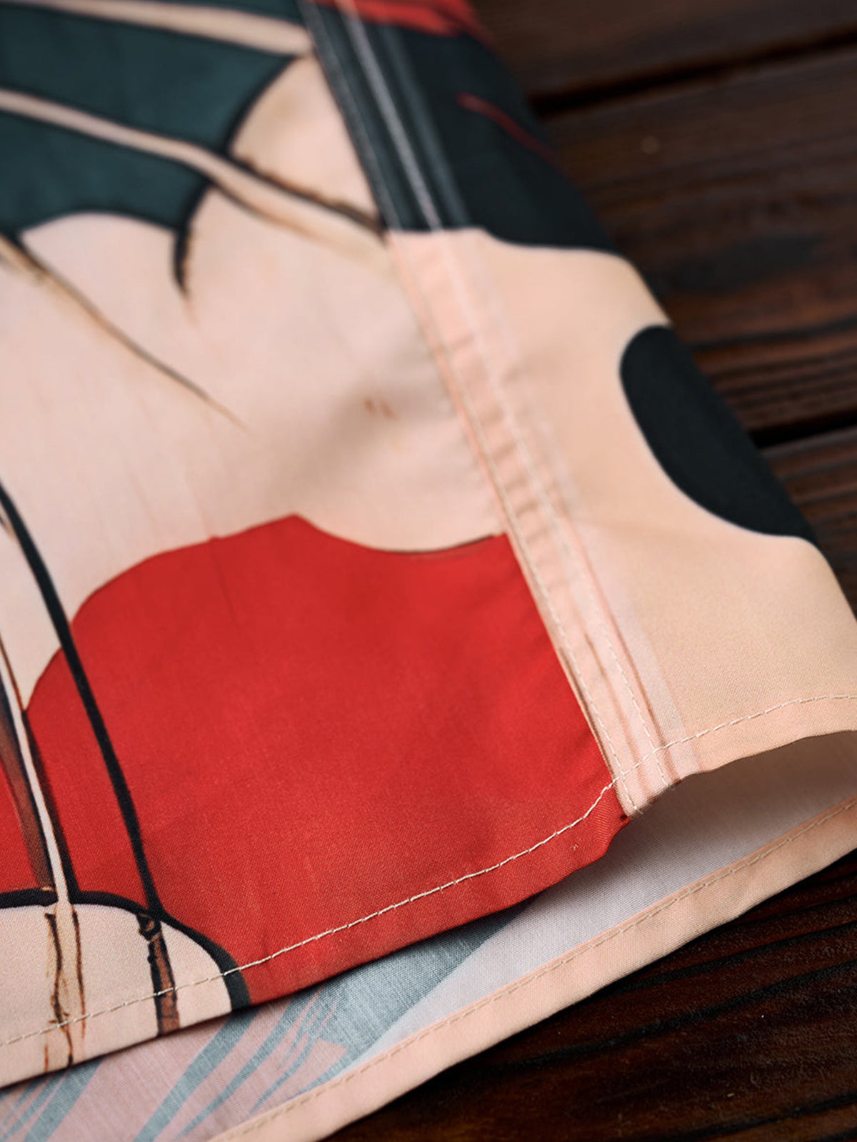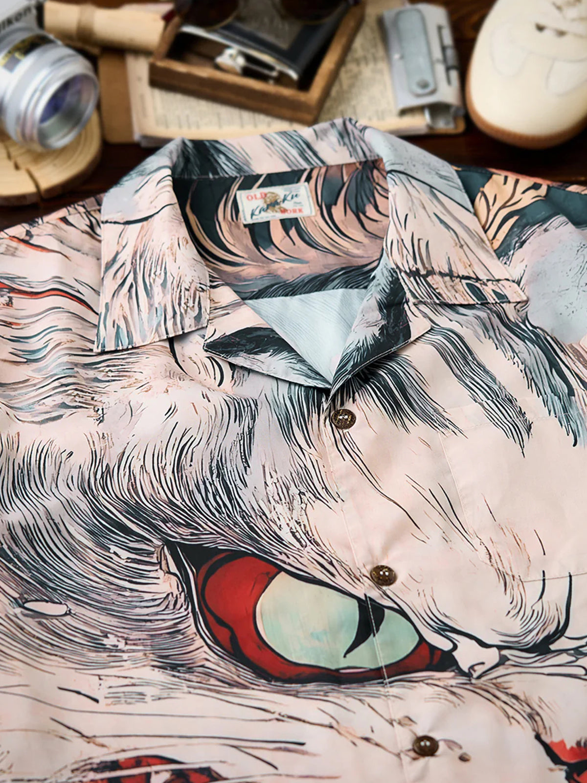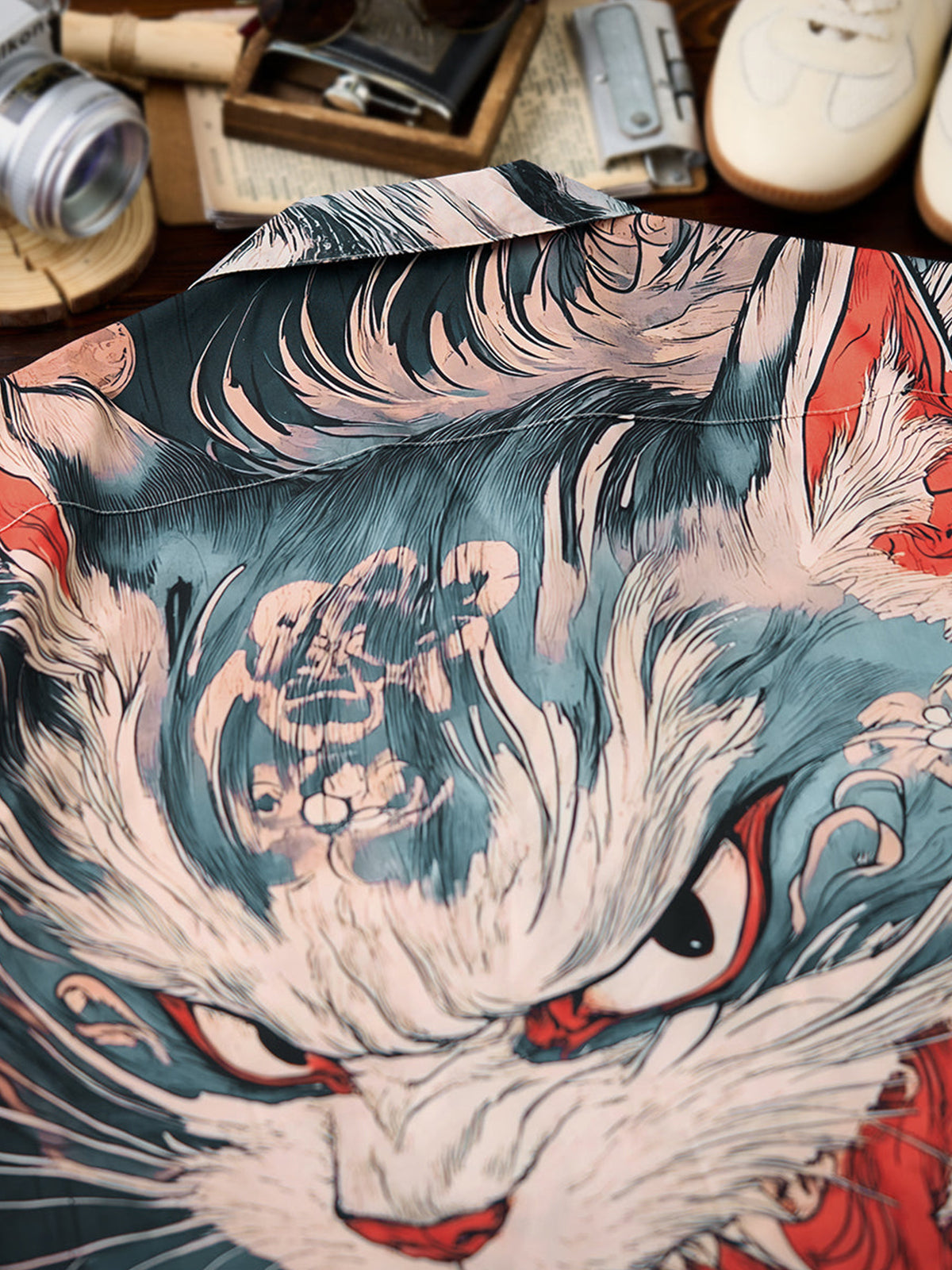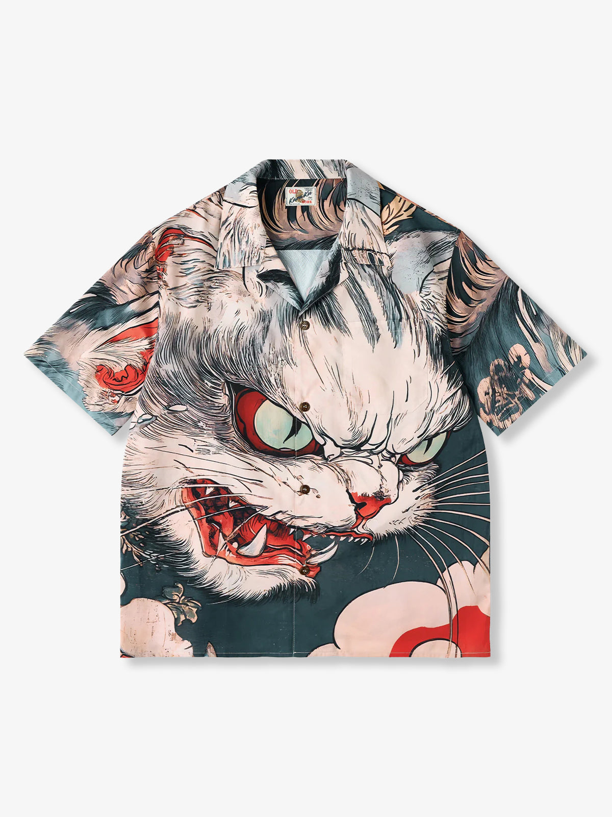 Folklore-Inspired "Howling Nekomata" Ukiyo-e Style Open Collar Shirt