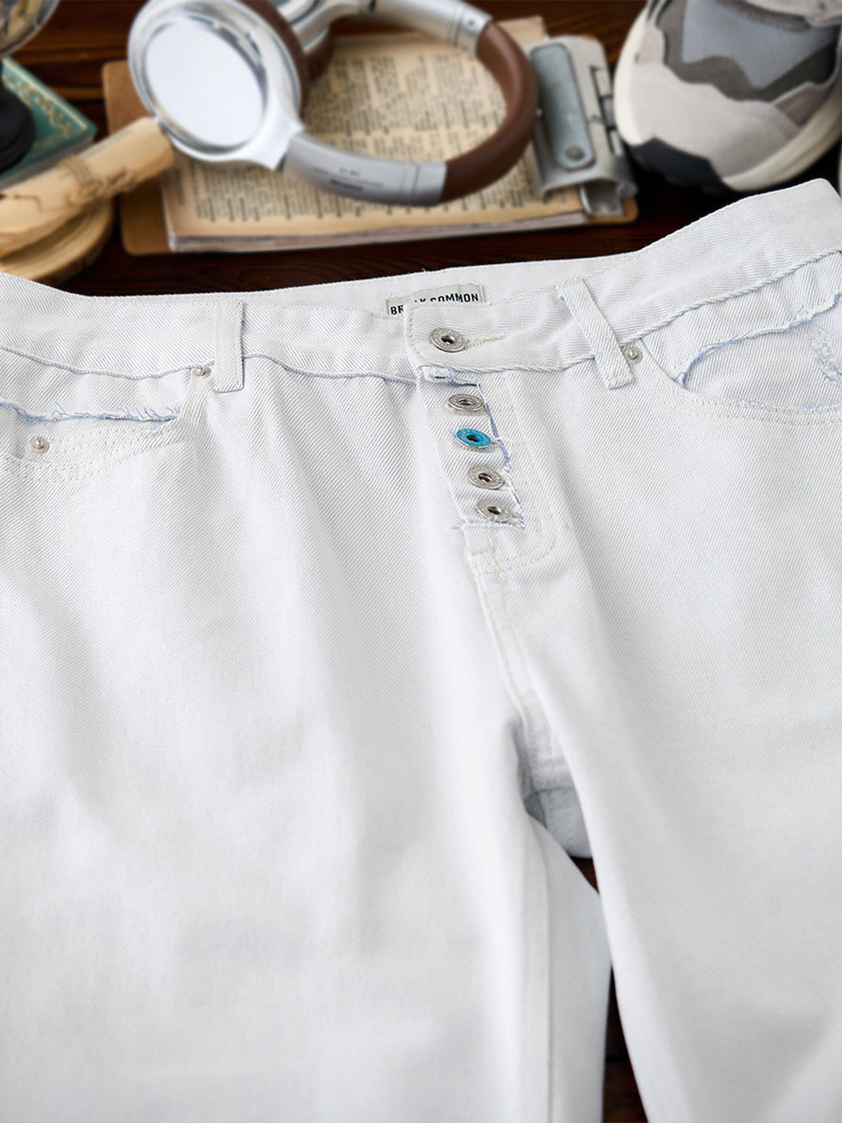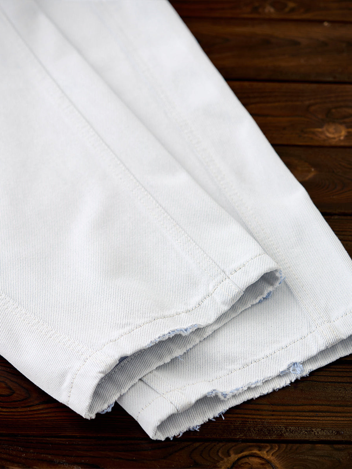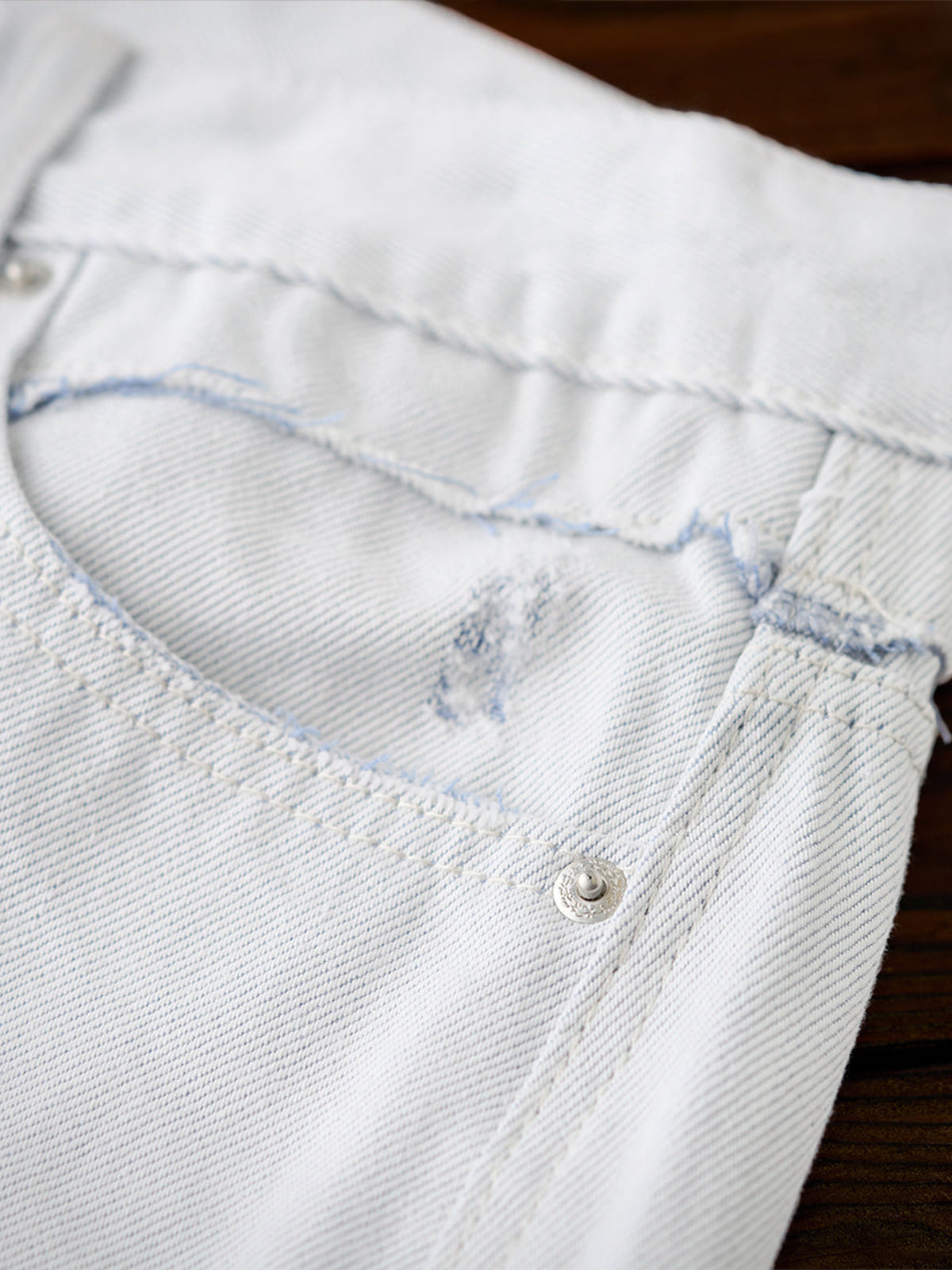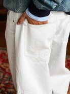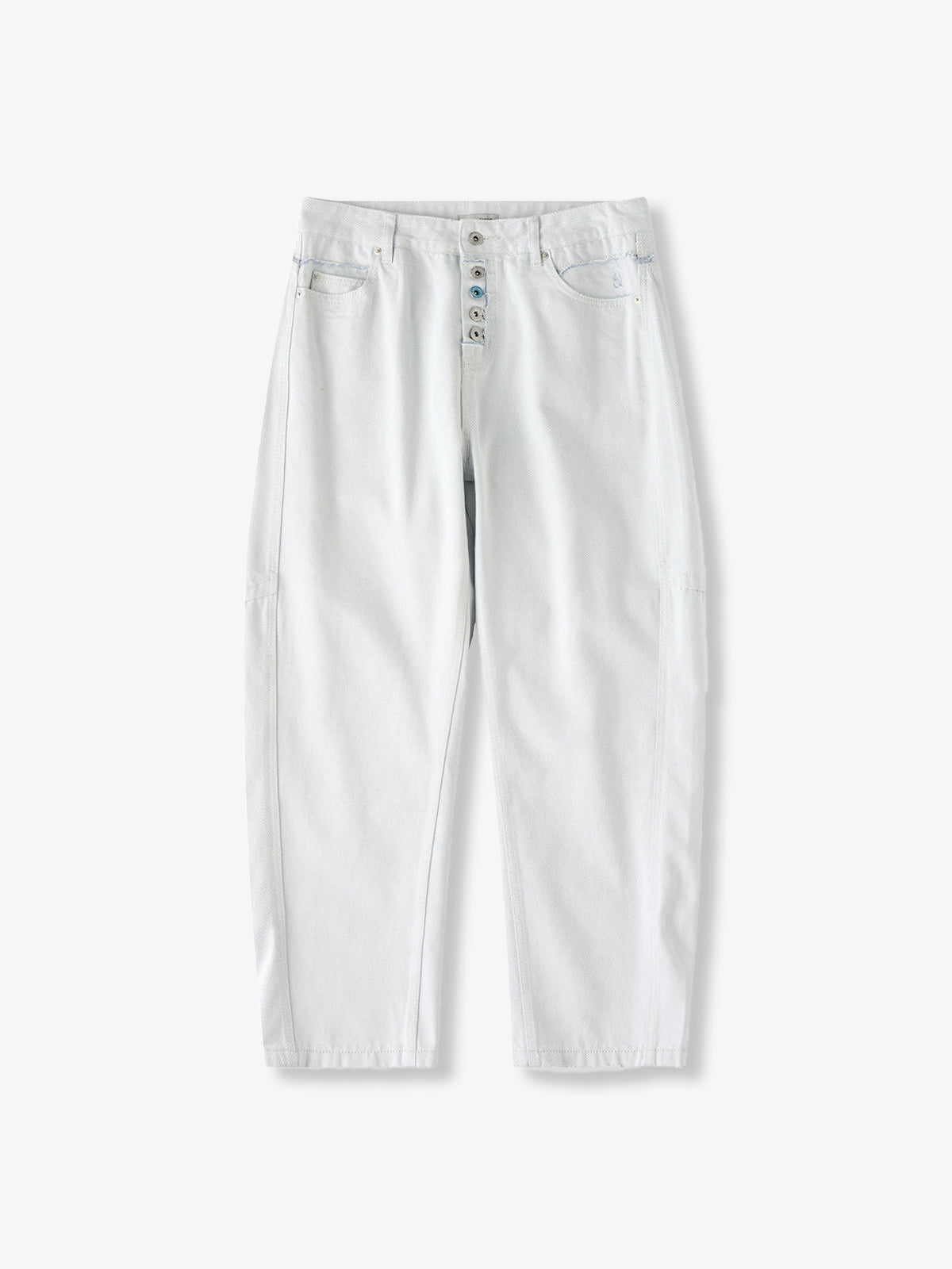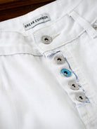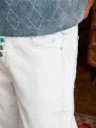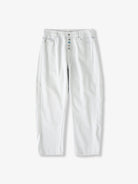 Distressed and Fringed White Denim Pants with Contrasting Button Fly