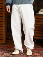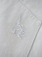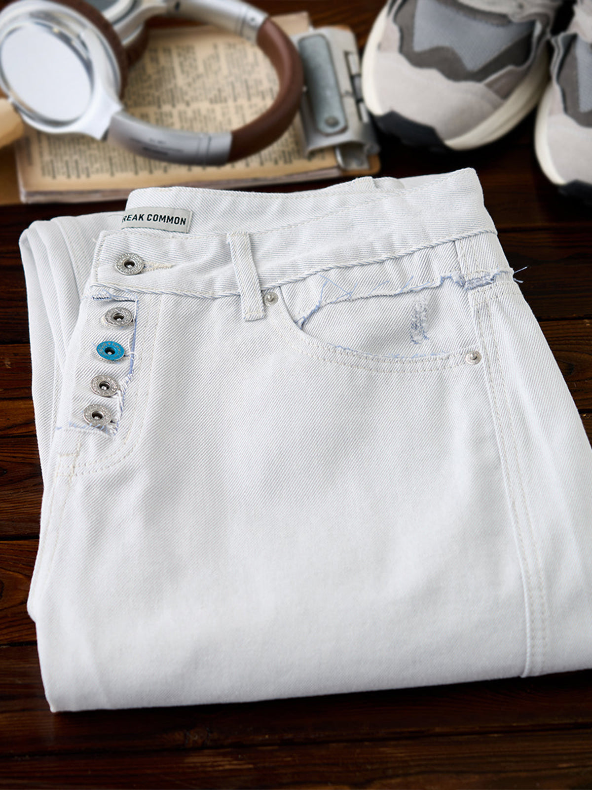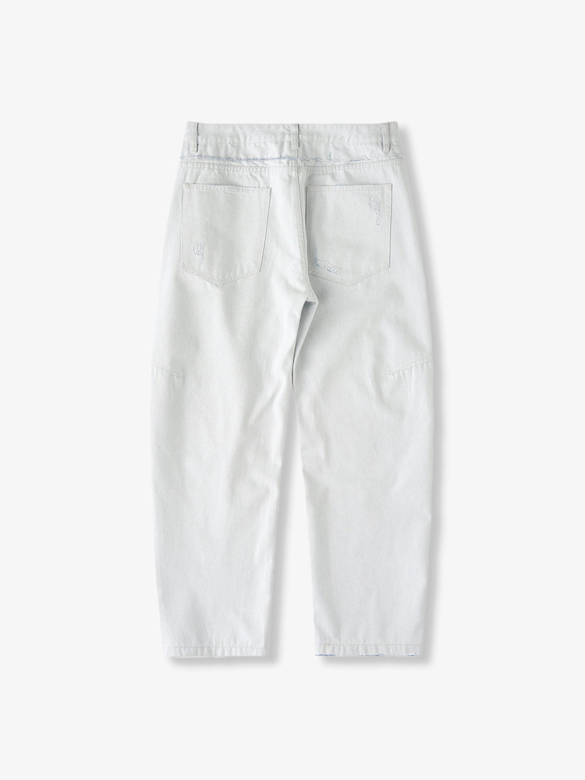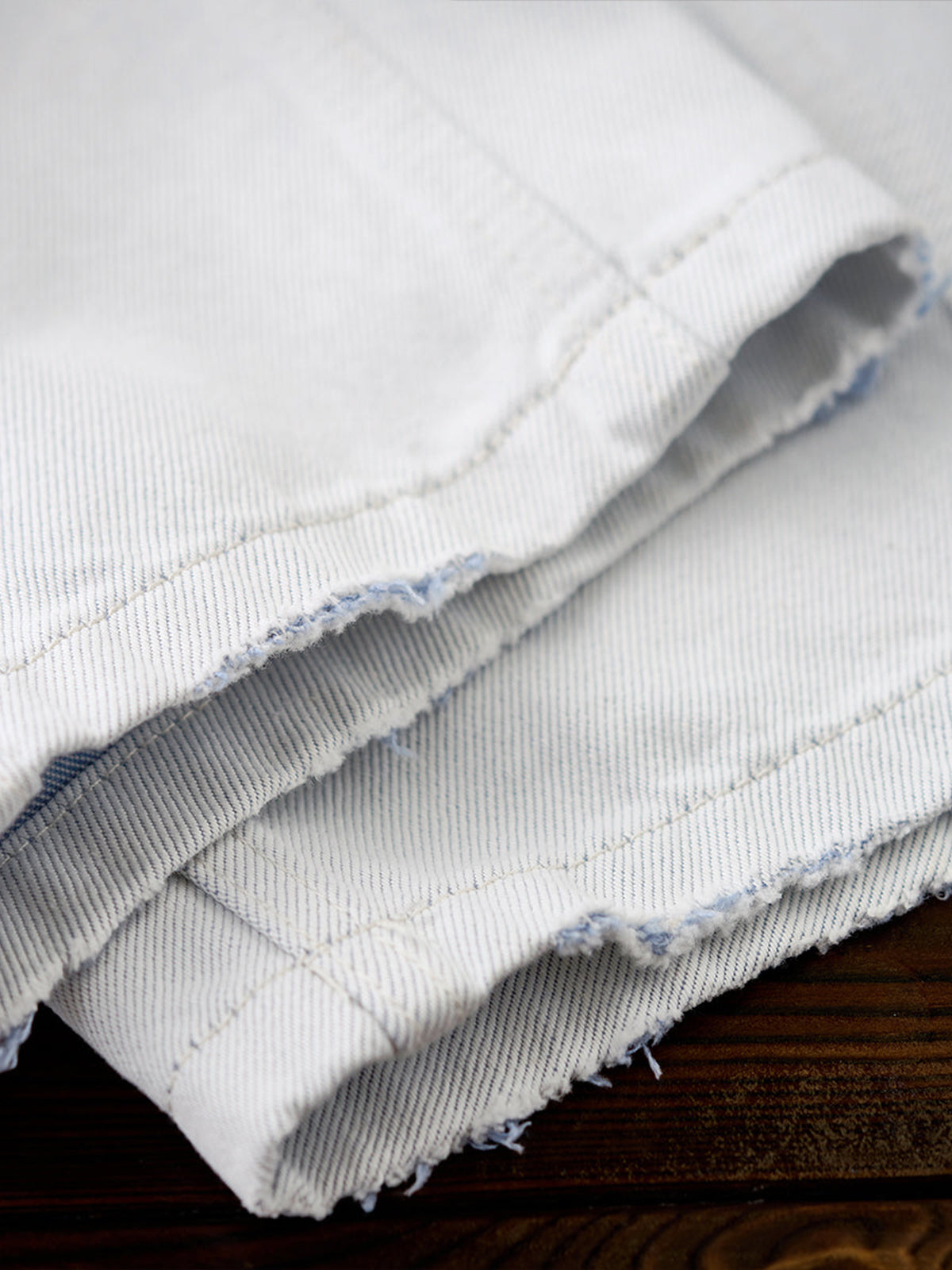 Distressed and Fringed White Denim Pants with Contrasting Button Fly
