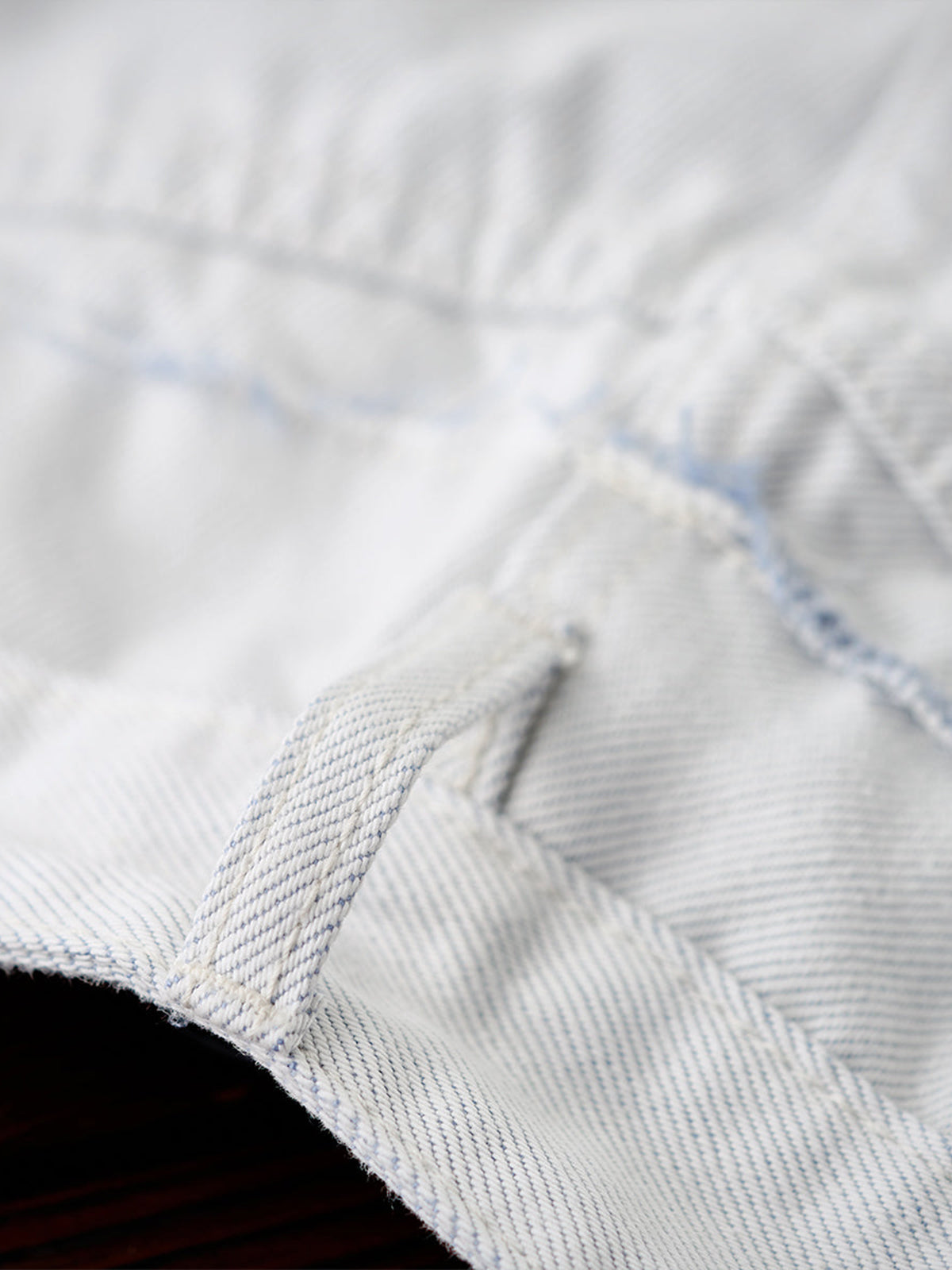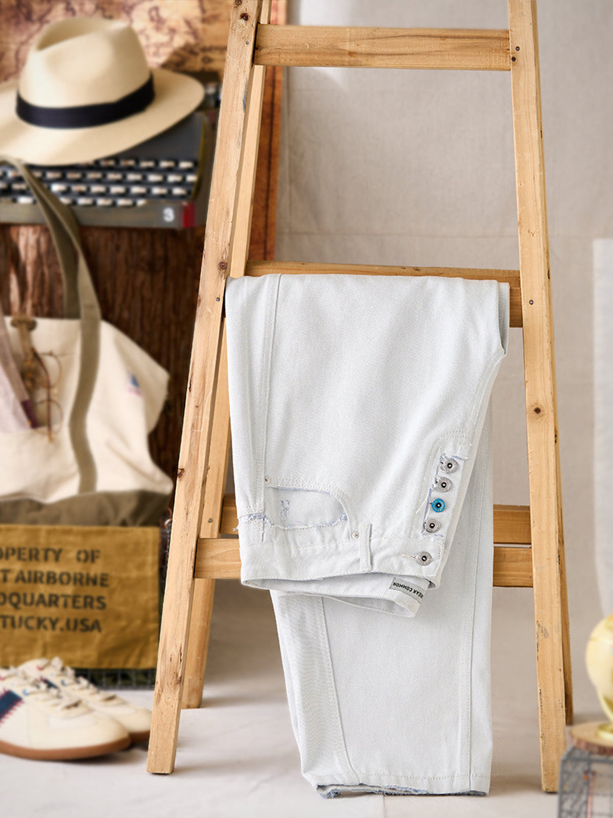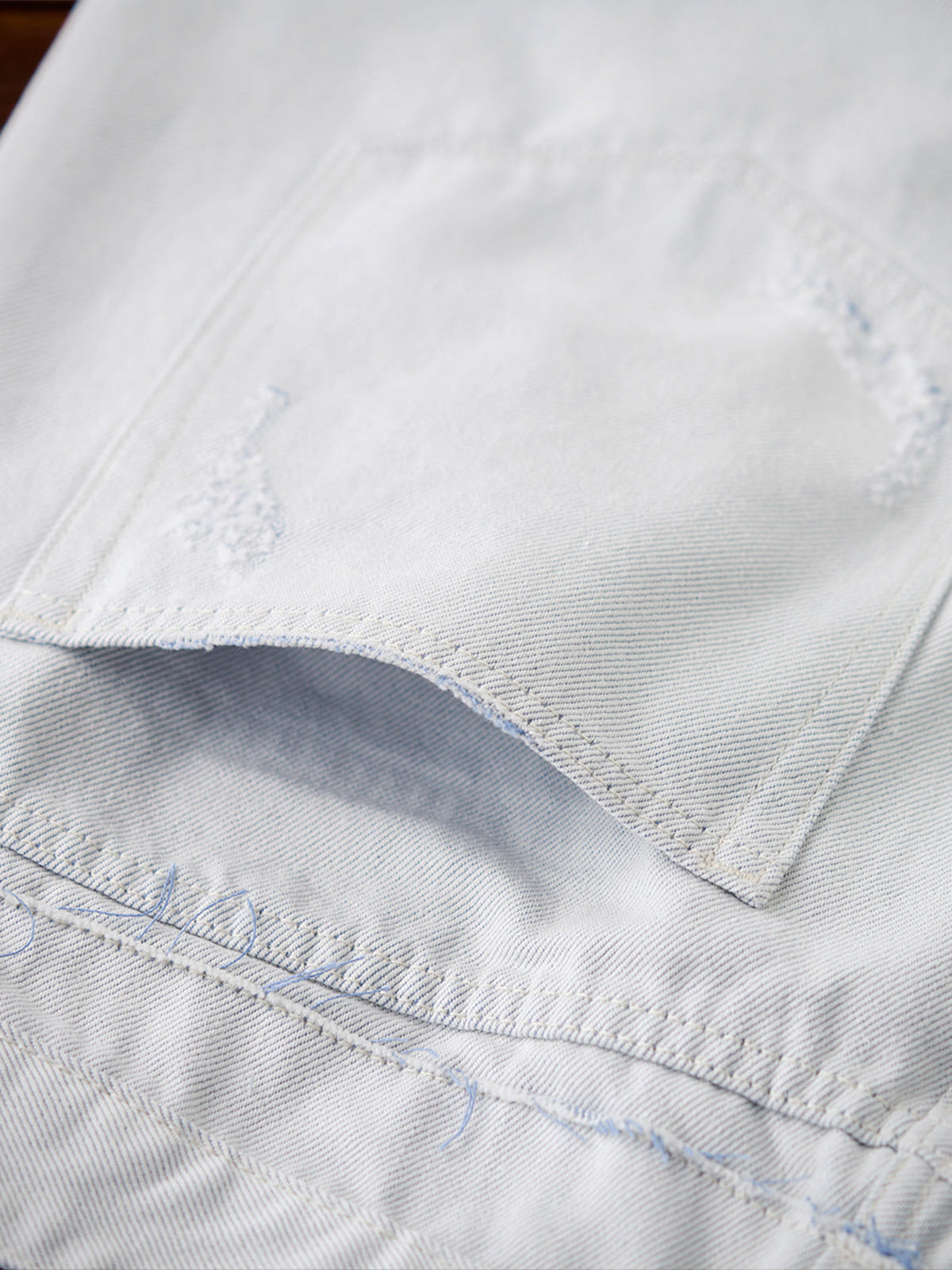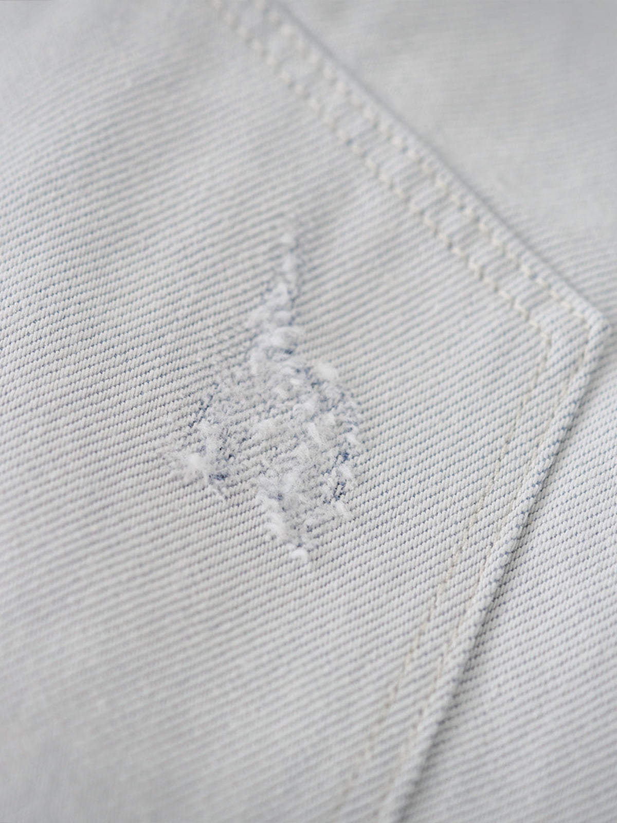 Distressed and Fringed White Denim Pants with Contrasting Button Fly