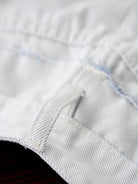 Bold distressed processing and fringe details catch the eye, creating an edgy look on these white denim pants. The waist belt area features fringe processing, adding dynamic detail and personality. Additionally, the button fly with contrasting buttons serves as an accent, demonstrating attention to detail in the design. With this carefully crafted design, simply pairing these pants with a simple top completes your style. Recommended for casual wear as well as fashionable, mode-inspired outfits.