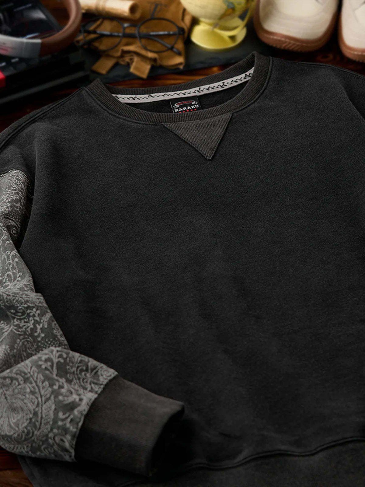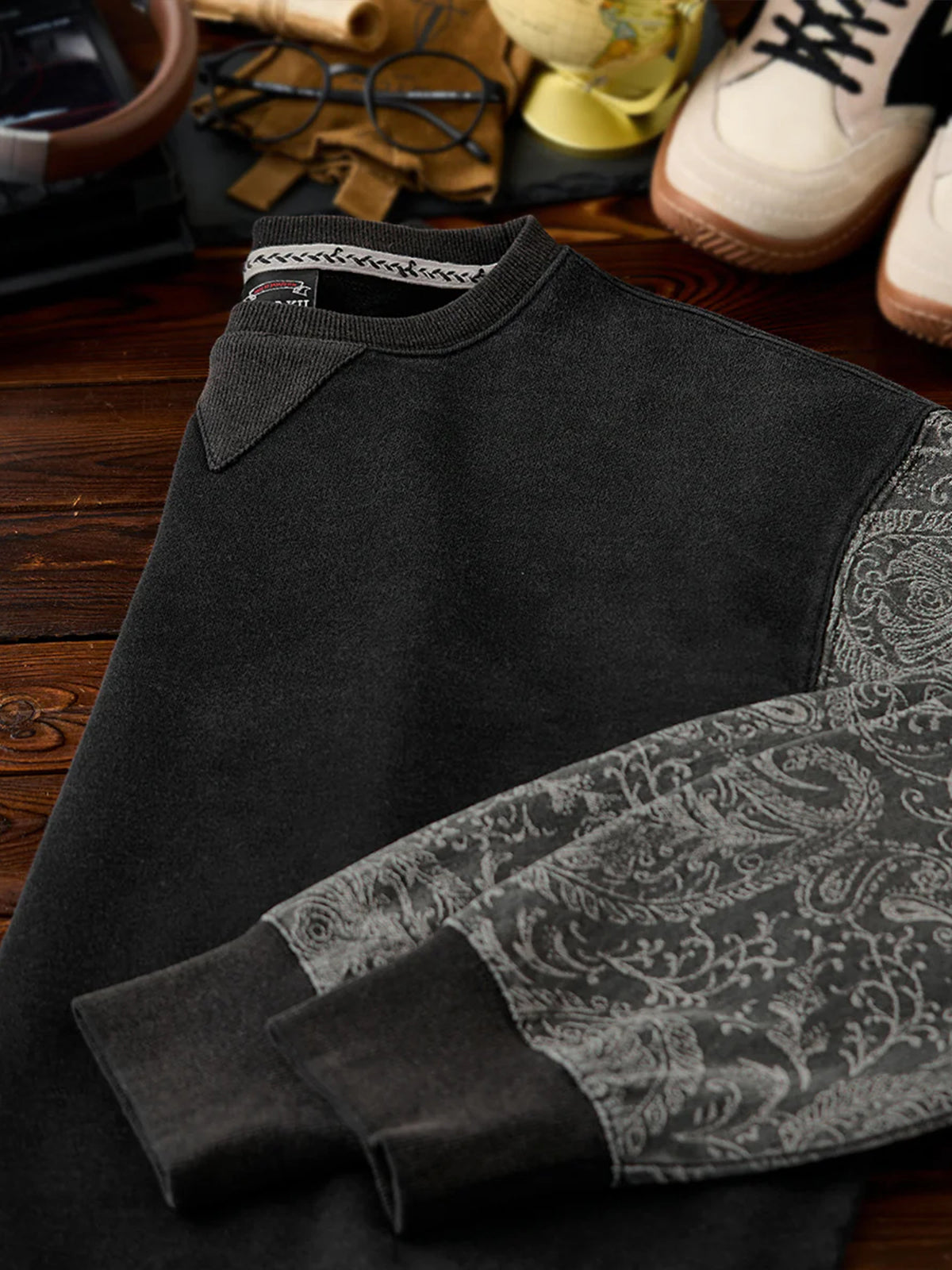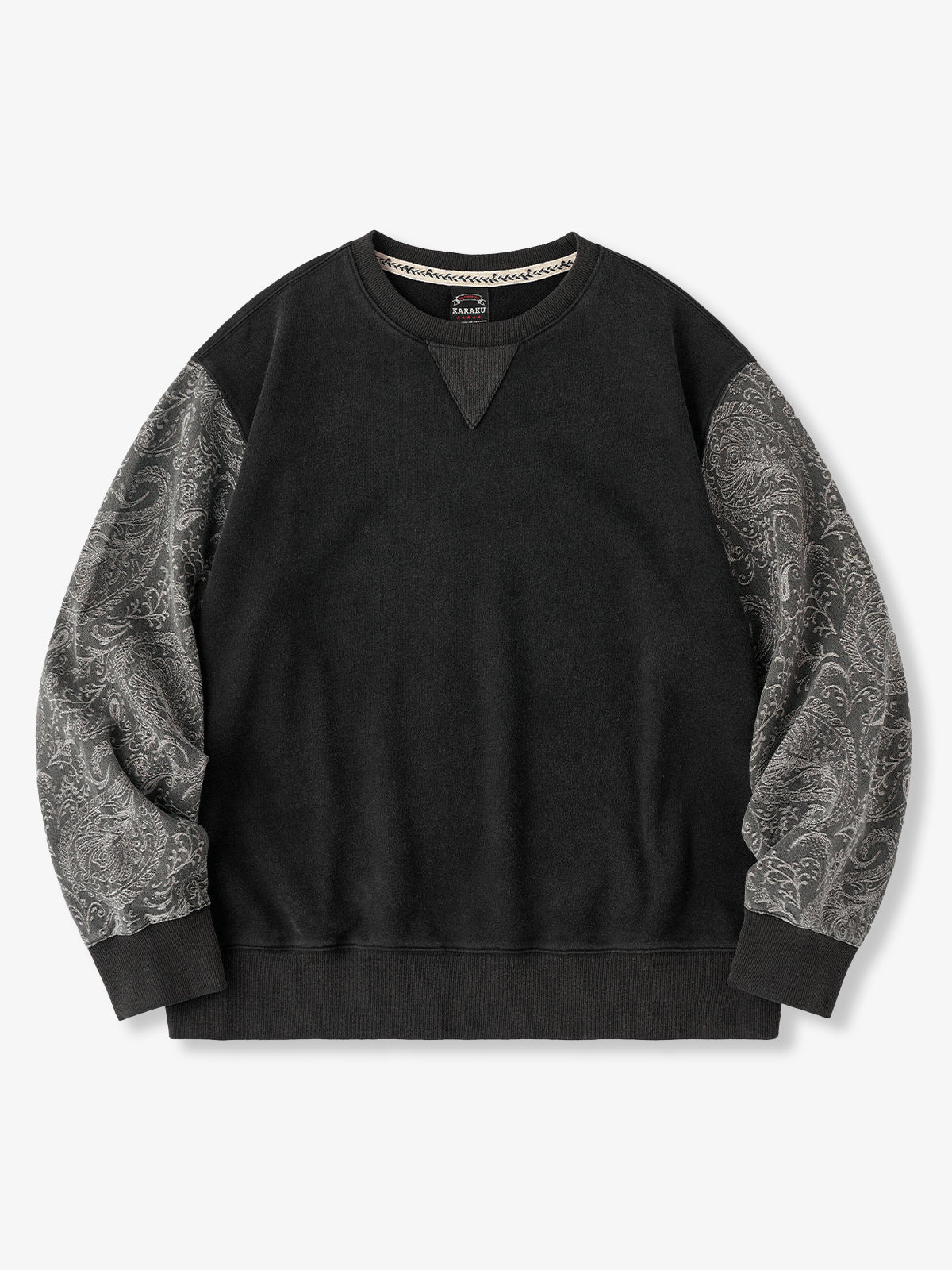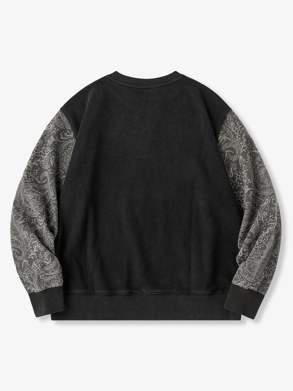 Washed Sweatshirt with Paisley Denim Sleeves & V-Gusset Detail